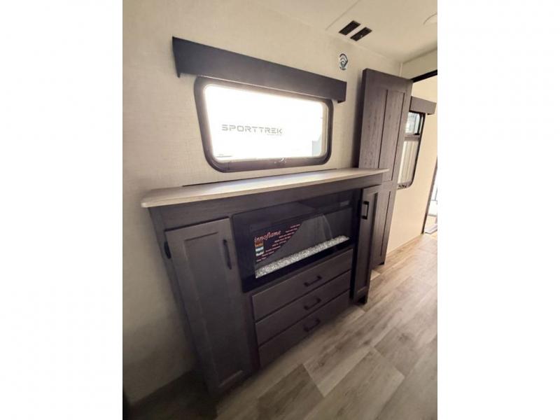 An elegant design and new features come with every one of these Venture RV SportTrek Touring Edition travel trailers! The NXG Huck bolt frame holds these units together and a walkable roof covers them. Heads will turn down the highway and at the campsite with an upgraded graphics package and a painted fiberglass front cap with integrated LED light. The exterior pass-through storage area has slam latch baggage doors with magnetic catches so you don't have to worry about them closing on you and a motion activated light to see your items clearly even at night. Luxury abounds throughout these units, especially with the mandatory Interior Luxury package which comes with solid surface kitchen countertops, designer valances with fabric nightshades, two 30" frameless fireplaces, and Beauflor wood plank flooring that is easy to clean. Come find your favorite model today!