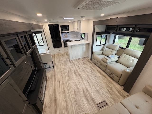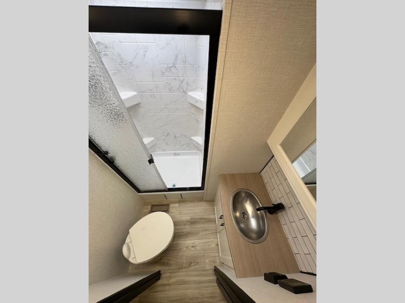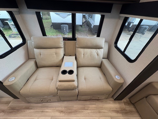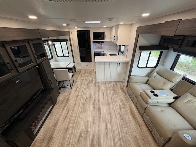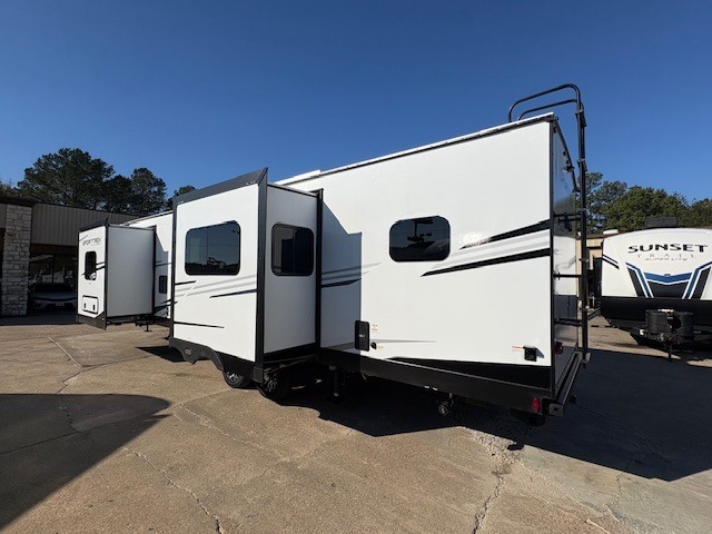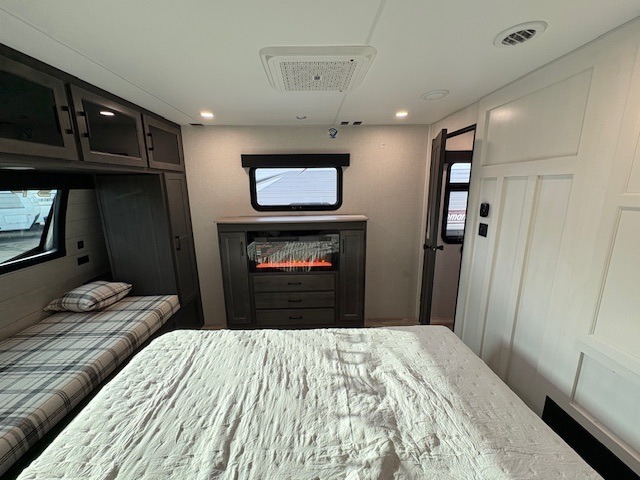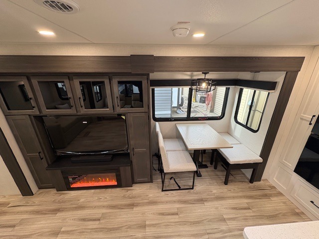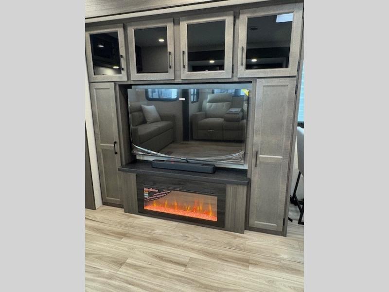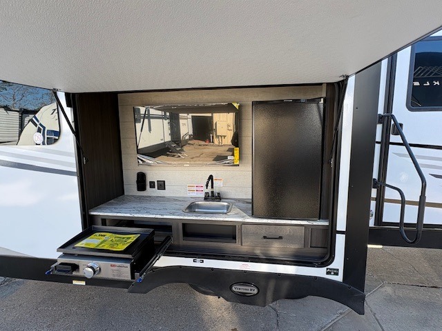 The chef will feel right at home cooking in the rear kitchen with all of the countertop space in this travel trailer! They can even head outside to breathe in some fresh air while cooking at the exterior campfire café with a refrigerator, a sink with countertop space, and a griddle. Relax each night in the middle living area with the 64" sofa and the slide that has theater seating with USB charging across from the entertainment center with a TV and 30" frameless fireplace. When you're ready to wind down your nights, take a hot shower in the full bathroom with the 30" x 36" shower then head to the front private bedroom and either read a book at the window seat or lay in the 70" x 80" sleep tight king bed slide while watching a movie with the TV or watch the 30" frameless fireplace!