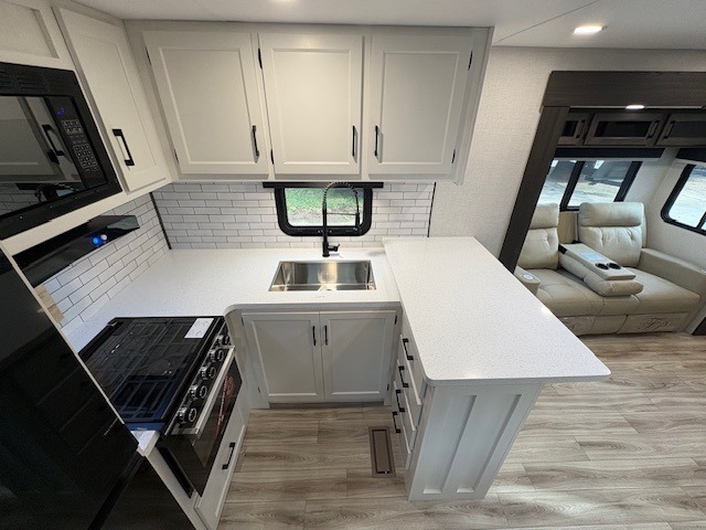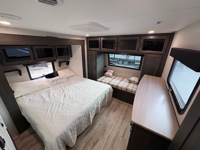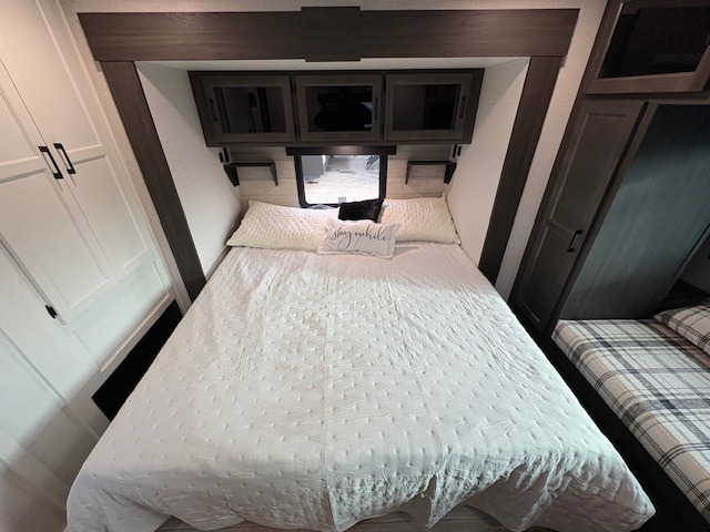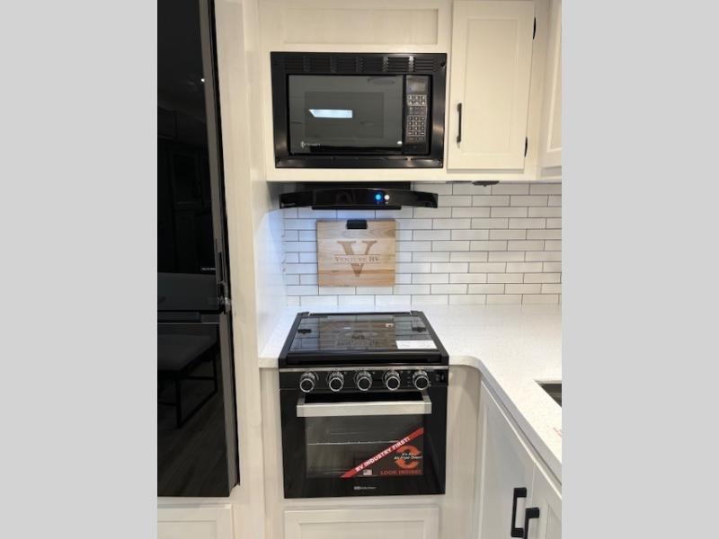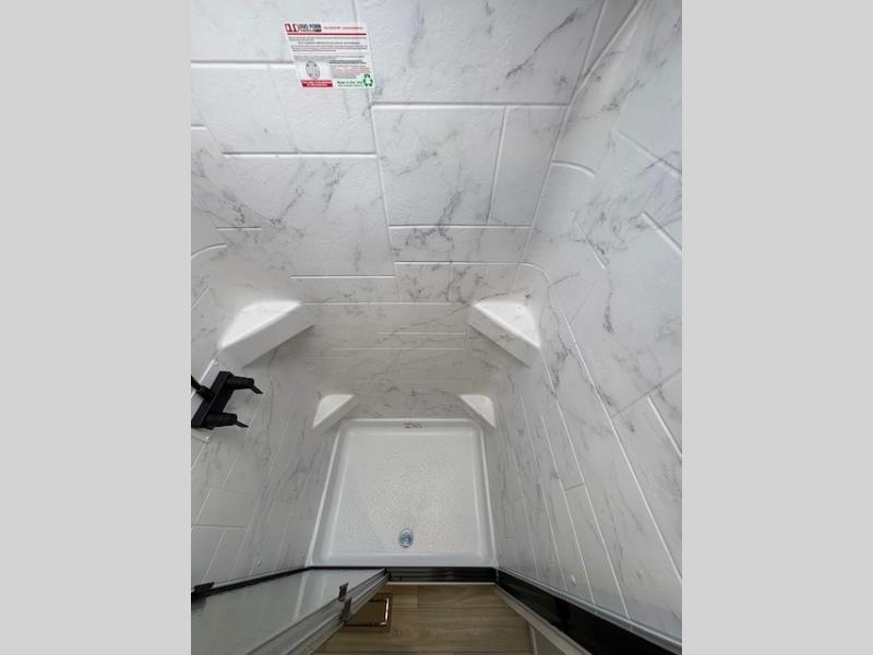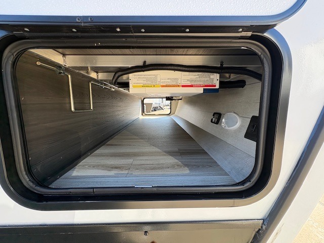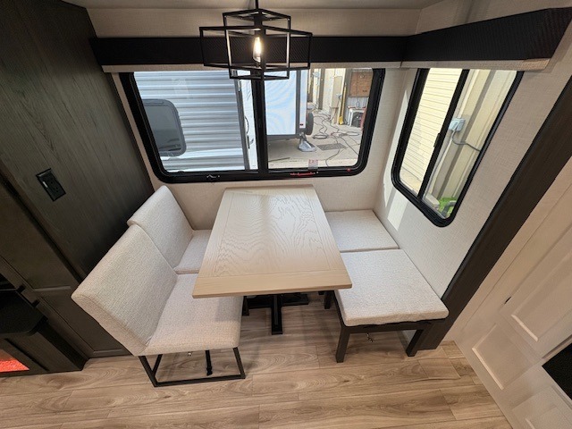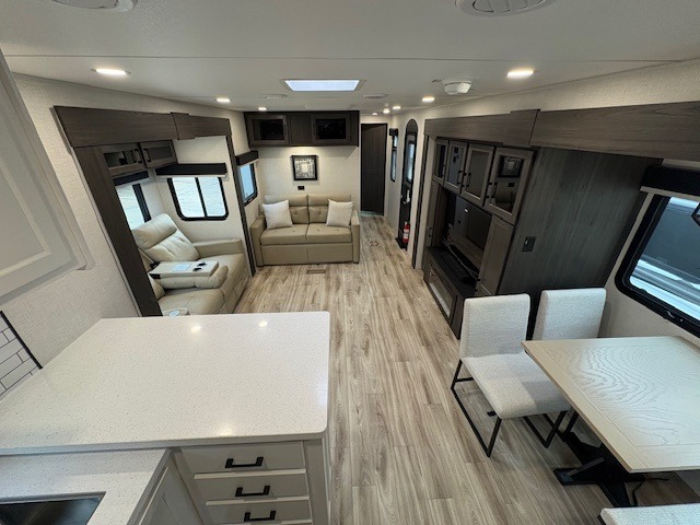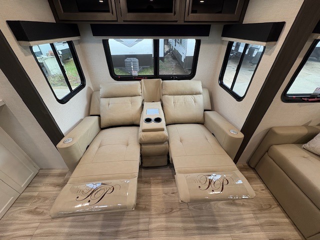 The chef will feel right at home cooking in the rear kitchen with all of the countertop space in this travel trailer! They can even head outside to breathe in some fresh air while cooking at the exterior campfire café with a refrigerator, a sink with countertop space, and a griddle. Relax each night in the middle living area with the 64" sofa and the slide that has theater seating with USB charging across from the entertainment center with a TV and 30" frameless fireplace. When you're ready to wind down your nights, take a hot shower in the full bathroom with the 30" x 36" shower then head to the front private bedroom and either read a book at the window seat or lay in the 70" x 80" sleep tight king bed slide while watching a movie with the TV or watch the 30" frameless fireplace!