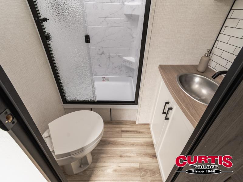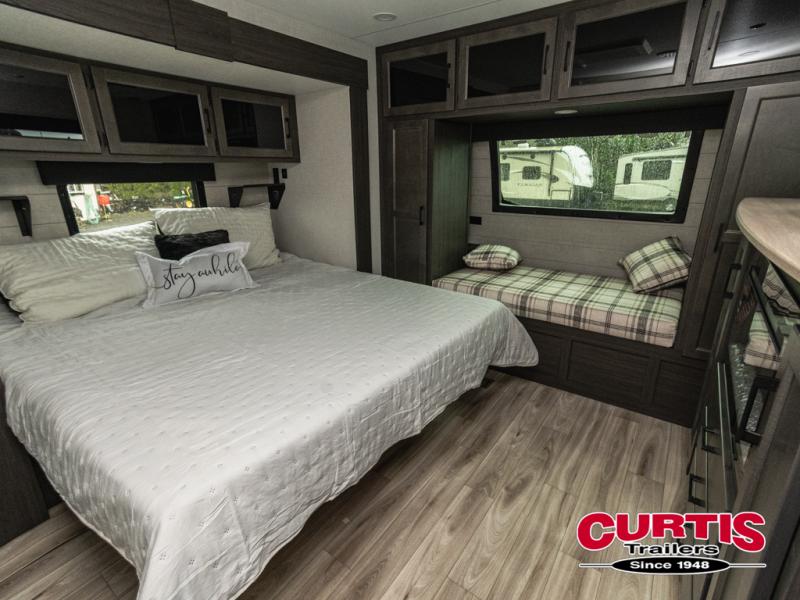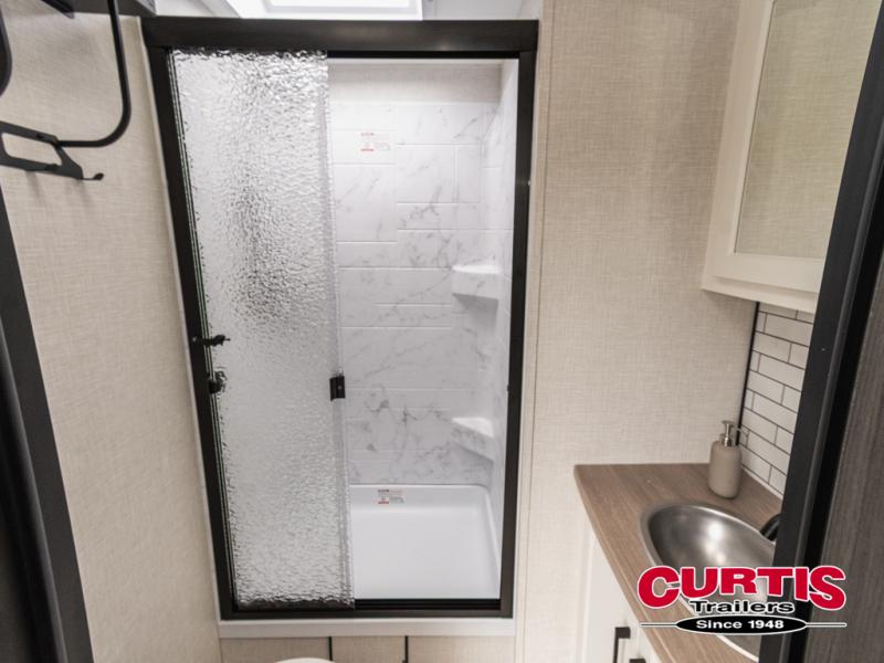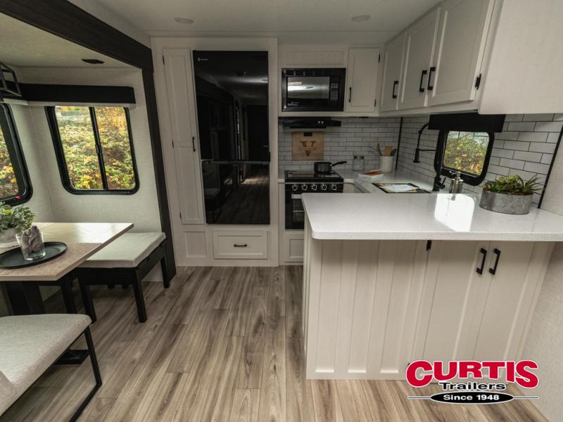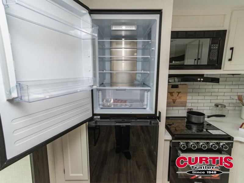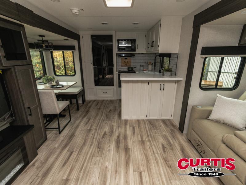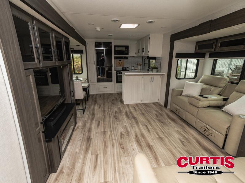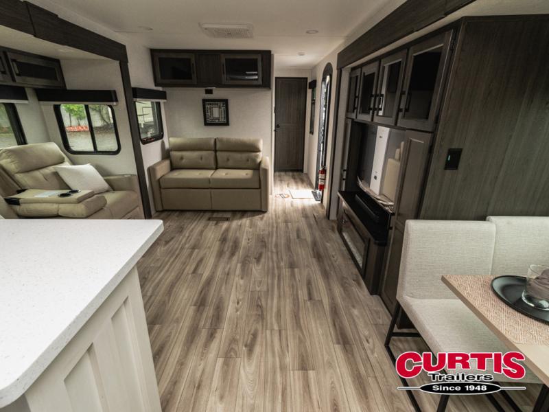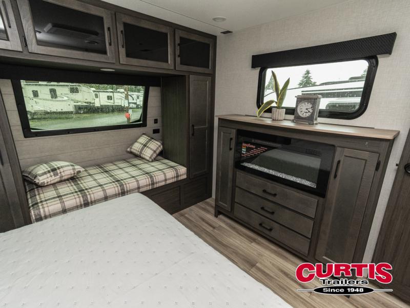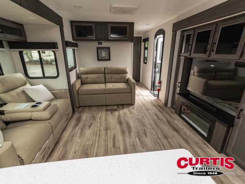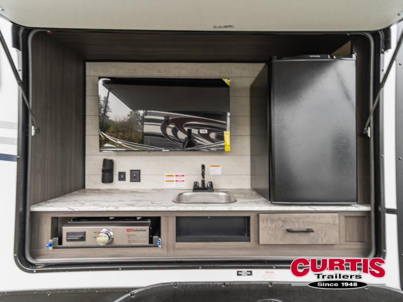 The chef will feel right at home cooking in the rear kitchen with all of the countertop space in this travel trailer! They can even head outside to breathe in some fresh air while cooking at the exterior campfire café with a refrigerator, a sink with countertop space, and a griddle. Relax each night in the middle living area with the 64" sofa and the slide that has theater seating with USB charging across from the entertainment center with a TV and 30" frameless fireplace. When you're ready to wind down your nights, take a hot shower in the full bathroom with the 30" x 36" shower then head to the front private bedroom and either read a book at the window seat or lay in the 70" x 80" sleep tight king bed slide while watching a movie with the TV or watch the 30" frameless fireplace!