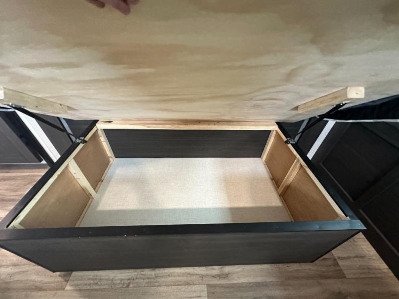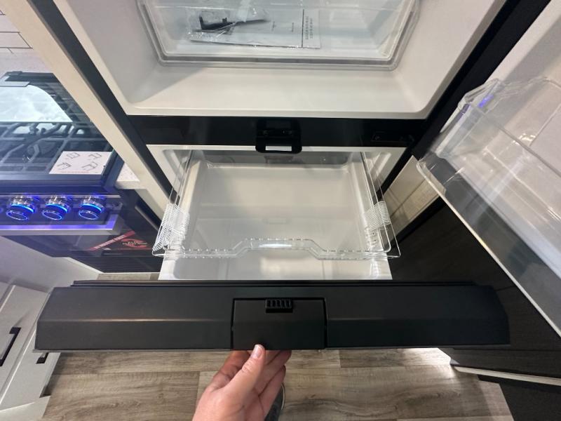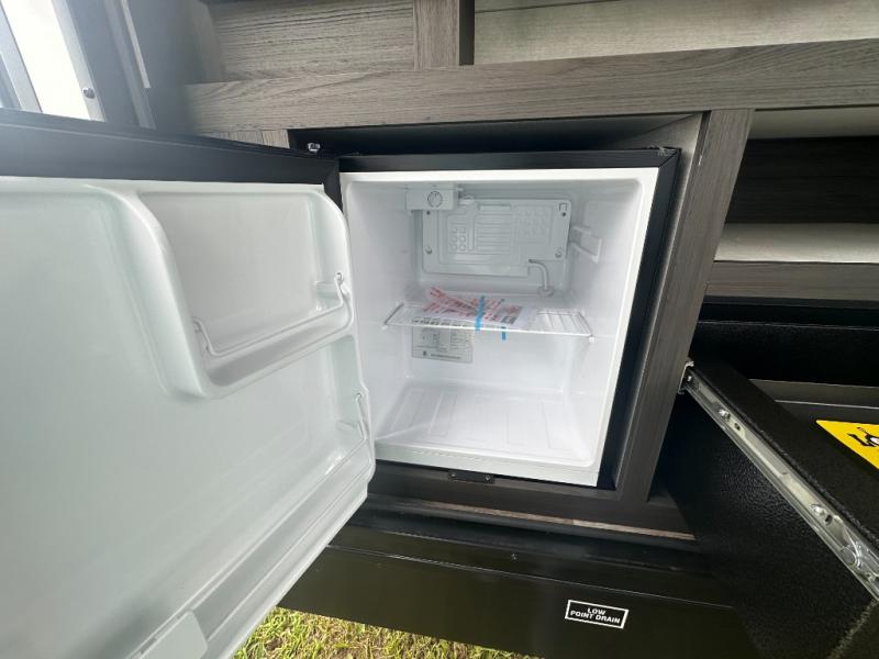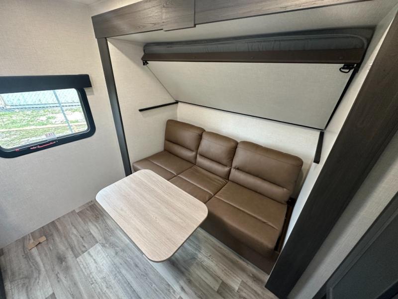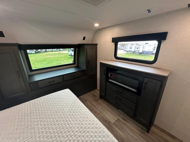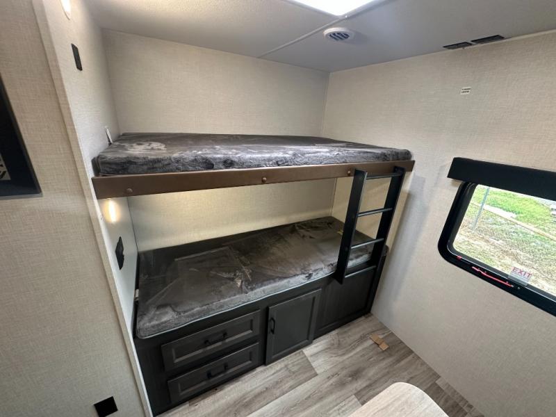 The whole family can camp together in this travel trailer! It features a rear private bunkhouse with a 28" x 70" top bunk above a 40" x 70" bottom bunk, a closet, and a 28" x 73" flip up top bunk above a 70" sofa with table slide. One of the dual entry doors leads directly into the half bathroom with fold-out aluminum steps so you can get back to having fun faster. The chef can prepare their best meals for the crew either indoors with the three burner cooktop or at the exterior campfire café with a 40" TV/DVD/speakers to entertain them while they cook. Everyone can gather together at the Sit N' Slide table and 70" tri-fold sofa across from the entertainment center with a fireplace for a cozy evening. The dual entry bathroom is easy to access, especially for those staying in the front private bedroom. You even have a coat closet next to the main entrance to limit the clutter!