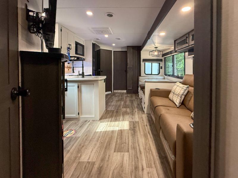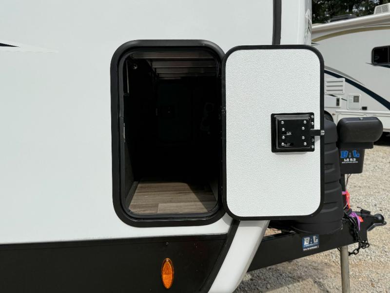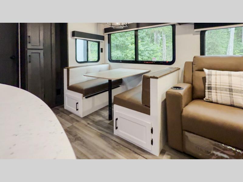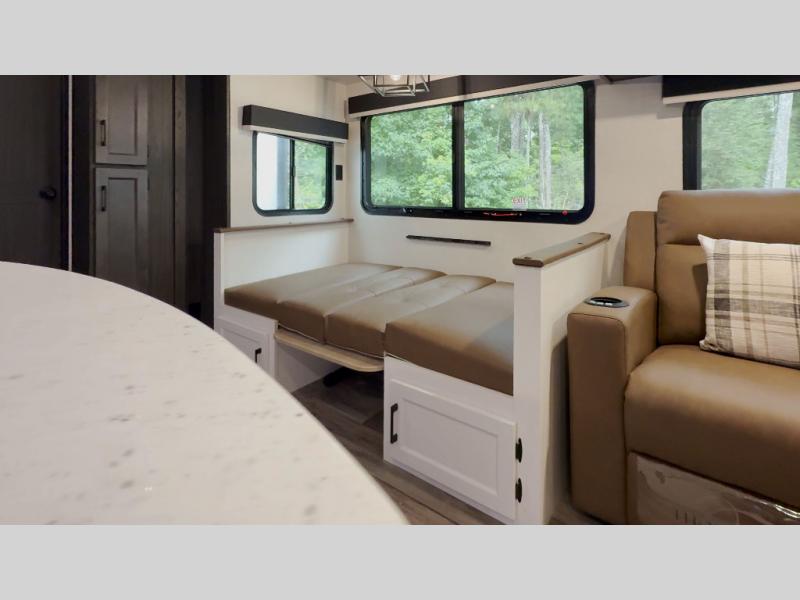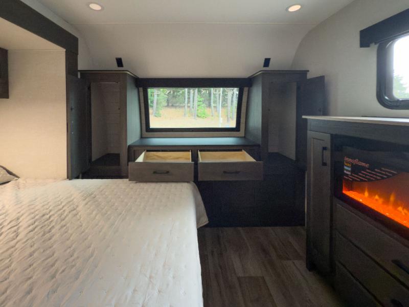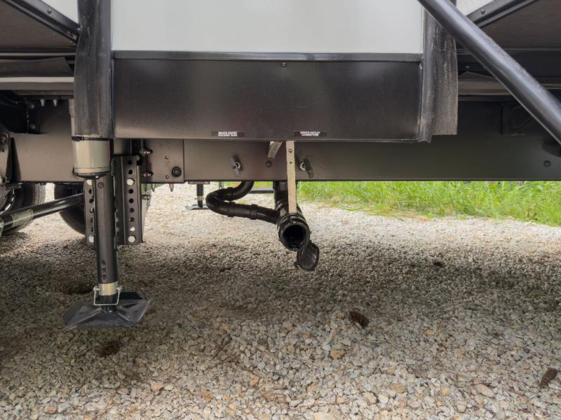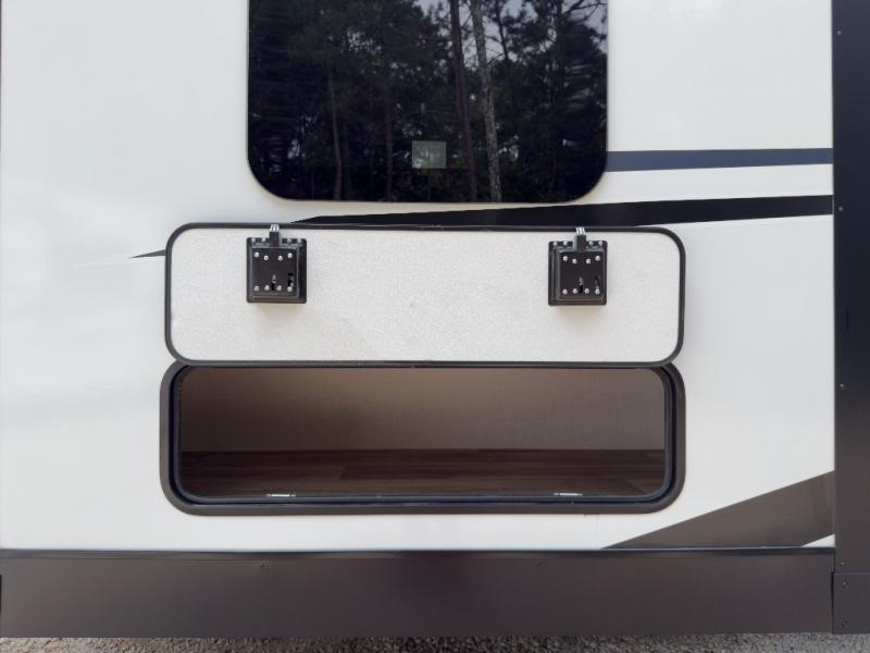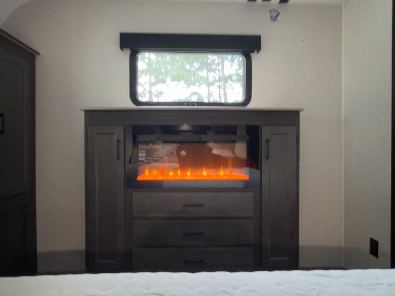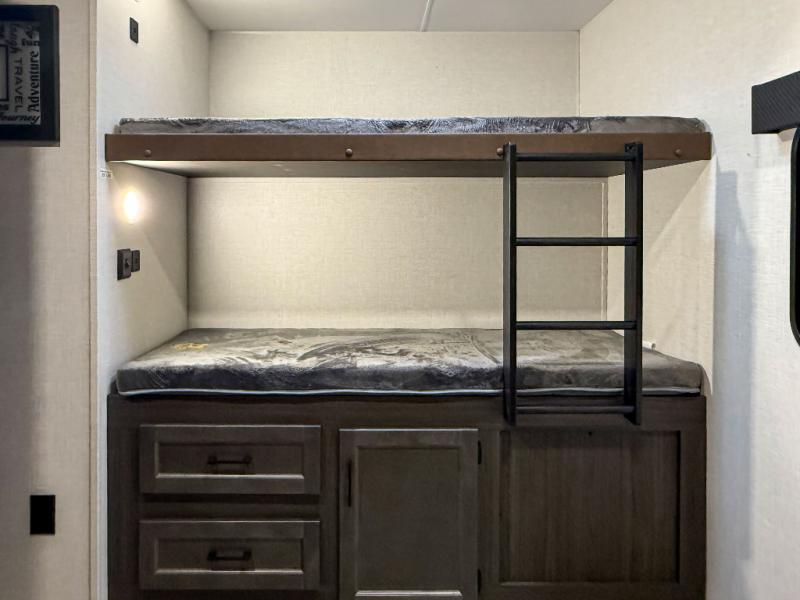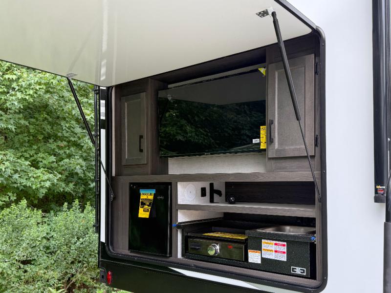 The whole family can camp together in this travel trailer! It features a rear private bunkhouse with a 28" x 70" top bunk above a 40" x 70" bottom bunk, a closet, and a 28" x 73" flip up top bunk above a 70" sofa with table slide. One of the dual entry doors leads directly into the half bathroom with fold-out aluminum steps so you can get back to having fun faster. The chef can prepare their best meals for the crew either indoors with the three burner cooktop or at the exterior campfire café with a 40" TV/DVD/speakers to entertain them while they cook. Everyone can gather together at the Sit N' Slide table and 70" tri-fold sofa across from the entertainment center with a fireplace for a cozy evening. The dual entry bathroom is easy to access, especially for those staying in the front private bedroom. You even have a coat closet next to the main entrance to limit the clutter!