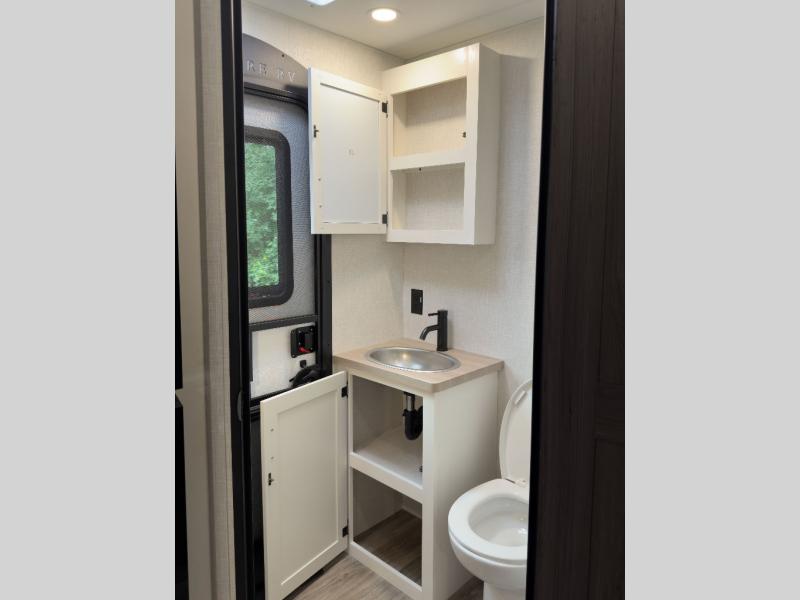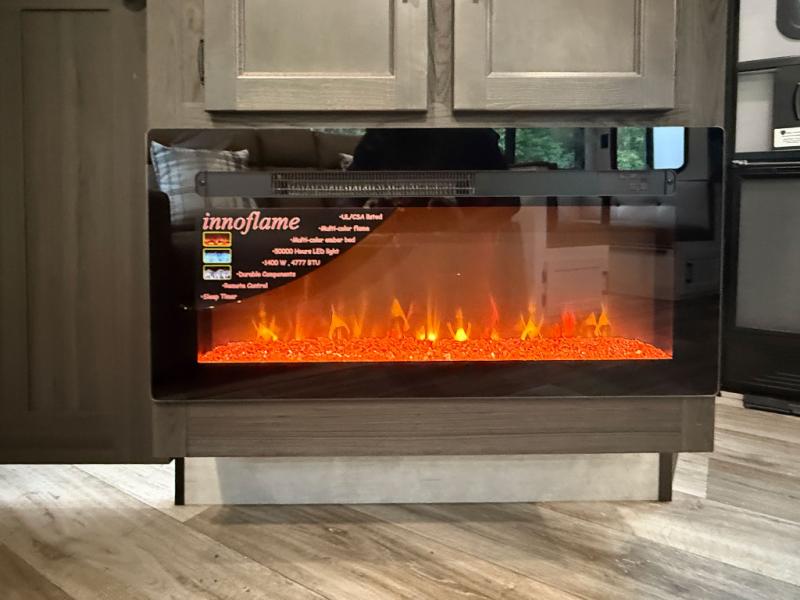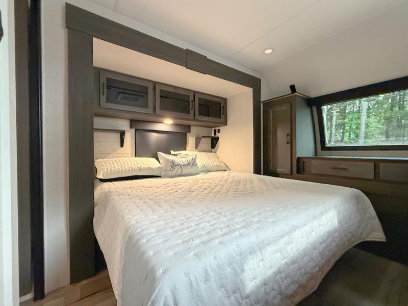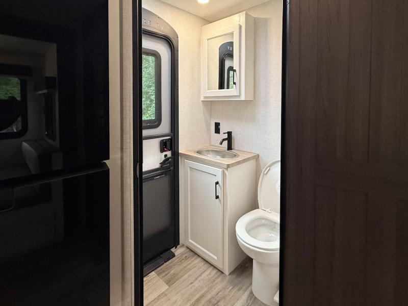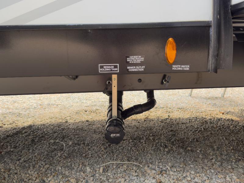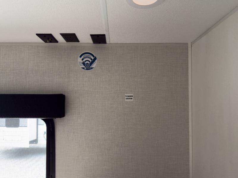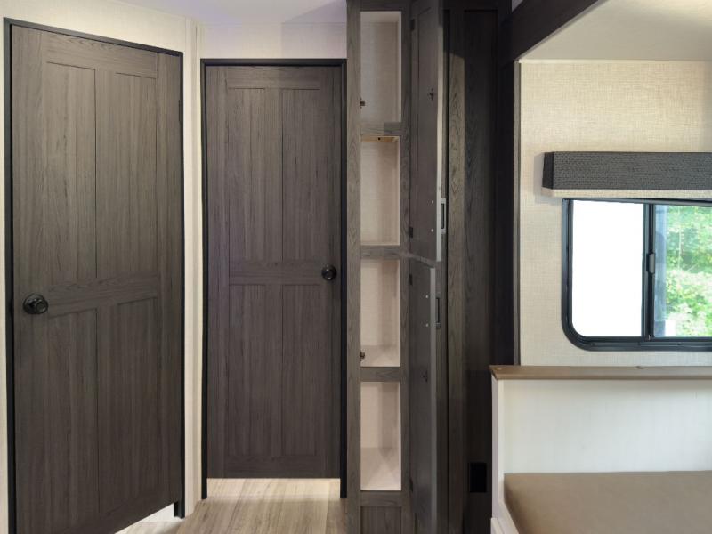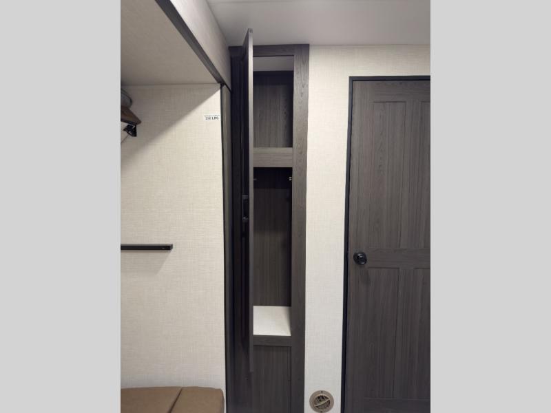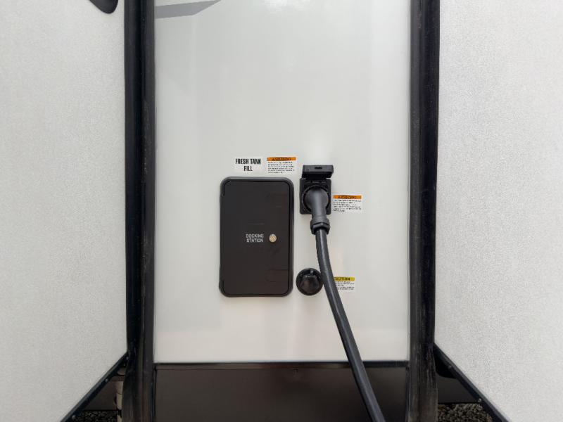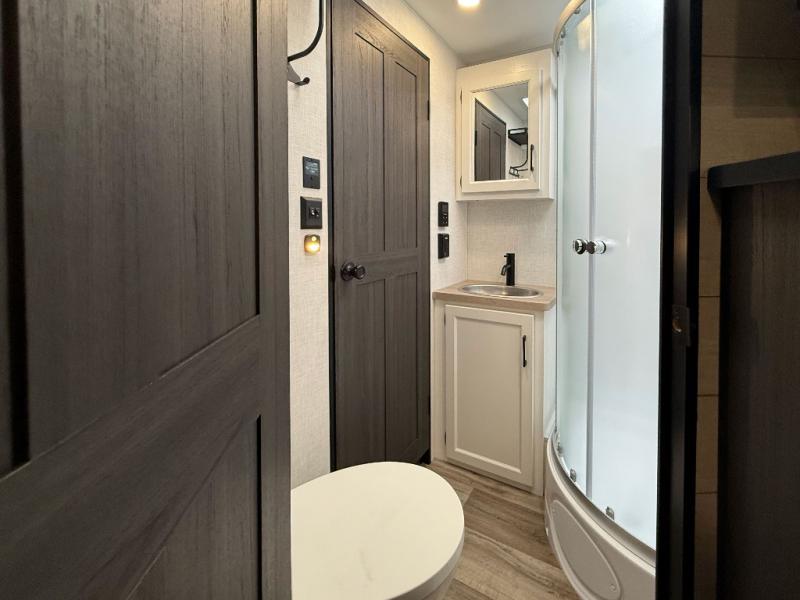 The whole family can camp together in this travel trailer! It features a rear private bunkhouse with a 28" x 70" top bunk above a 40" x 70" bottom bunk, a closet, and a 28" x 73" flip up top bunk above a 70" sofa with table slide. One of the dual entry doors leads directly into the half bathroom with fold-out aluminum steps so you can get back to having fun faster. The chef can prepare their best meals for the crew either indoors with the three burner cooktop or at the exterior campfire café with a 40" TV/DVD/speakers to entertain them while they cook. Everyone can gather together at the Sit N' Slide table and 70" tri-fold sofa across from the entertainment center with a fireplace for a cozy evening. The dual entry bathroom is easy to access, especially for those staying in the front private bedroom. You even have a coat closet next to the main entrance to limit the clutter!