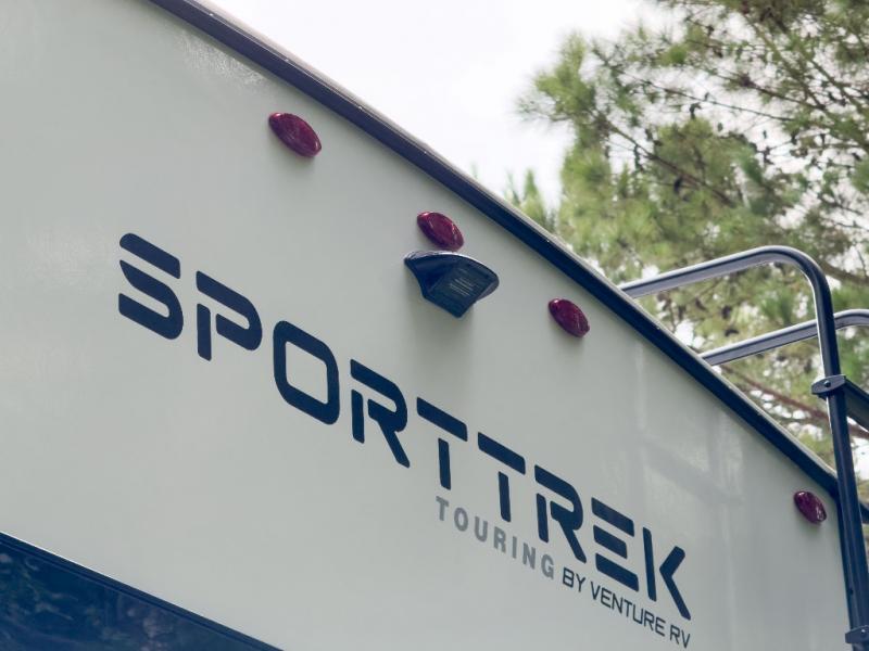 An elegant design and new features come with every one of these Venture RV SportTrek Touring Edition travel trailers! The NXG Huck bolt frame holds these units together and a walkable roof covers them. Heads will turn down the highway and at the campsite with an upgraded graphics package and a painted fiberglass front cap with integrated LED light. The exterior pass-through storage area has slam latch baggage doors with magnetic catches so you don't have to worry about them closing on you and a motion activated light to see your items clearly even at night. Luxury abounds throughout these units, especially with the mandatory Interior Luxury package which comes with solid surface kitchen countertops, designer valances with fabric nightshades, two 30" frameless fireplaces, and Beauflor wood plank flooring that is easy to clean. Come find your favorite model today!