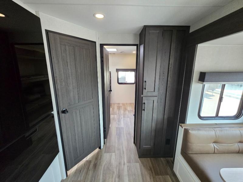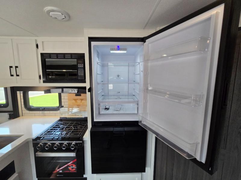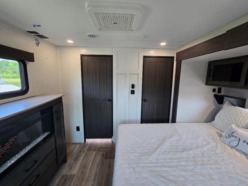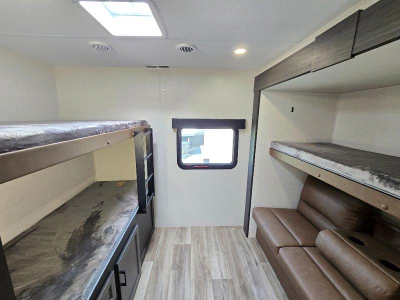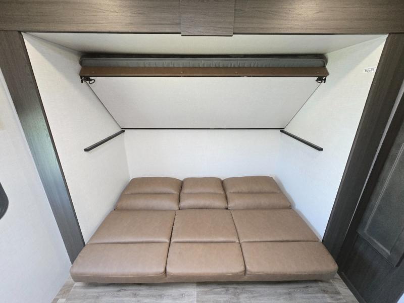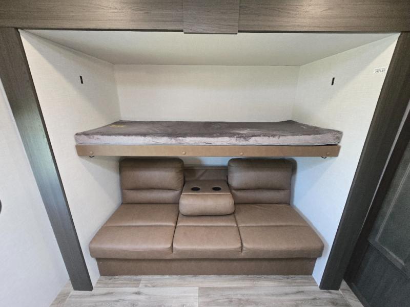 The whole family can camp together in this travel trailer! It features a rear private bunkhouse with a 28" x 70" top bunk above a 40" x 70" bottom bunk, a closet, and a 28" x 73" flip up top bunk above a 70" sofa with table slide. One of the dual entry doors leads directly into the half bathroom with fold-out aluminum steps so you can get back to having fun faster. The chef can prepare their best meals for the crew either indoors with the three burner cooktop or at the exterior campfire café with a 40" TV/DVD/speakers to entertain them while they cook. Everyone can gather together at the Sit N' Slide table and 70" tri-fold sofa across from the entertainment center with a fireplace for a cozy evening. The dual entry bathroom is easy to access, especially for those staying in the front private bedroom. You even have a coat closet next to the main entrance to limit the clutter!