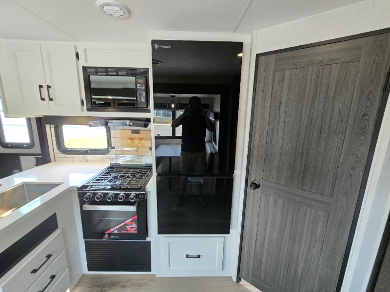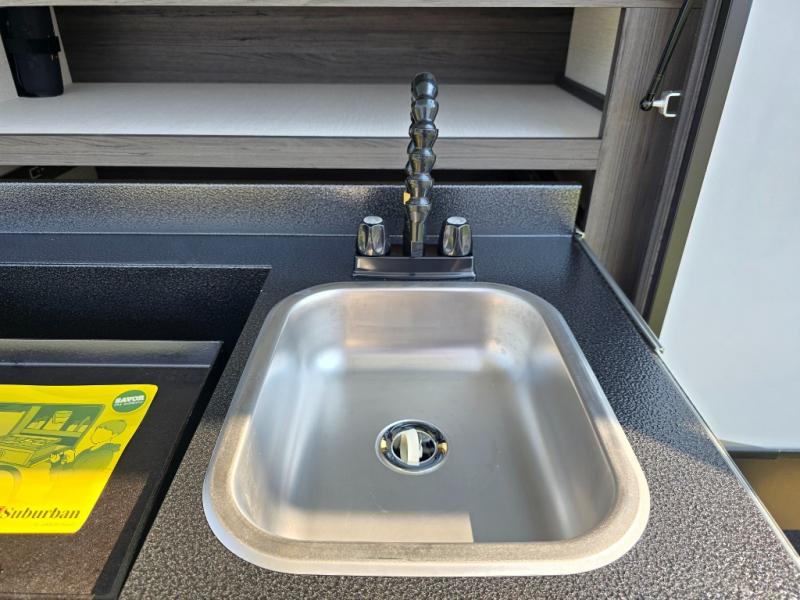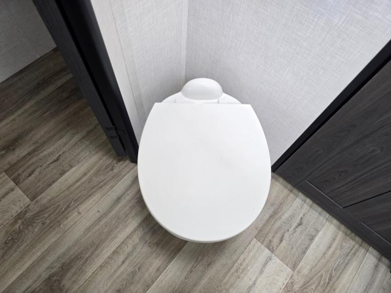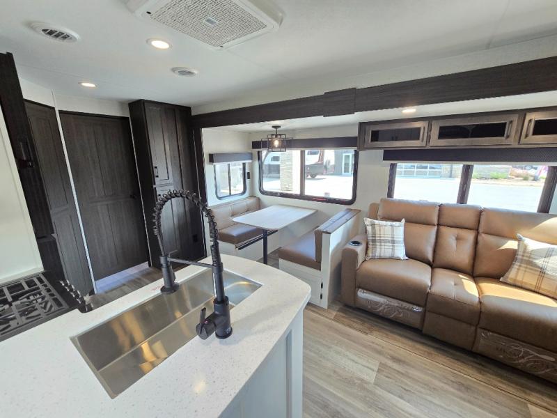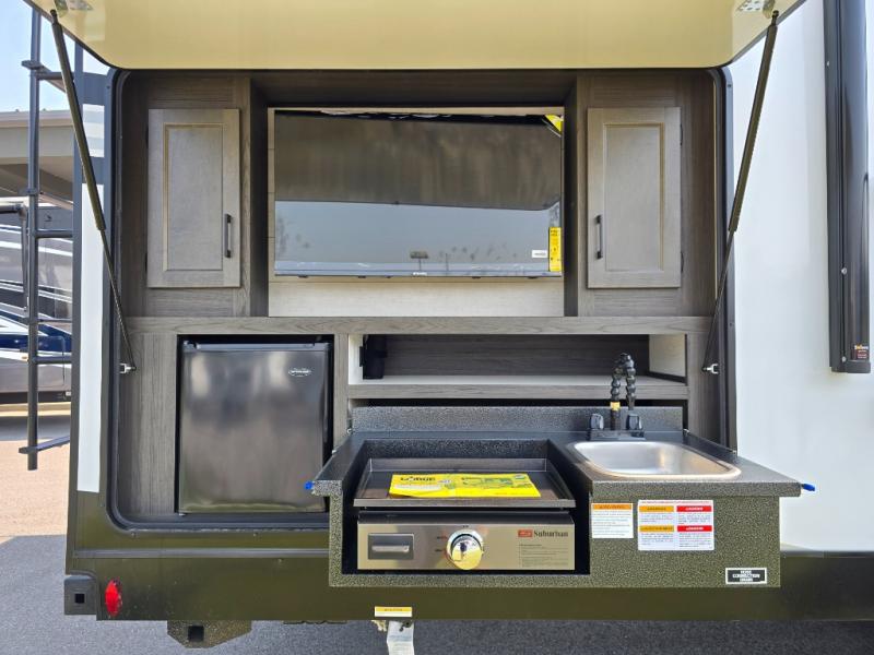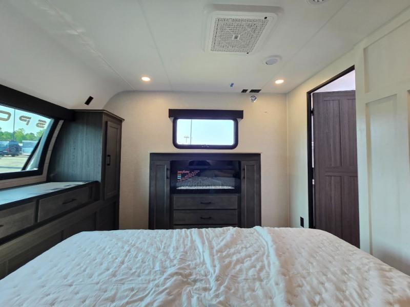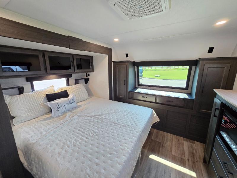 The whole family can camp together in this travel trailer! It features a rear private bunkhouse with a 28" x 70" top bunk above a 40" x 70" bottom bunk, a closet, and a 28" x 73" flip up top bunk above a 70" sofa with table slide. One of the dual entry doors leads directly into the half bathroom with fold-out aluminum steps so you can get back to having fun faster. The chef can prepare their best meals for the crew either indoors with the three burner cooktop or at the exterior campfire café with a 40" TV/DVD/speakers to entertain them while they cook. Everyone can gather together at the Sit N' Slide table and 70" tri-fold sofa across from the entertainment center with a fireplace for a cozy evening. The dual entry bathroom is easy to access, especially for those staying in the front private bedroom. You even have a coat closet next to the main entrance to limit the clutter!