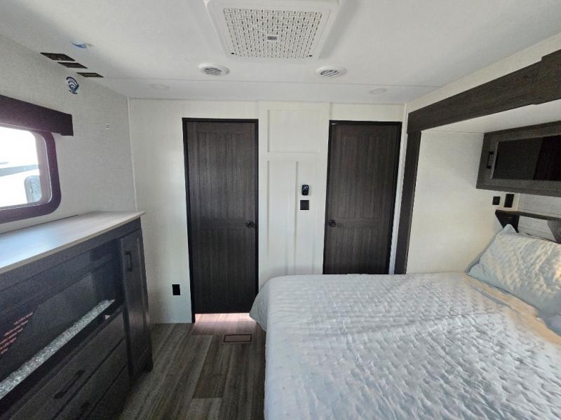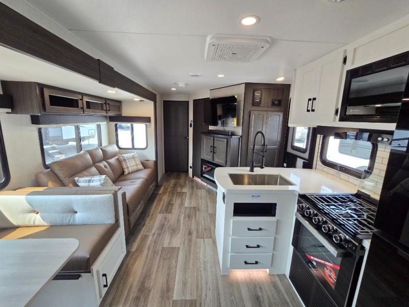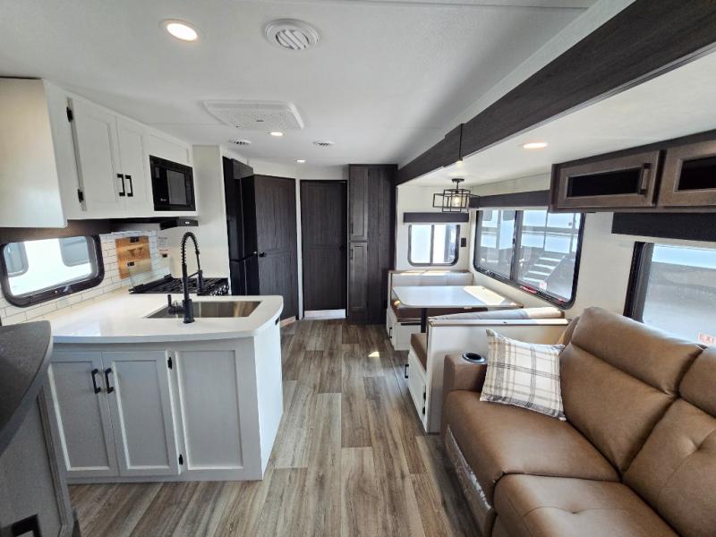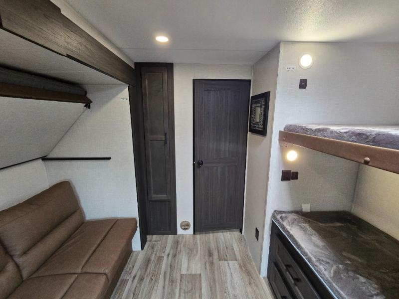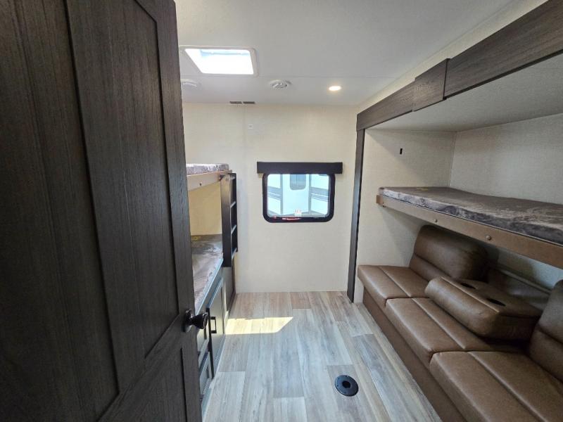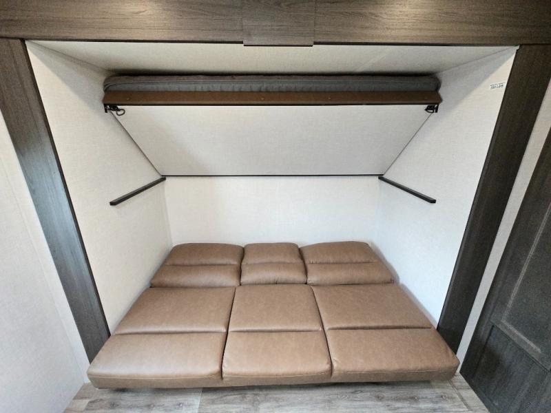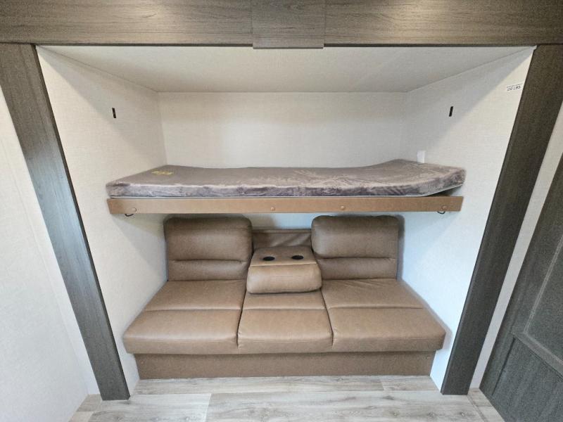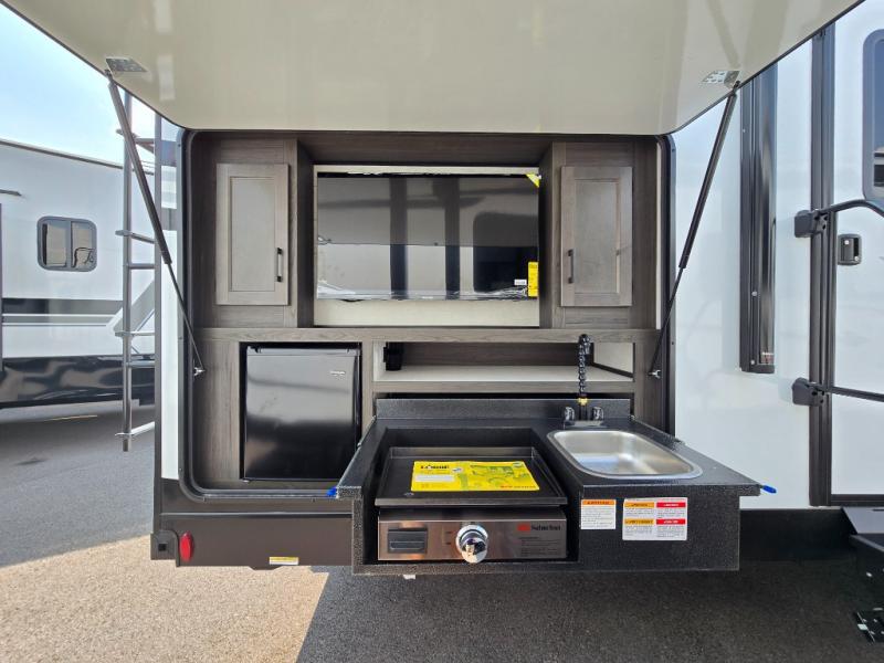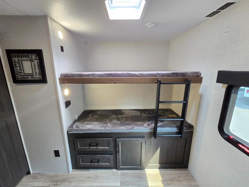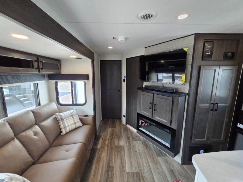 The whole family can camp together in this travel trailer! It features a rear private bunkhouse with a 28" x 70" top bunk above a 40" x 70" bottom bunk, a closet, and a 28" x 73" flip up top bunk above a 70" sofa with table slide. One of the dual entry doors leads directly into the half bathroom with fold-out aluminum steps so you can get back to having fun faster. The chef can prepare their best meals for the crew either indoors with the three burner cooktop or at the exterior campfire café with a 40" TV/DVD/speakers to entertain them while they cook. Everyone can gather together at the Sit N' Slide table and 70" tri-fold sofa across from the entertainment center with a fireplace for a cozy evening. The dual entry bathroom is easy to access, especially for those staying in the front private bedroom. You even have a coat closet next to the main entrance to limit the clutter!