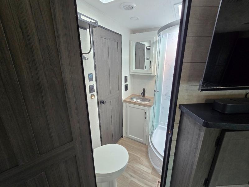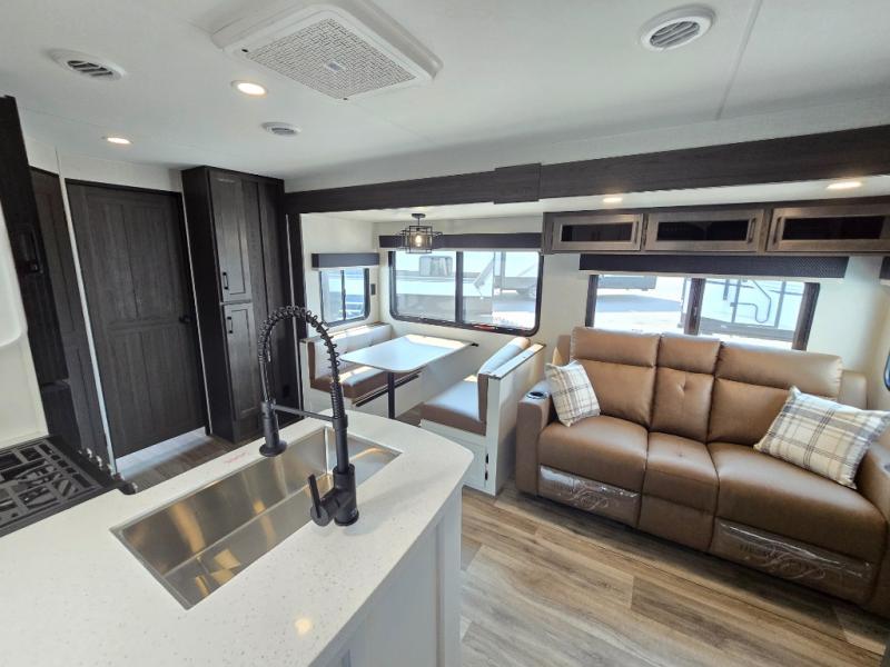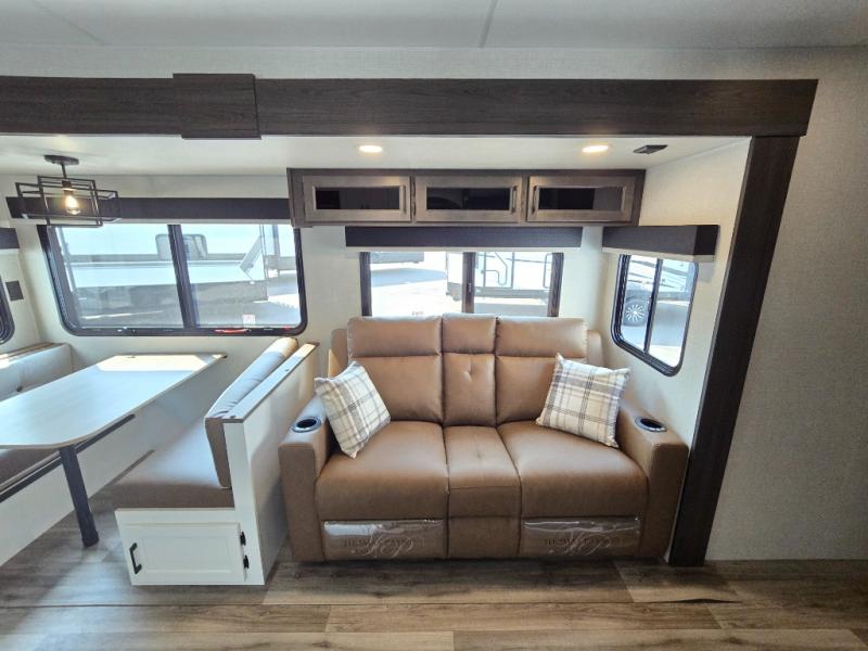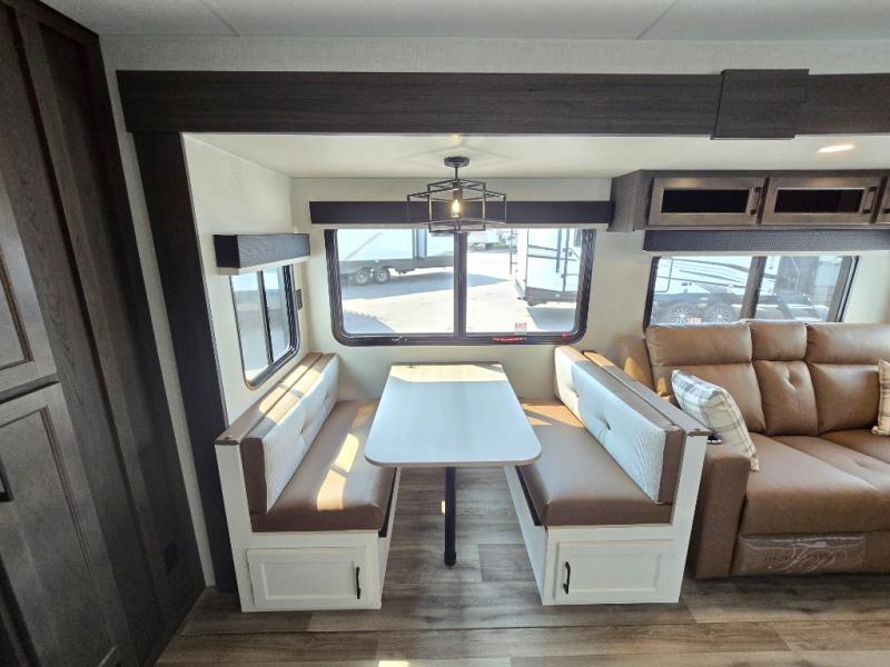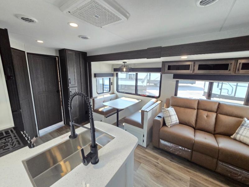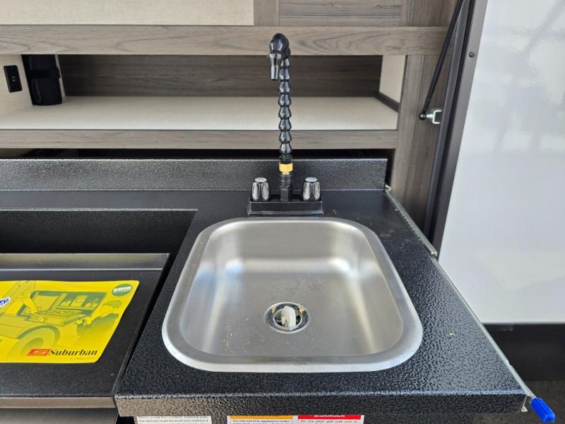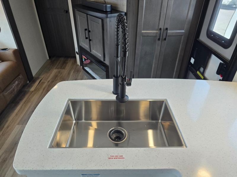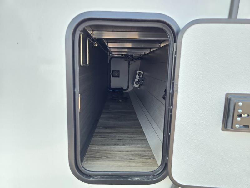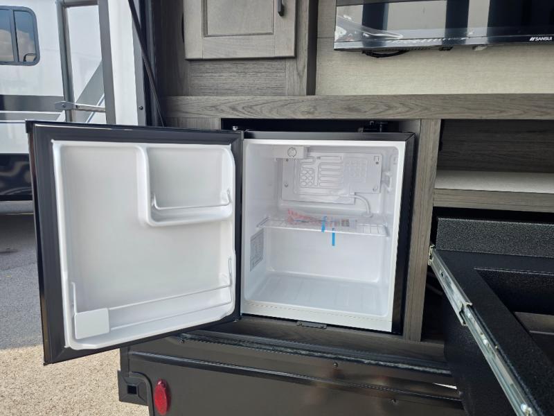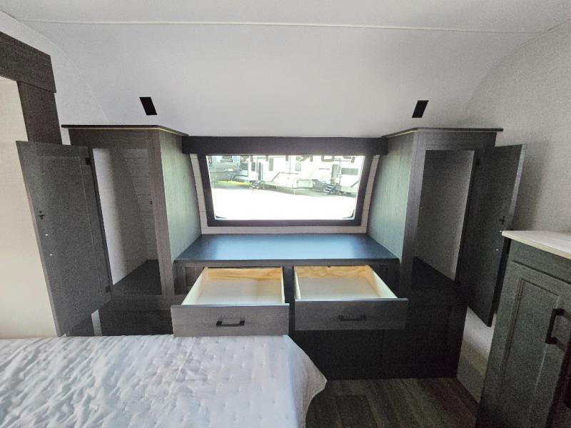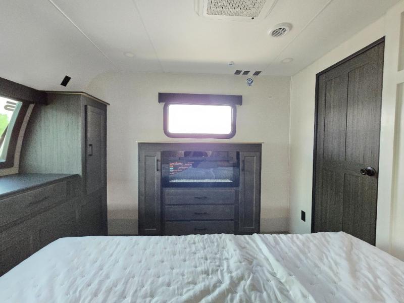 The whole family can camp together in this travel trailer! It features a rear private bunkhouse with a 28" x 70" top bunk above a 40" x 70" bottom bunk, a closet, and a 28" x 73" flip up top bunk above a 70" sofa with table slide. One of the dual entry doors leads directly into the half bathroom with fold-out aluminum steps so you can get back to having fun faster. The chef can prepare their best meals for the crew either indoors with the three burner cooktop or at the exterior campfire café with a 40" TV/DVD/speakers to entertain them while they cook. Everyone can gather together at the Sit N' Slide table and 70" tri-fold sofa across from the entertainment center with a fireplace for a cozy evening. The dual entry bathroom is easy to access, especially for those staying in the front private bedroom. You even have a coat closet next to the main entrance to limit the clutter!
