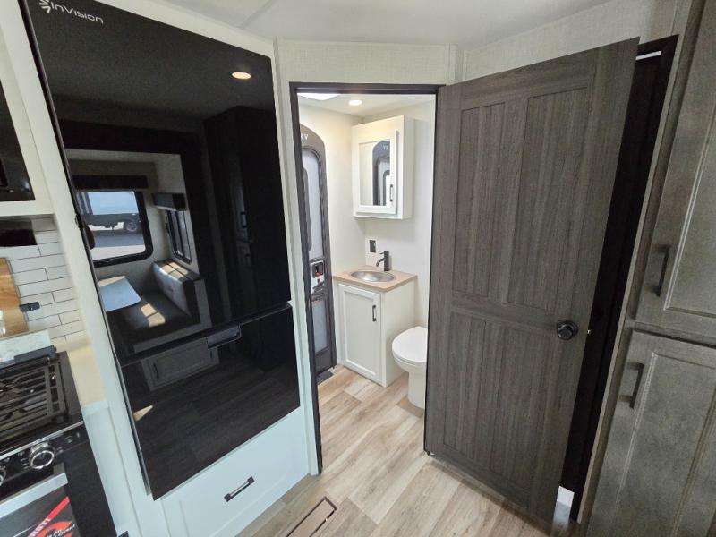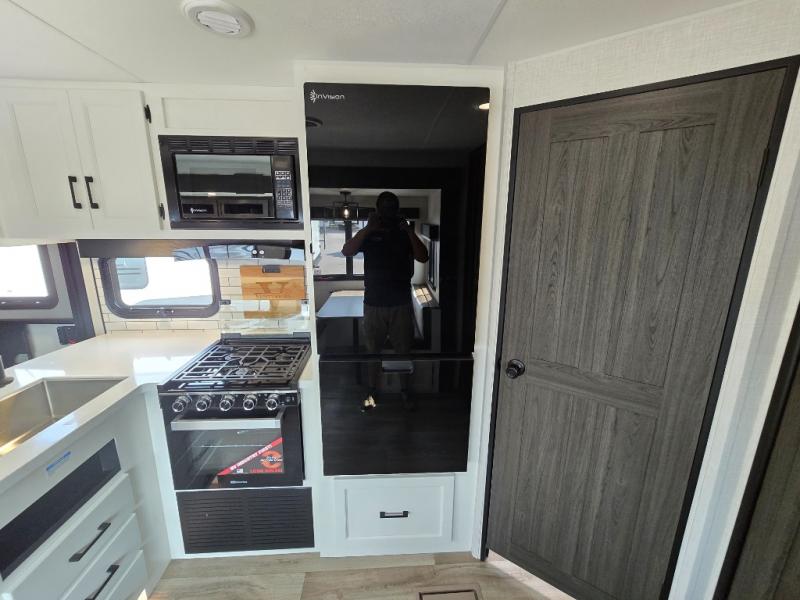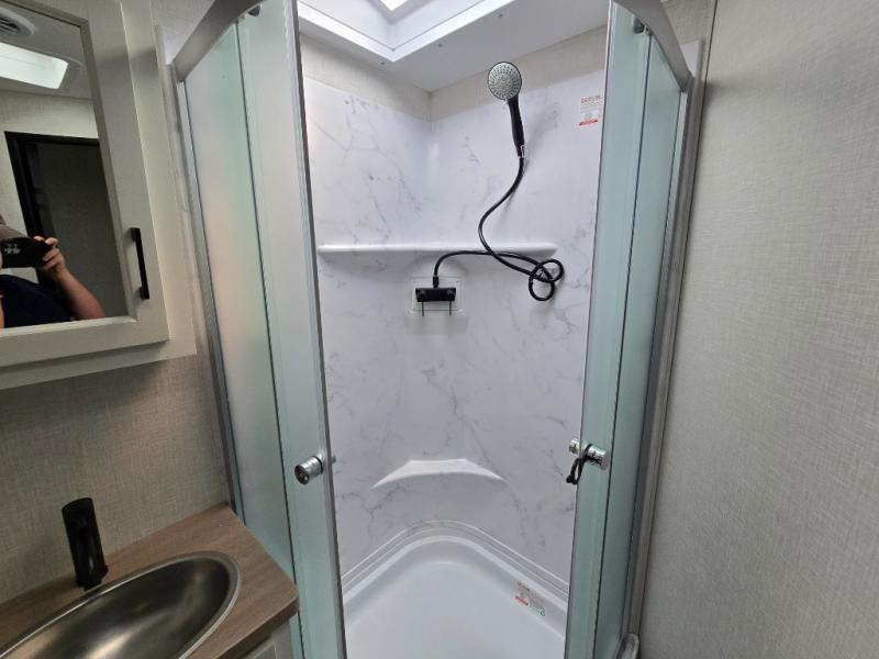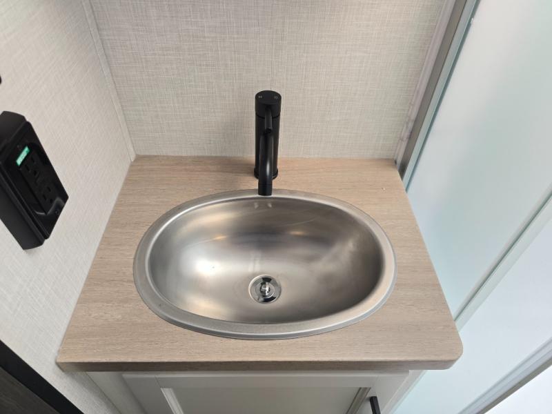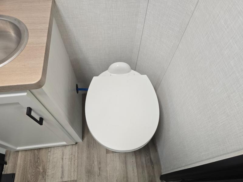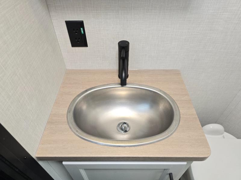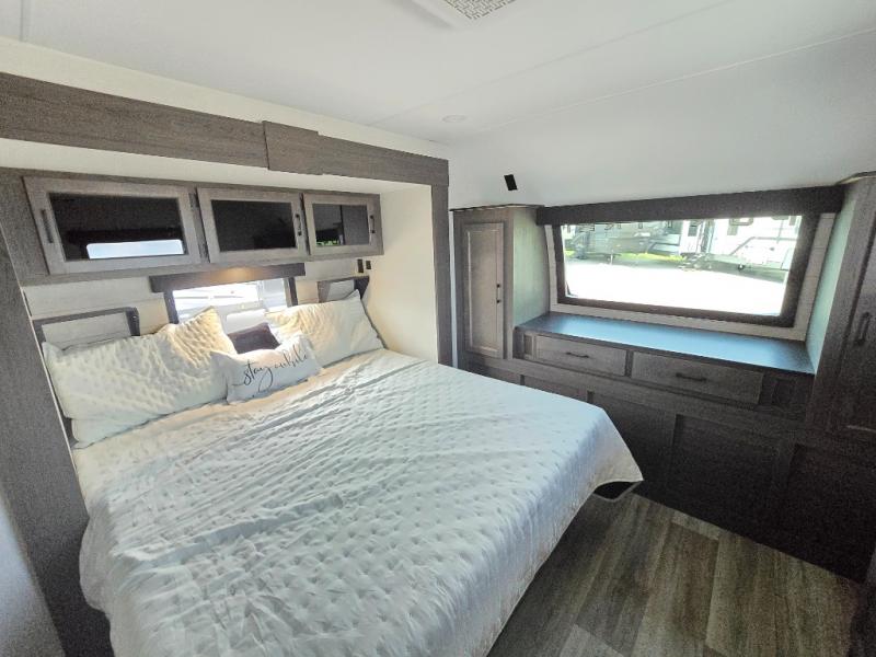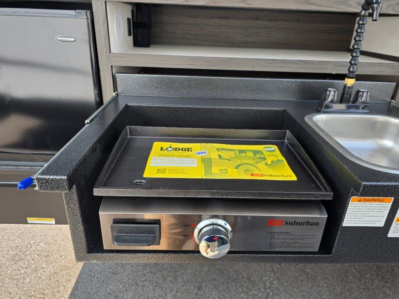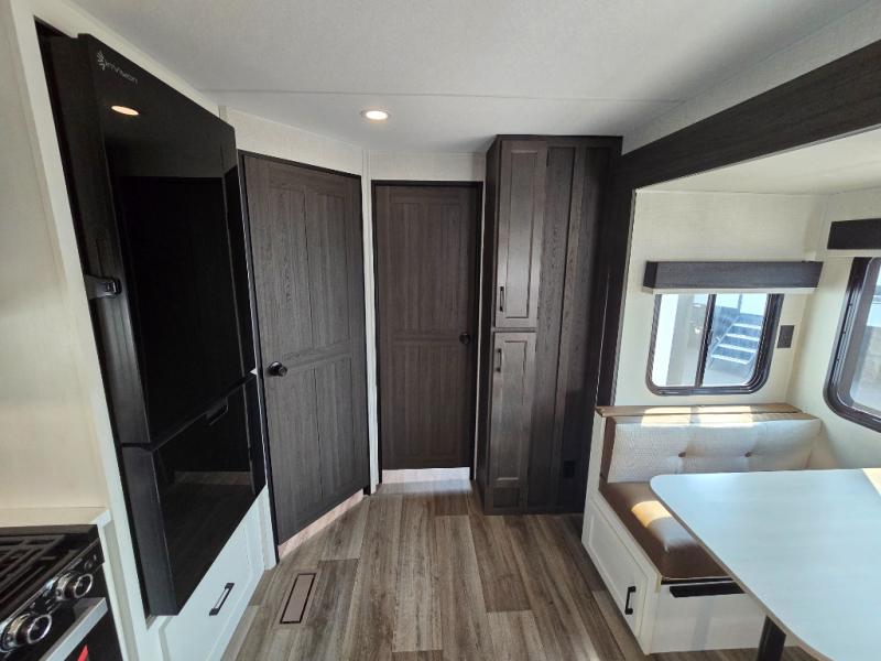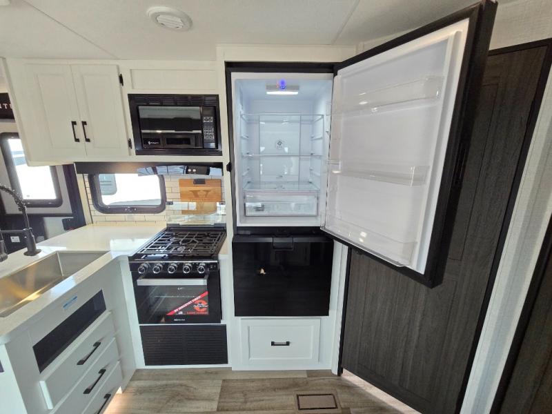 The whole family can camp together in this travel trailer! It features a rear private bunkhouse with a 28" x 70" top bunk above a 40" x 70" bottom bunk, a closet, and a 28" x 73" flip up top bunk above a 70" sofa with table slide. One of the dual entry doors leads directly into the half bathroom with fold-out aluminum steps so you can get back to having fun faster. The chef can prepare their best meals for the crew either indoors with the three burner cooktop or at the exterior campfire café with a 40" TV/DVD/speakers to entertain them while they cook. Everyone can gather together at the Sit N' Slide table and 70" tri-fold sofa across from the entertainment center with a fireplace for a cozy evening. The dual entry bathroom is easy to access, especially for those staying in the front private bedroom. You even have a coat closet next to the main entrance to limit the clutter!