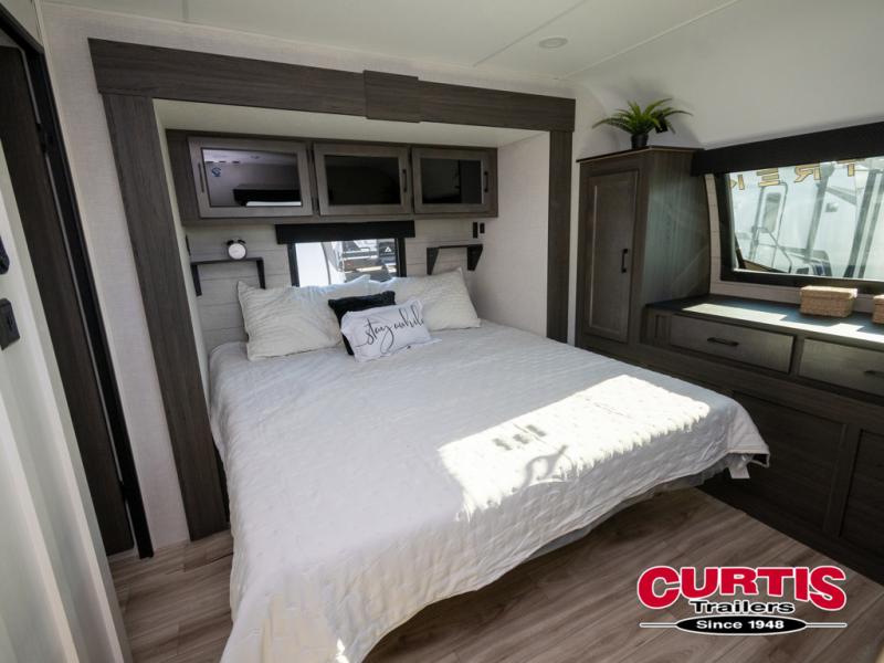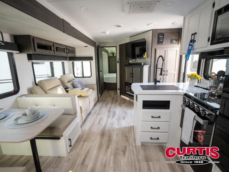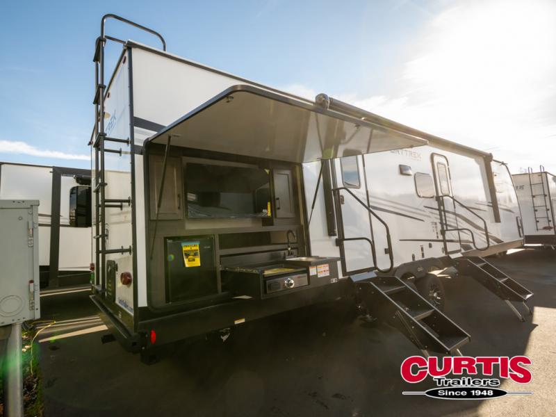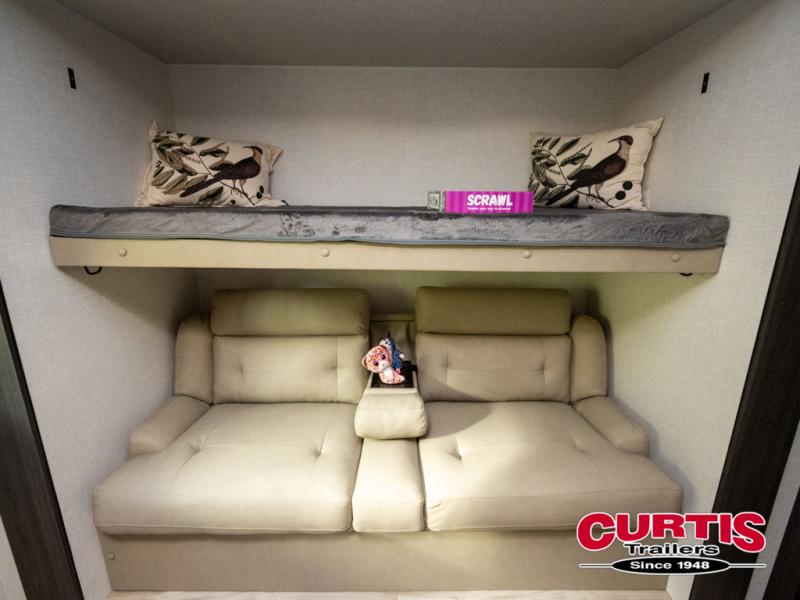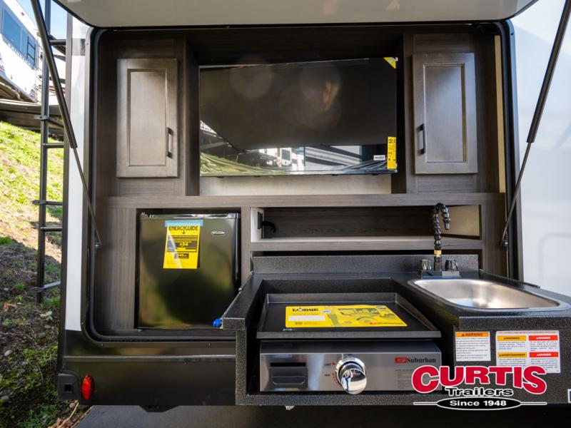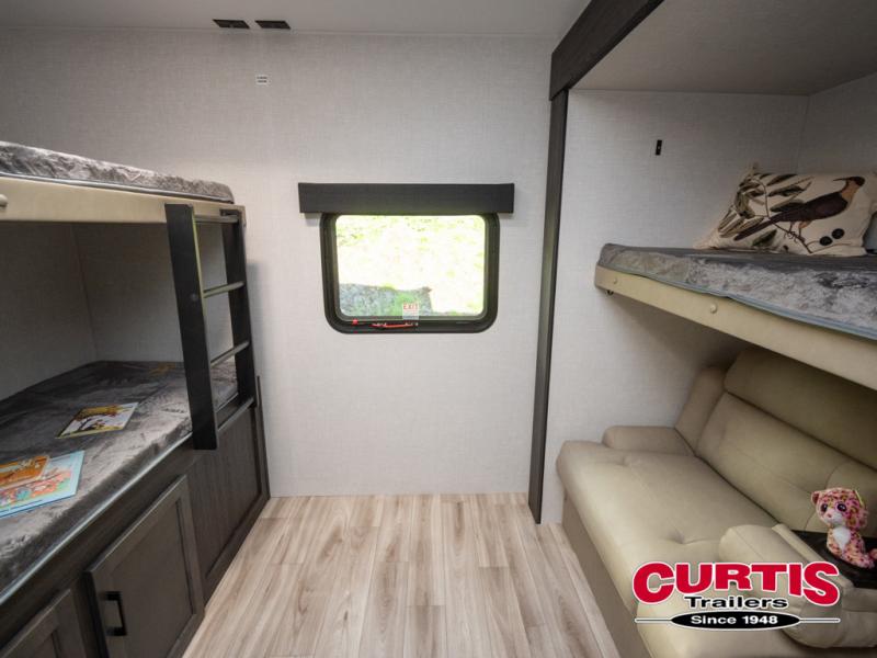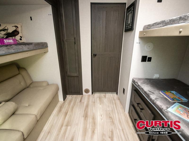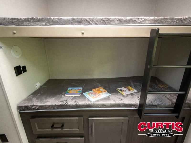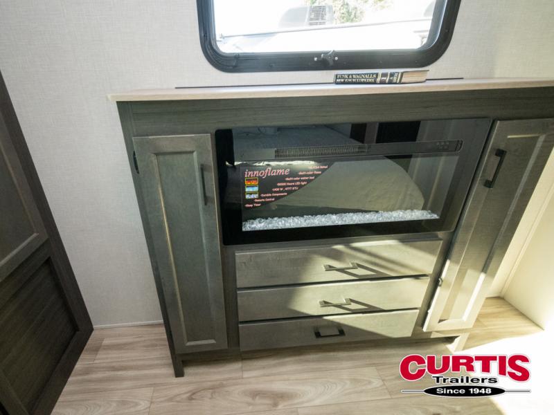 The whole family can camp together in this travel trailer! It features a rear private bunkhouse with a 28" x 70" top bunk above a 40" x 70" bottom bunk, a closet, and a 28" x 73" flip up top bunk above a 70" sofa with table slide. One of the dual entry doors leads directly into the half bathroom with fold-out aluminum steps so you can get back to having fun faster. The chef can prepare their best meals for the crew either indoors with the three burner cooktop or at the exterior campfire café with a 40" TV/DVD/speakers to entertain them while they cook. Everyone can gather together at the Sit N' Slide table and 70" tri-fold sofa across from the entertainment center with a fireplace for a cozy evening. The dual entry bathroom is easy to access, especially for those staying in the front private bedroom. You even have a coat closet next to the main entrance to limit the clutter!