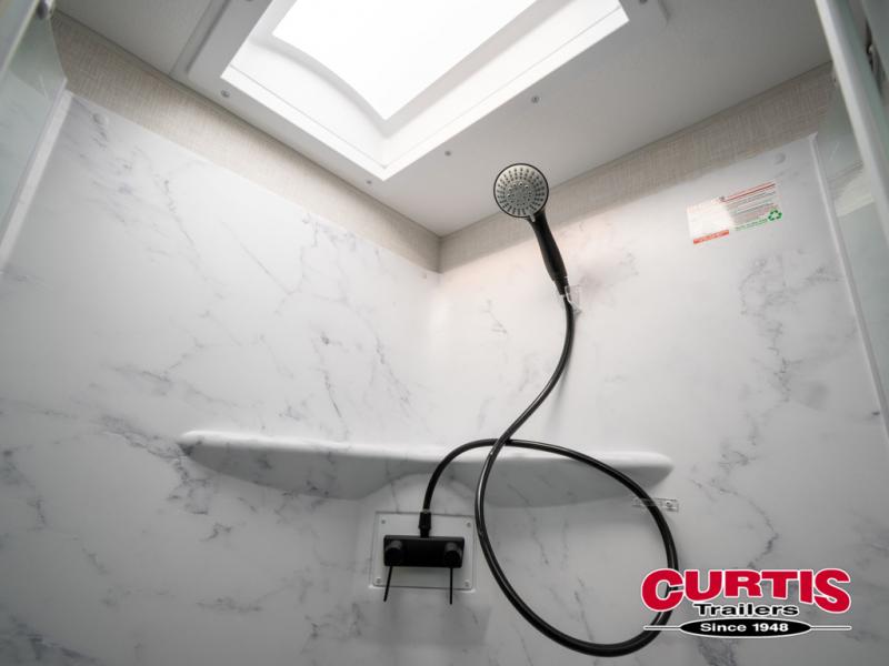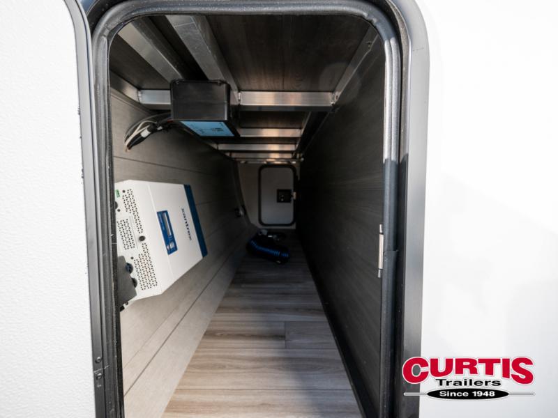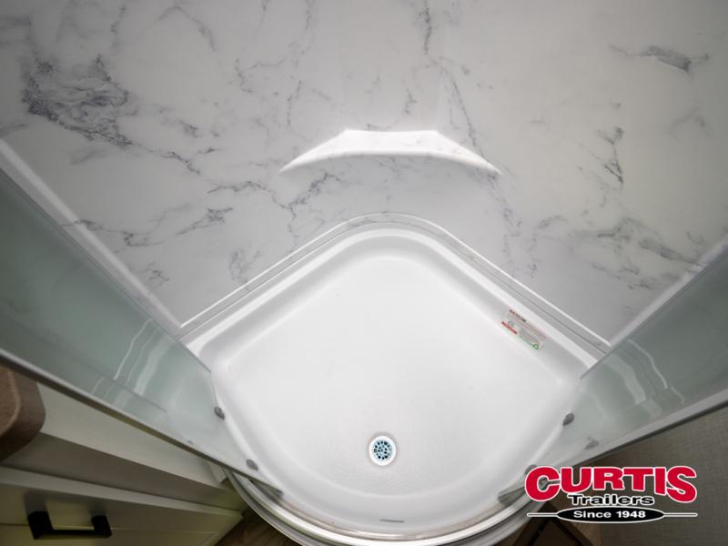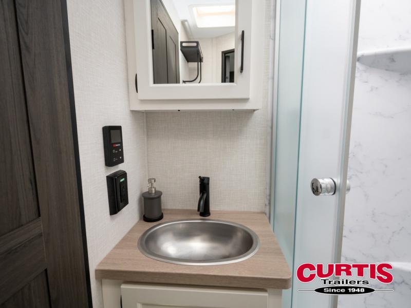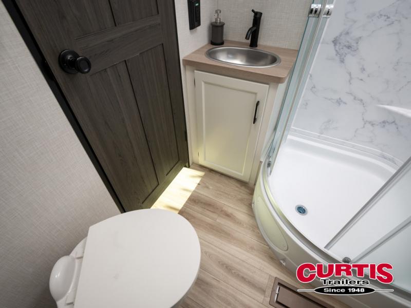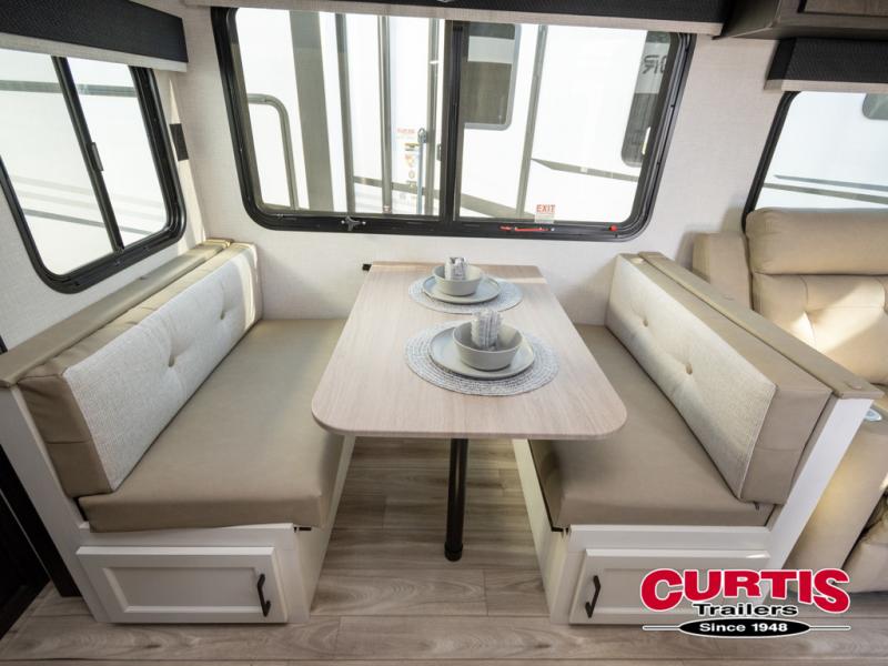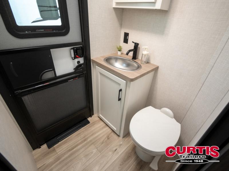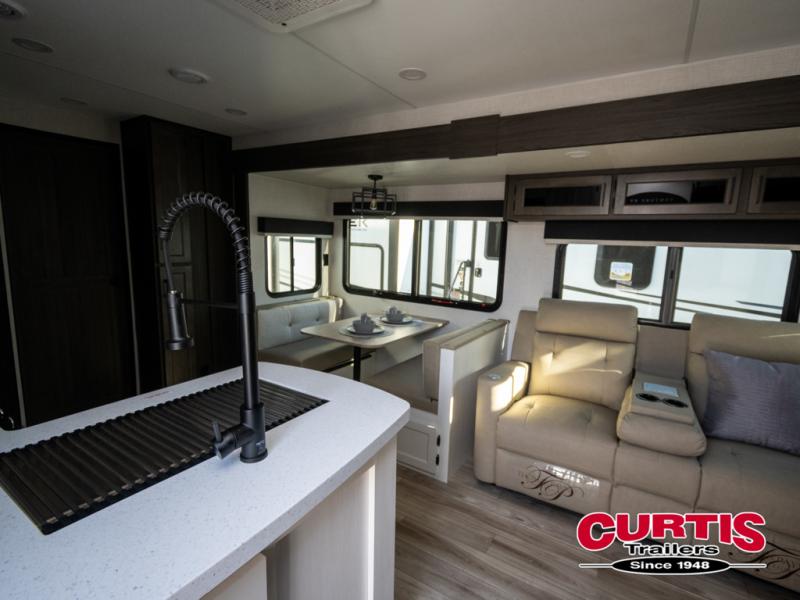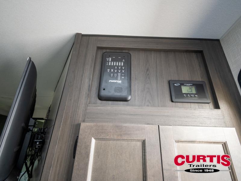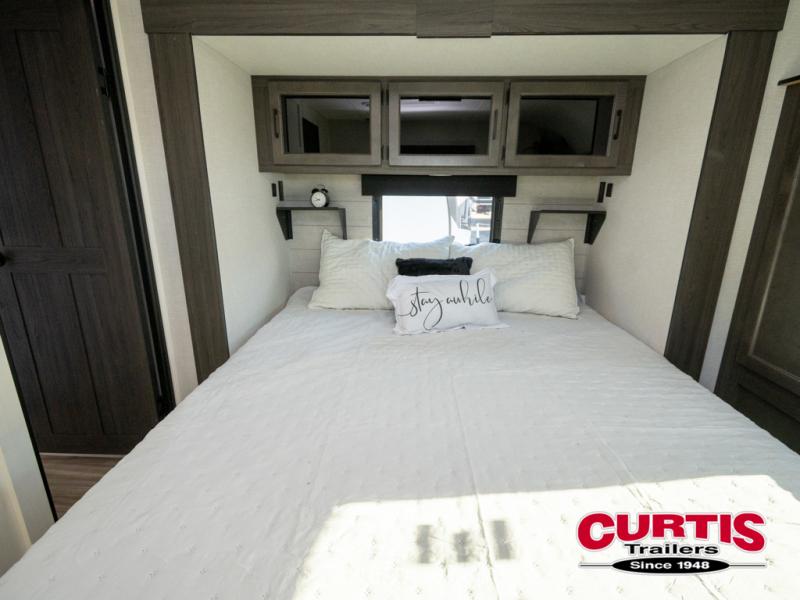 The whole family can camp together in this travel trailer! It features a rear private bunkhouse with a 28" x 70" top bunk above a 40" x 70" bottom bunk, a closet, and a 28" x 73" flip up top bunk above a 70" sofa with table slide. One of the dual entry doors leads directly into the half bathroom with fold-out aluminum steps so you can get back to having fun faster. The chef can prepare their best meals for the crew either indoors with the three burner cooktop or at the exterior campfire café with a 40" TV/DVD/speakers to entertain them while they cook. Everyone can gather together at the Sit N' Slide table and 70" tri-fold sofa across from the entertainment center with a fireplace for a cozy evening. The dual entry bathroom is easy to access, especially for those staying in the front private bedroom. You even have a coat closet next to the main entrance to limit the clutter!