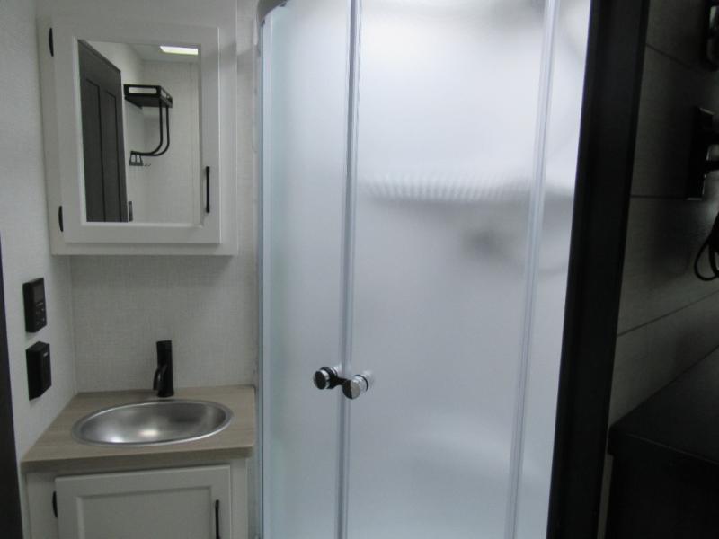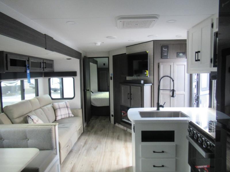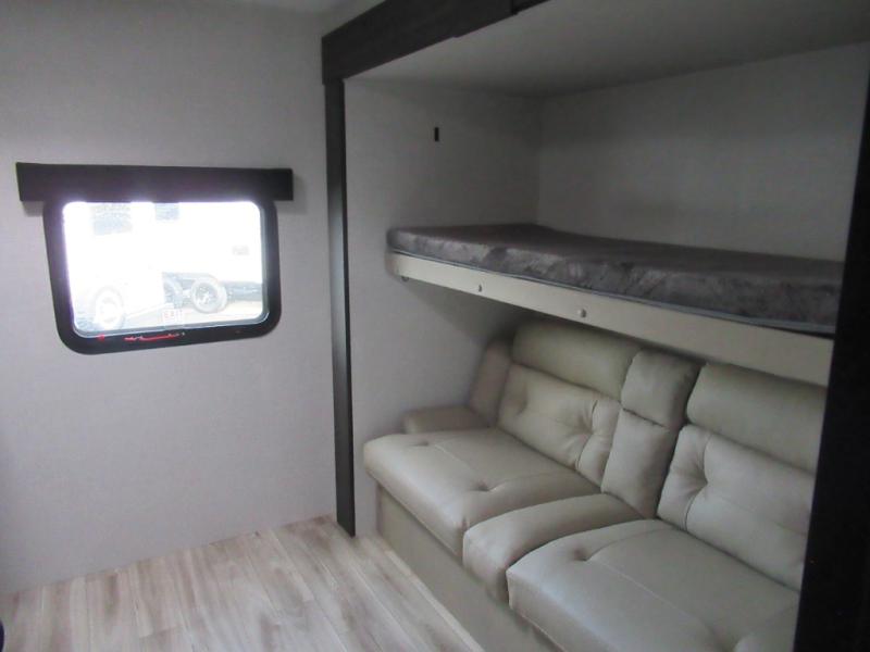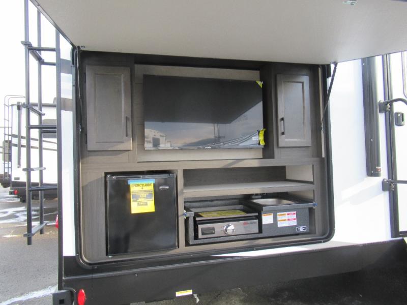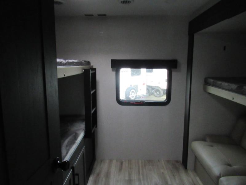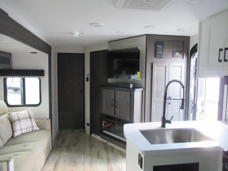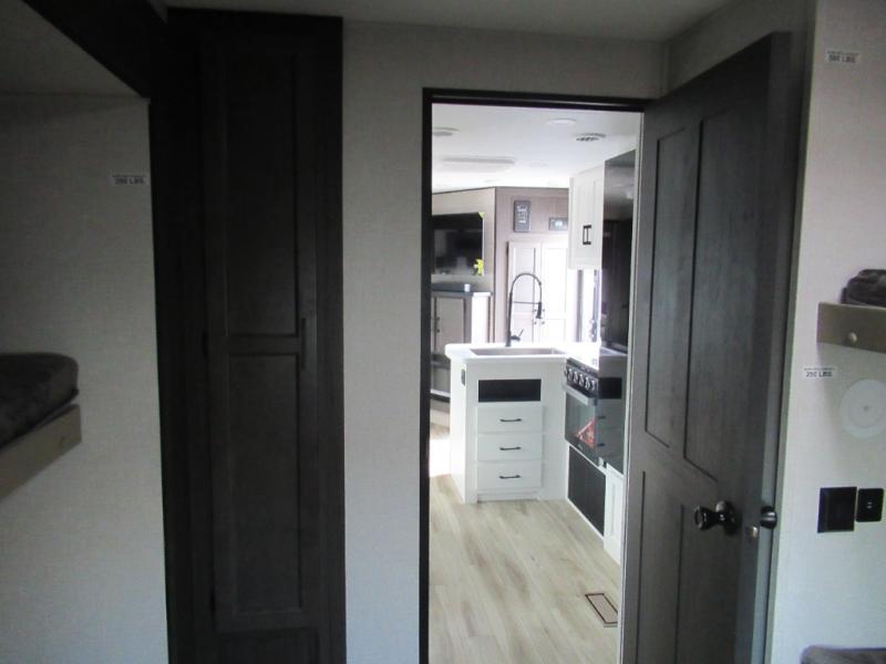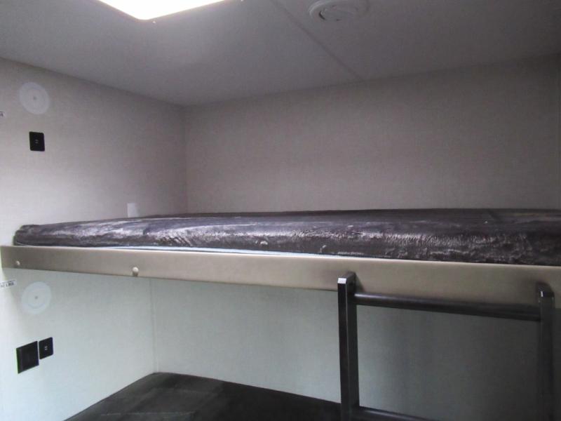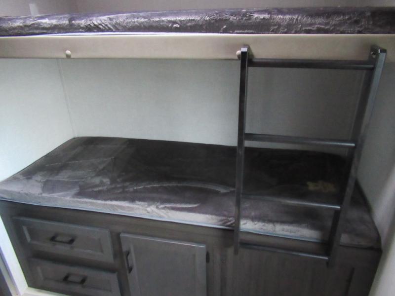 The whole family can camp together in this travel trailer! It features a rear private bunkhouse with a 28" x 70" top bunk above a 40" x 70" bottom bunk, a closet, and a 28" x 73" flip up top bunk above a 70" sofa with table slide. One of the dual entry doors leads directly into the half bathroom with fold-out aluminum steps so you can get back to having fun faster. The chef can prepare their best meals for the crew either indoors with the three burner cooktop or at the exterior campfire café with a 40" TV/DVD/speakers to entertain them while they cook. Everyone can gather together at the Sit N' Slide table and 70" tri-fold sofa across from the entertainment center with a fireplace for a cozy evening. The dual entry bathroom is easy to access, especially for those staying in the front private bedroom. You even have a coat closet next to the main entrance to limit the clutter!