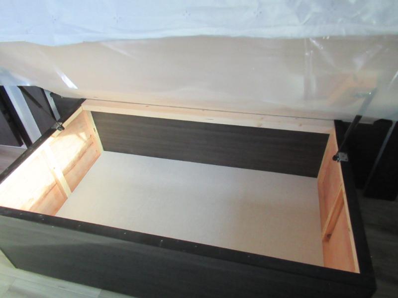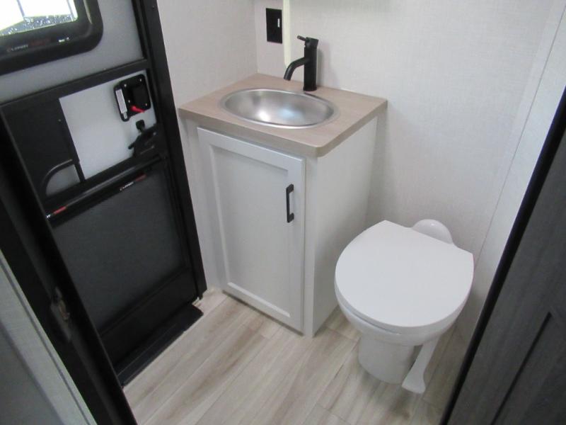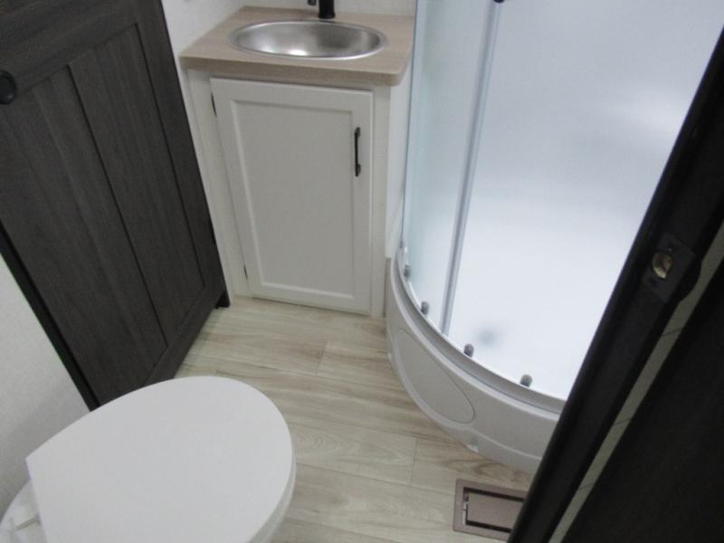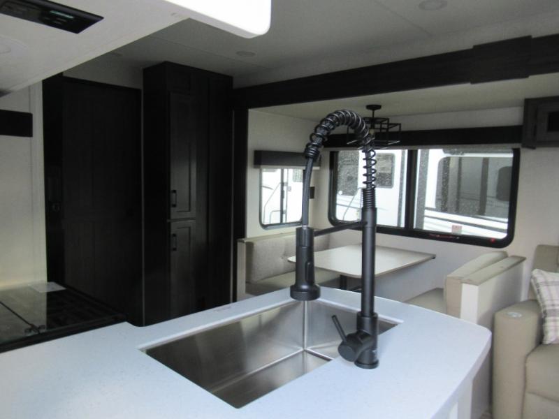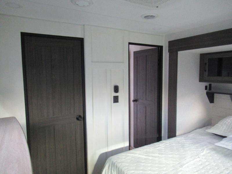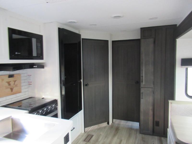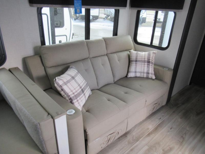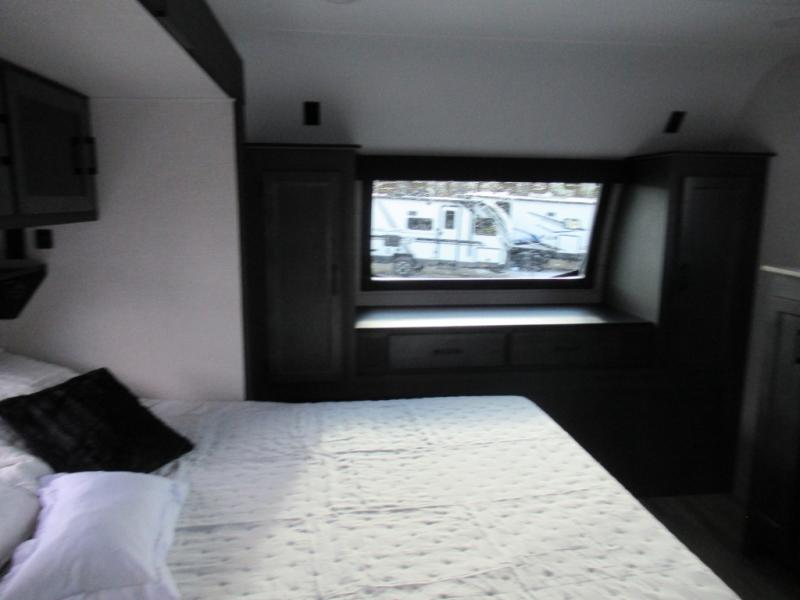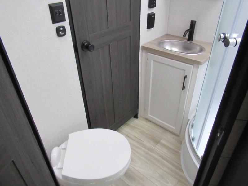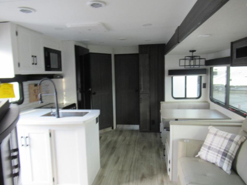 The whole family can camp together in this travel trailer! It features a rear private bunkhouse with a 28" x 70" top bunk above a 40" x 70" bottom bunk, a closet, and a 28" x 73" flip up top bunk above a 70" sofa with table slide. One of the dual entry doors leads directly into the half bathroom with fold-out aluminum steps so you can get back to having fun faster. The chef can prepare their best meals for the crew either indoors with the three burner cooktop or at the exterior campfire café with a 40" TV/DVD/speakers to entertain them while they cook. Everyone can gather together at the Sit N' Slide table and 70" tri-fold sofa across from the entertainment center with a fireplace for a cozy evening. The dual entry bathroom is easy to access, especially for those staying in the front private bedroom. You even have a coat closet next to the main entrance to limit the clutter!