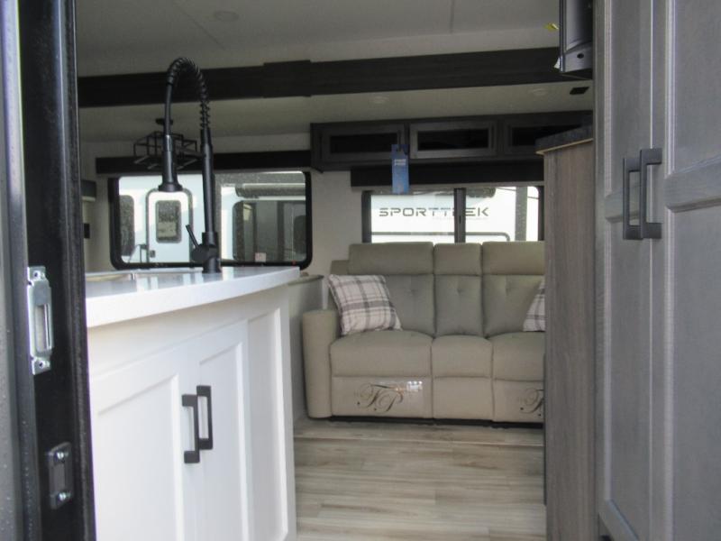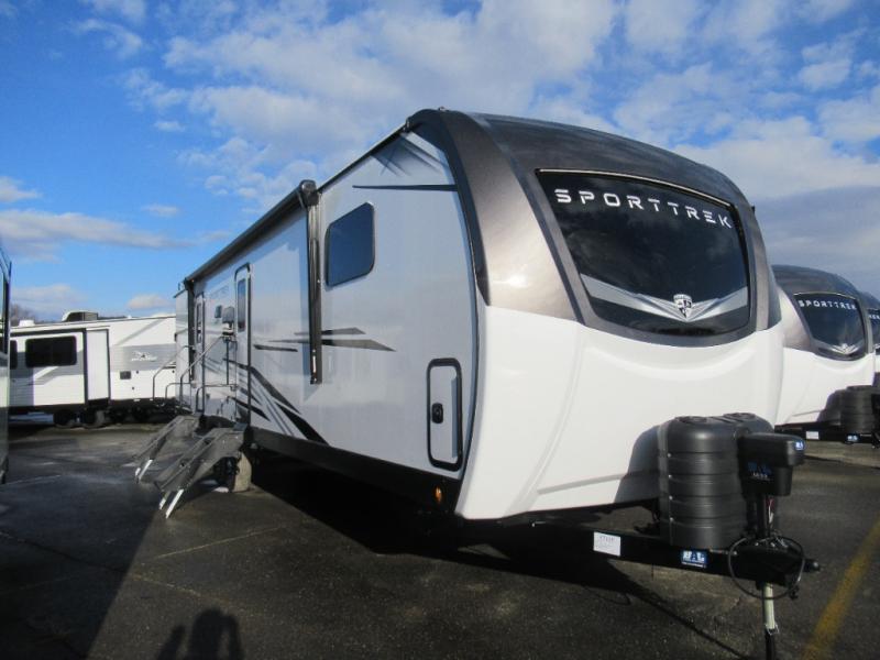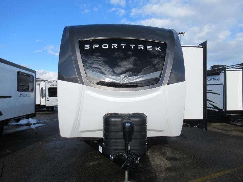 An elegant design and new features come with every one of these Venture RV SportTrek Touring Edition travel trailers! The NXG Huck bolt frame holds these units together and a walkable roof covers them. Heads will turn down the highway and at the campsite with an upgraded graphics package and a painted fiberglass front cap with integrated LED light. The exterior pass-through storage area has slam latch baggage doors with magnetic catches so you don't have to worry about them closing on you and a motion activated light to see your items clearly even at night. Luxury abounds throughout these units, especially with the mandatory Interior Luxury package which comes with solid surface kitchen countertops, designer valances with fabric nightshades, two 30" frameless fireplaces, and Beauflor wood plank flooring that is easy to clean. Come find your favorite model today!