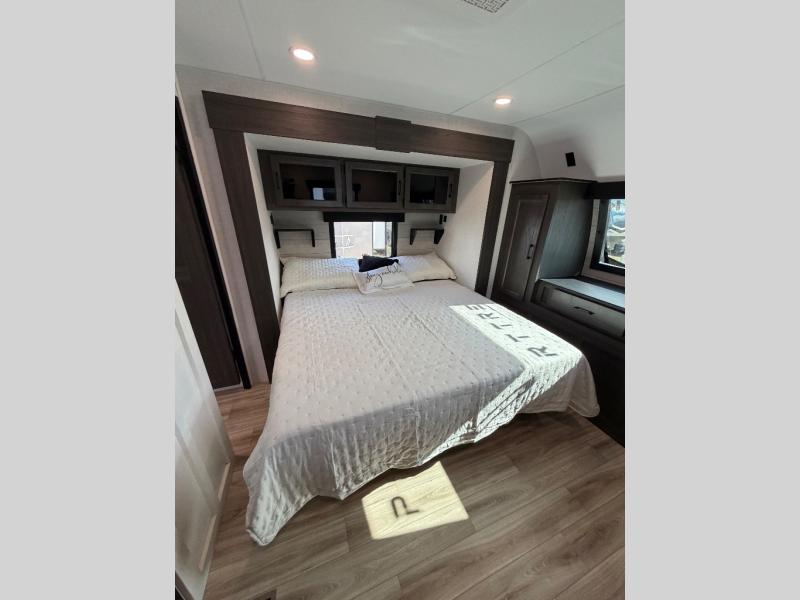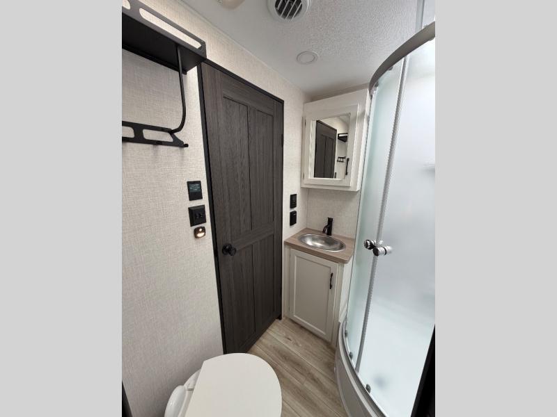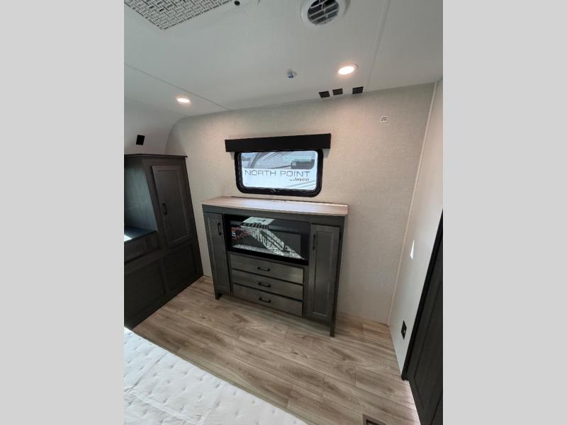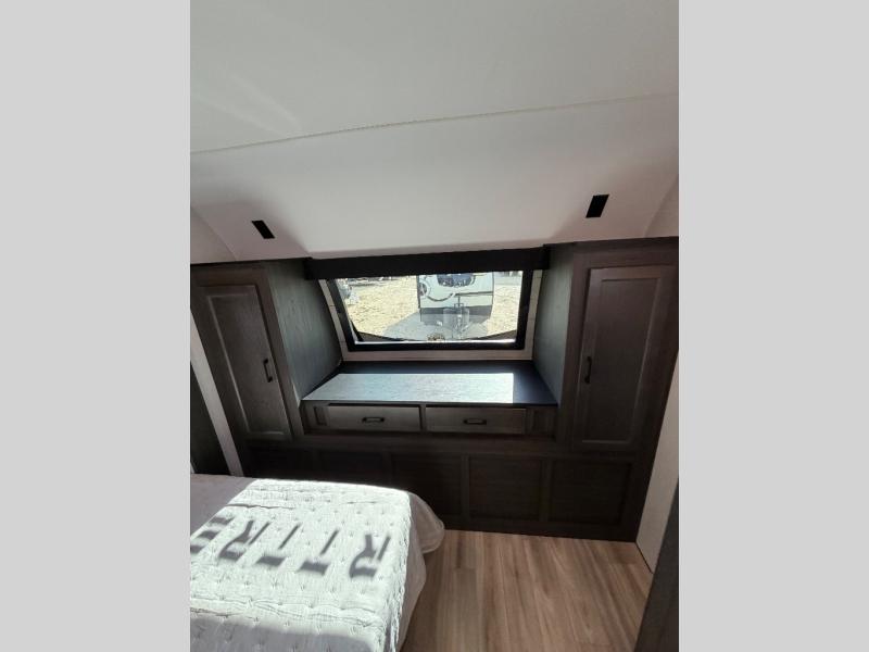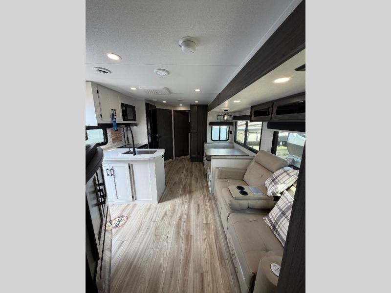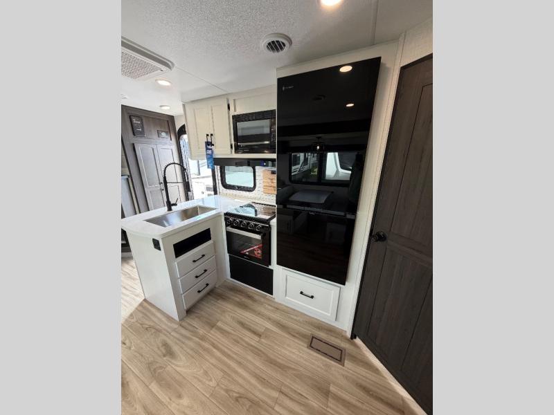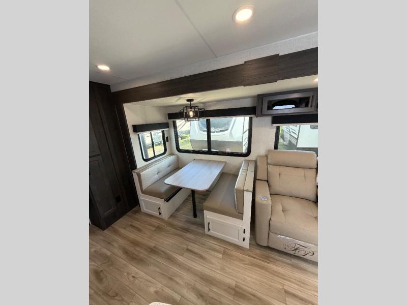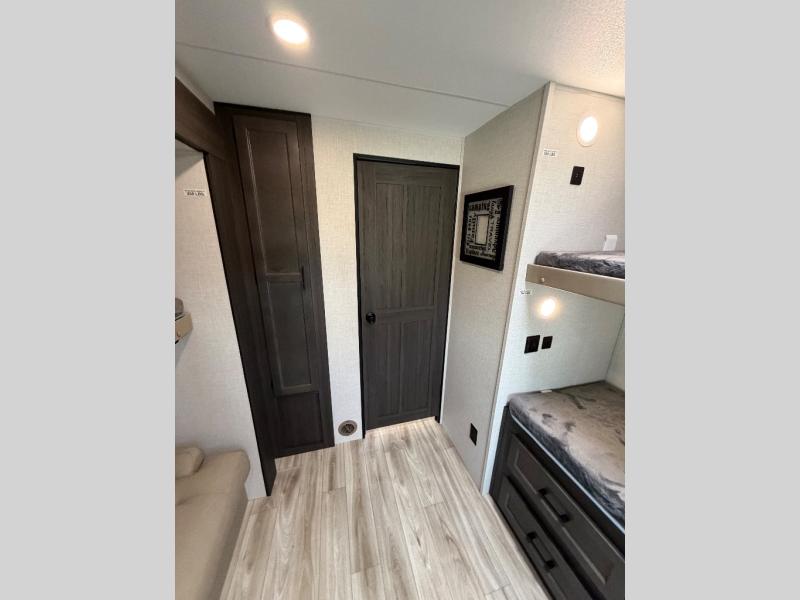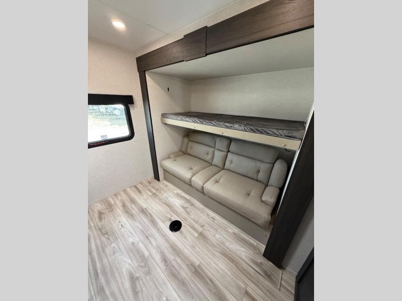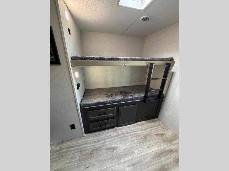 The whole family can camp together in this travel trailer! It features a rear private bunkhouse with a 28" x 70" top bunk above a 40" x 70" bottom bunk, a closet, and a 28" x 73" flip up top bunk above a 70" sofa with table slide. One of the dual entry doors leads directly into the half bathroom with fold-out aluminum steps so you can get back to having fun faster. The chef can prepare their best meals for the crew either indoors with the three burner cooktop or at the exterior campfire café with a 40" TV/DVD/speakers to entertain them while they cook. Everyone can gather together at the Sit N' Slide table and 70" tri-fold sofa across from the entertainment center with a fireplace for a cozy evening. The dual entry bathroom is easy to access, especially for those staying in the front private bedroom. You even have a coat closet next to the main entrance to limit the clutter!