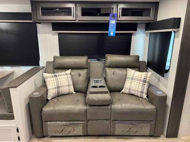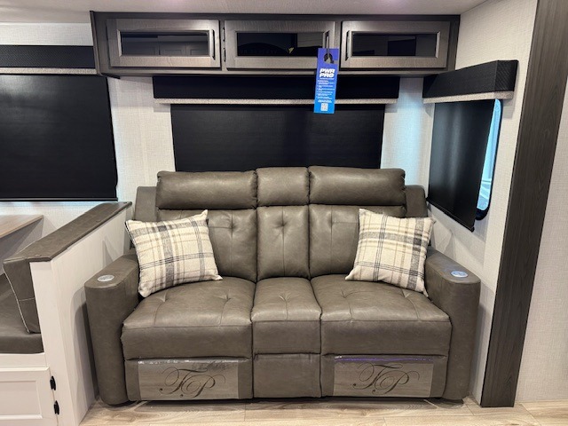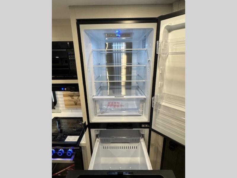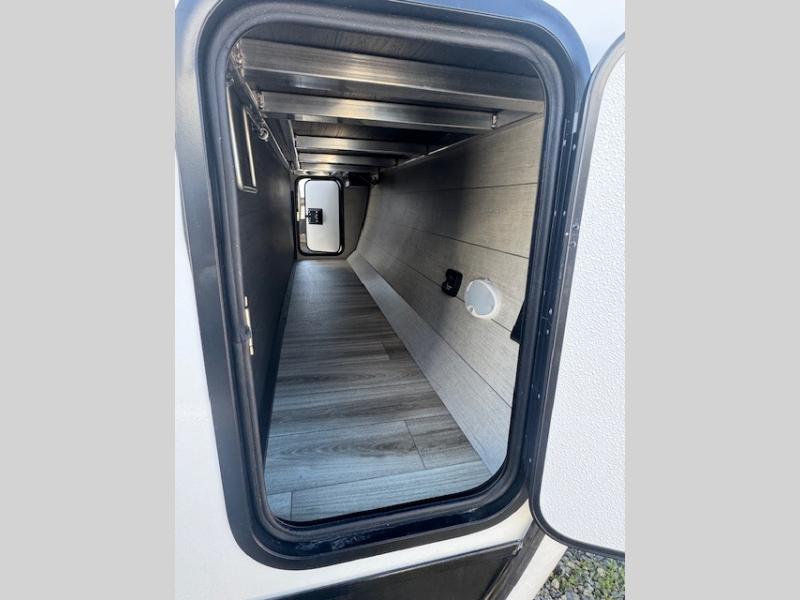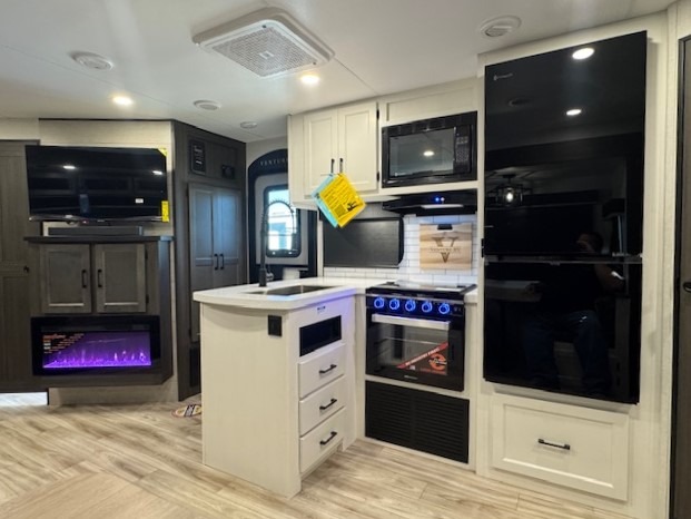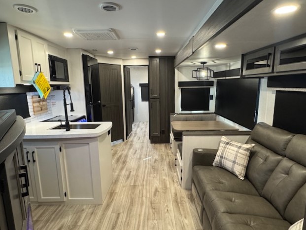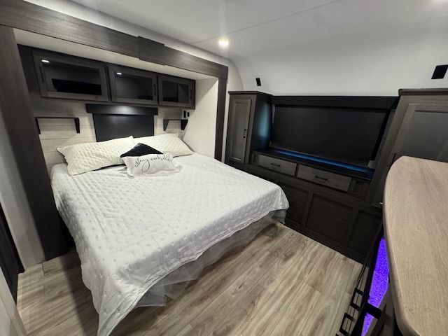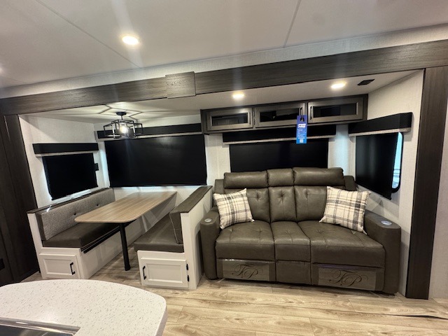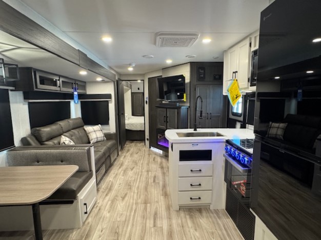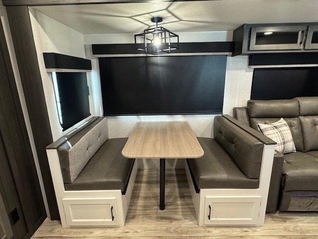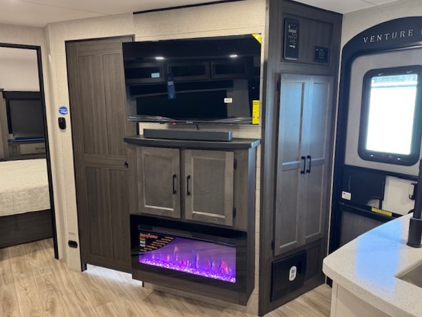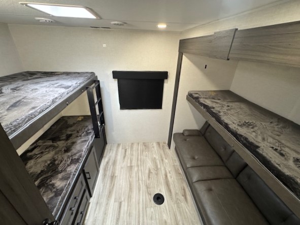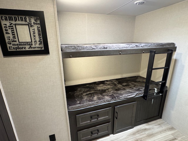 The whole family can camp together in this travel trailer! It features a rear private bunkhouse with a 28" x 70" top bunk above a 40" x 70" bottom bunk, a closet, and a 28" x 73" flip up top bunk above a 70" sofa with table slide. One of the dual entry doors leads directly into the half bathroom with fold-out aluminum steps so you can get back to having fun faster. The chef can prepare their best meals for the crew either indoors with the three burner cooktop or at the exterior campfire café with a 40" TV/DVD/speakers to entertain them while they cook. Everyone can gather together at the Sit N' Slide table and 70" tri-fold sofa across from the entertainment center with a fireplace for a cozy evening. The dual entry bathroom is easy to access, especially for those staying in the front private bedroom. You even have a coat closet next to the main entrance to limit the clutter!