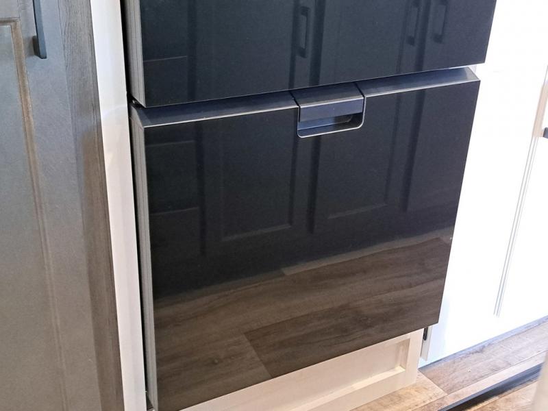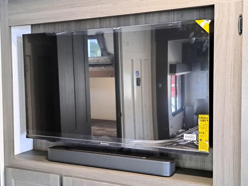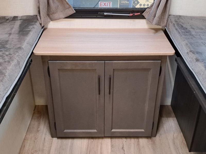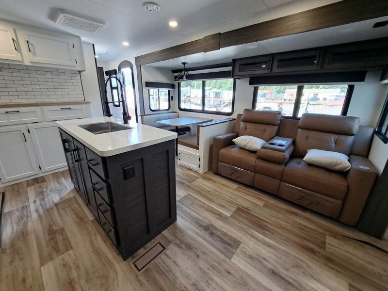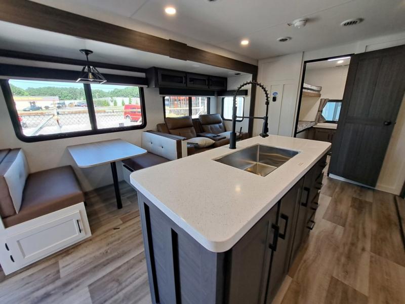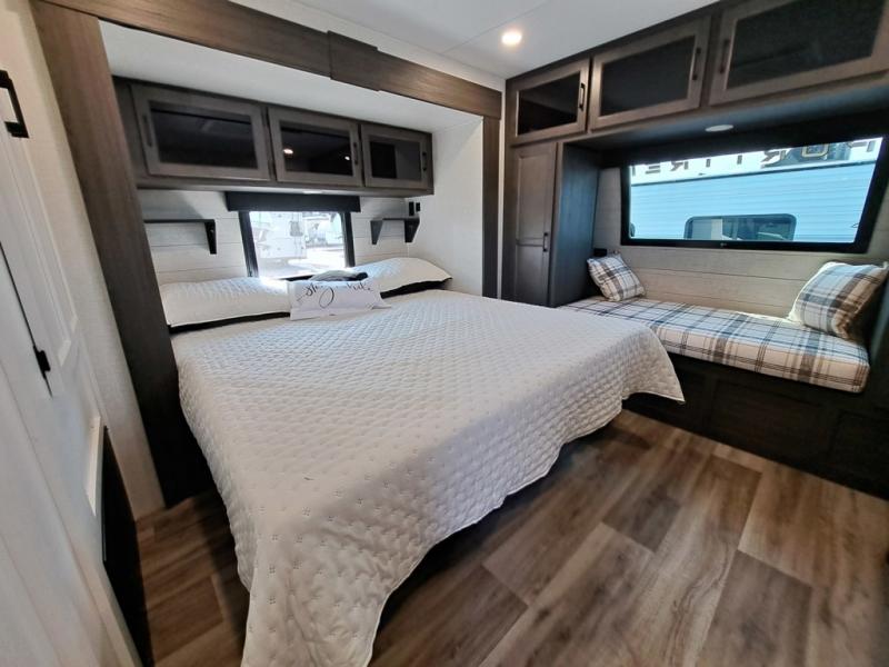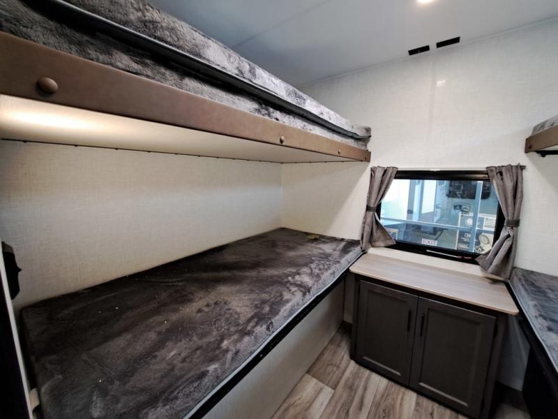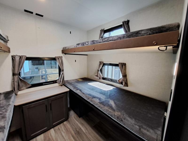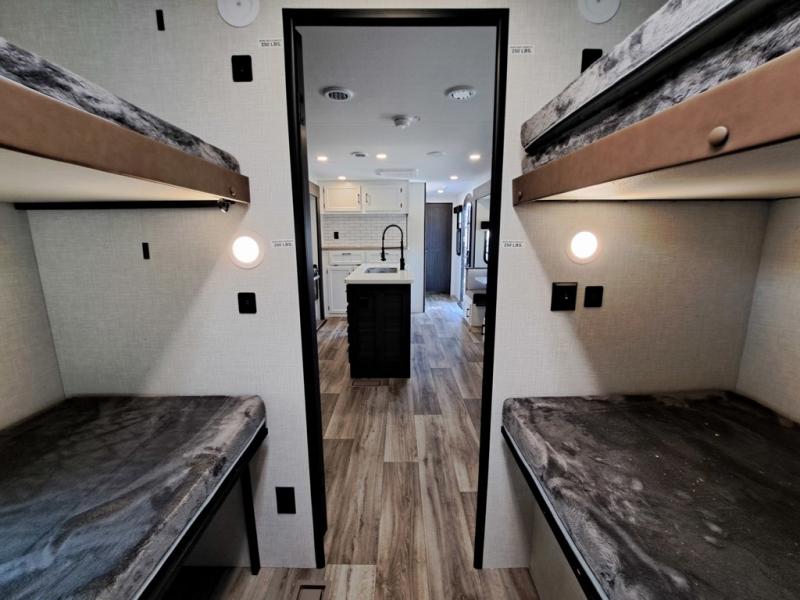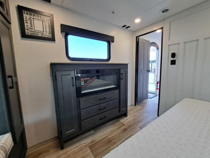 Versatility abounds in this travel trailer! The rear private bunkhouse has a set of 32" x 70" bunk beds and a set of 28" x 70" flip up bunk beds, but what is really special about this room is its ability to convert to a flex room with a desk, king bed, extra storage or a pet palace. The chef will enjoy having their choice of either cooking indoors with the kitchen island and three burner cooktop or cooking at the exterior campfire café with a refrigerator, a griddle, and a sink with countertop space. Relax each night in true comfort with a 70" tri-fold sofa across from the entertainment center with a 30" frameless fireplace, plus the front private bedroom has a 30" frameless fireplace across from a 60" x 80" queen bed slide. You can even transform the sofa and the Sit N' Slide table into extra sleeping spaces. The bedroom also has a window seat so you can look out at your beautiful scenery while reading a book and an interior wall wardrobe with washer and dryer prep!