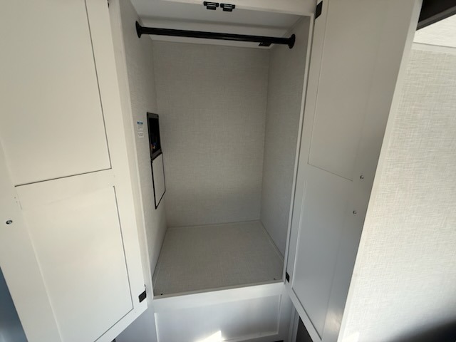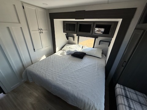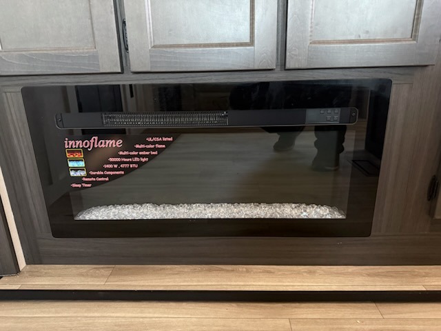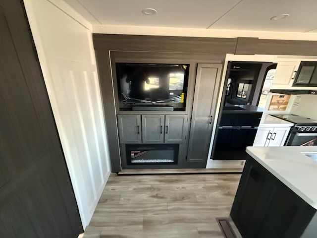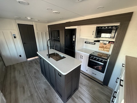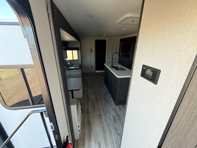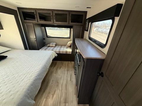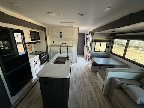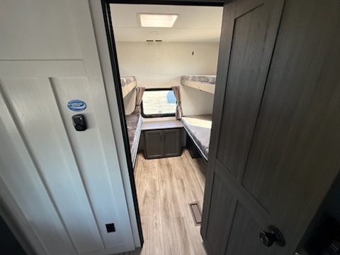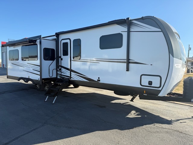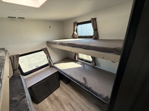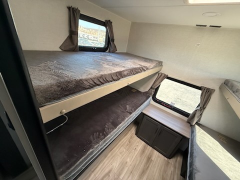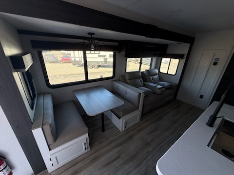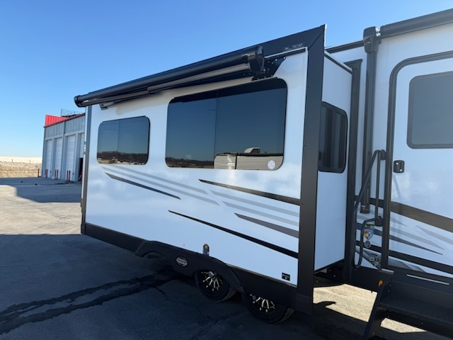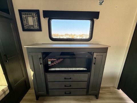 Versatility abounds in this travel trailer! The rear private bunkhouse has a set of 32" x 70" bunk beds and a set of 28" x 70" flip up bunk beds, but what is really special about this room is its ability to convert to a flex room with a desk, king bed, extra storage or a pet palace. The chef will enjoy having their choice of either cooking indoors with the kitchen island and three burner cooktop or cooking at the exterior campfire café with a refrigerator, a griddle, and a sink with countertop space. Relax each night in true comfort with a 70" tri-fold sofa across from the entertainment center with a 30" frameless fireplace, plus the front private bedroom has a 30" frameless fireplace across from a 60" x 80" queen bed slide. You can even transform the sofa and the Sit N' Slide table into extra sleeping spaces. The bedroom also has a window seat so you can look out at your beautiful scenery while reading a book and an interior wall wardrobe with washer and dryer prep!