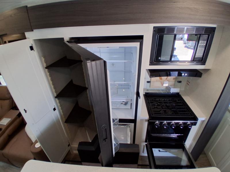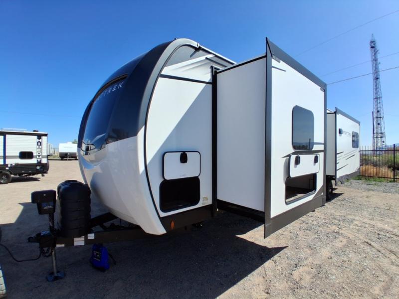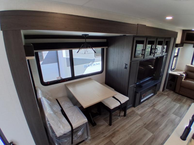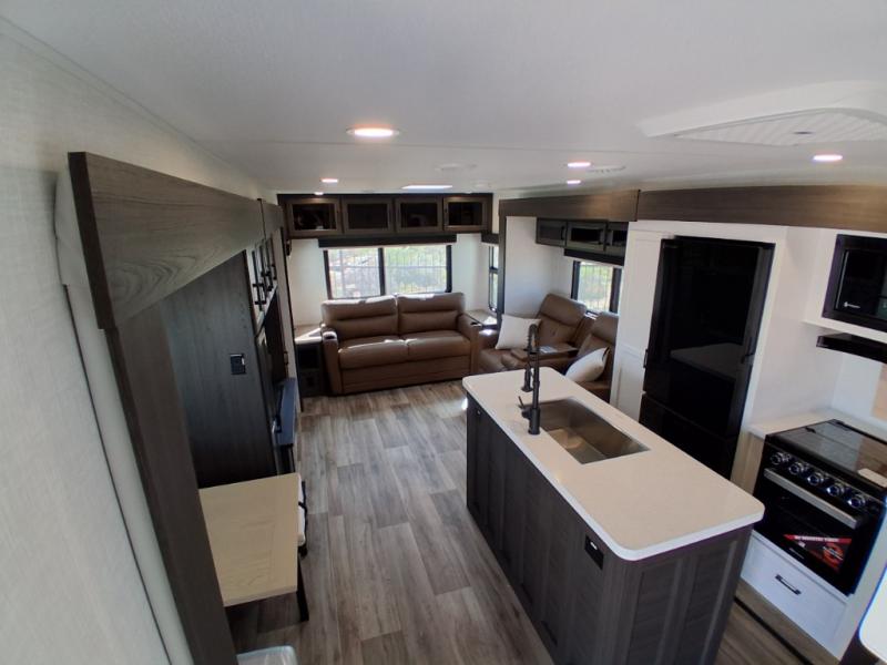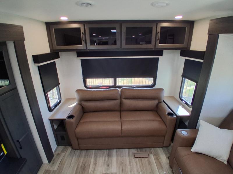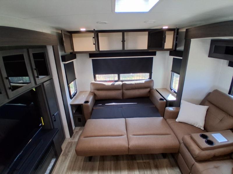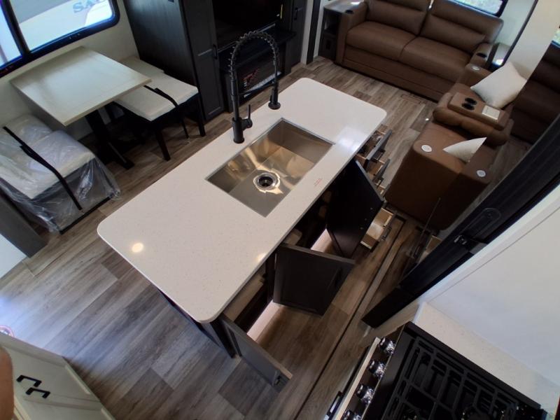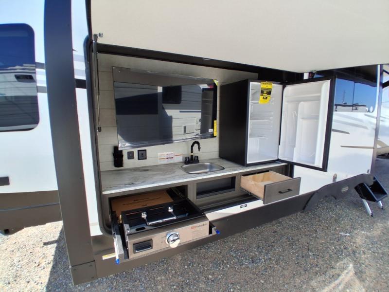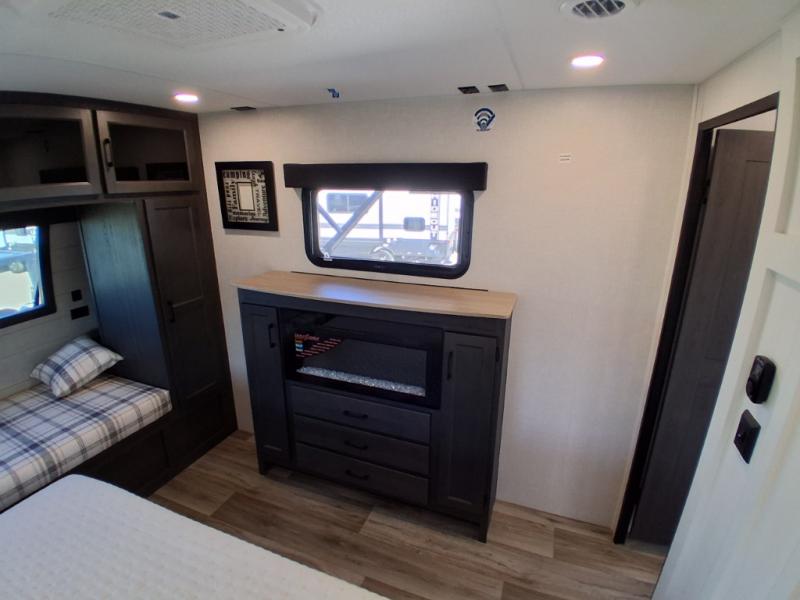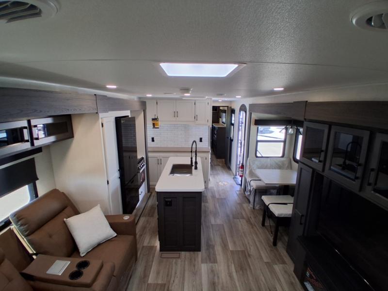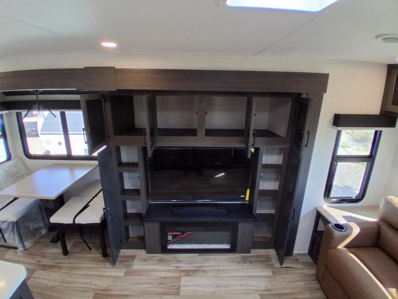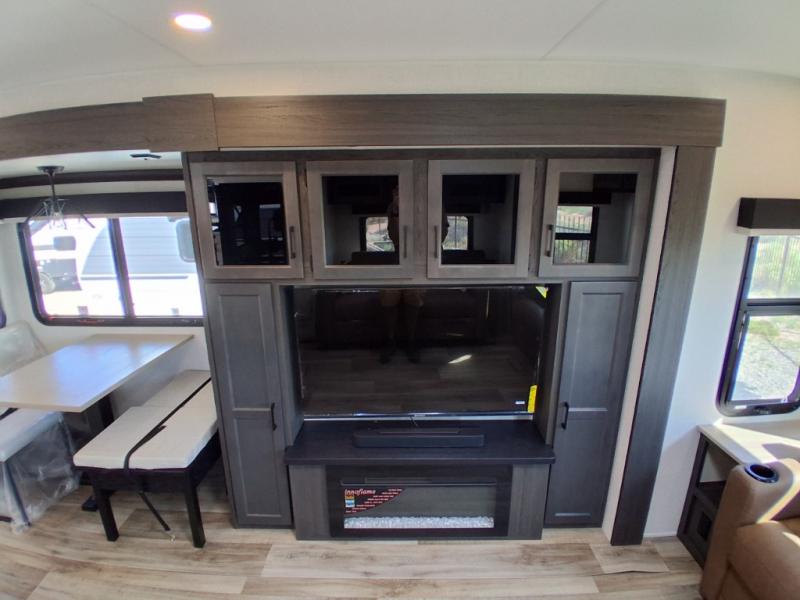 Pack your bags and hitch up this travel trailer for a great weekend camping trip! The front private bedroom has a 70" x 80" Sleep Tight king bed slide to lay your head at night, a dresser with a 30" frameless fireplace, a window seat with shelves on either side for your books, and a wardrobe with washer and dryer prep. Freshen up each morning in the full bathroom with the 30" x 36" shower then head to the kitchen to fry up some eggs on the three burner cooktop and pour a cold glass of orange juice stored in the 10 cu. ft. refrigerator. The kitchen island will make your meal prepping easier and the table and chairs offer a comfortable place to enjoy your meals or play card games. You could even cook your meals at the exterior campfire café and set up a table underneath one of the two power awnings!