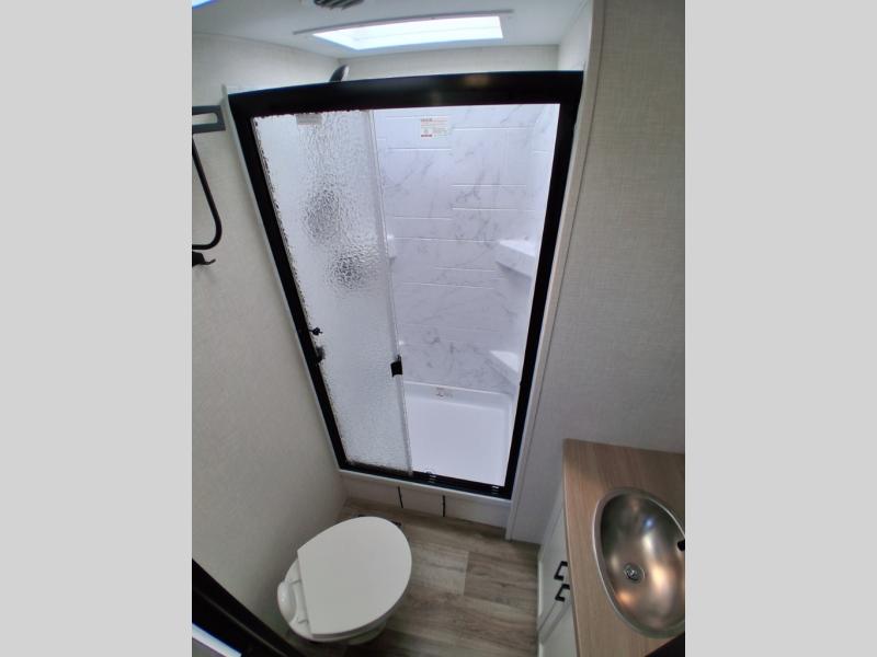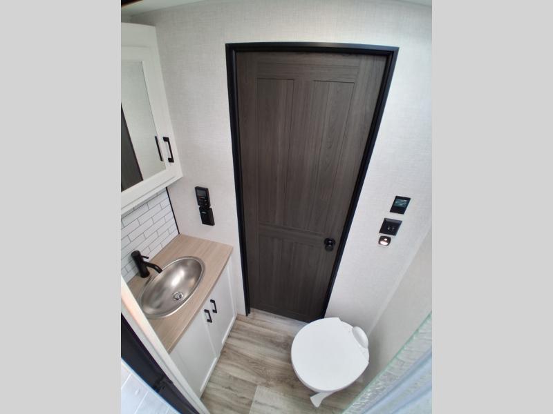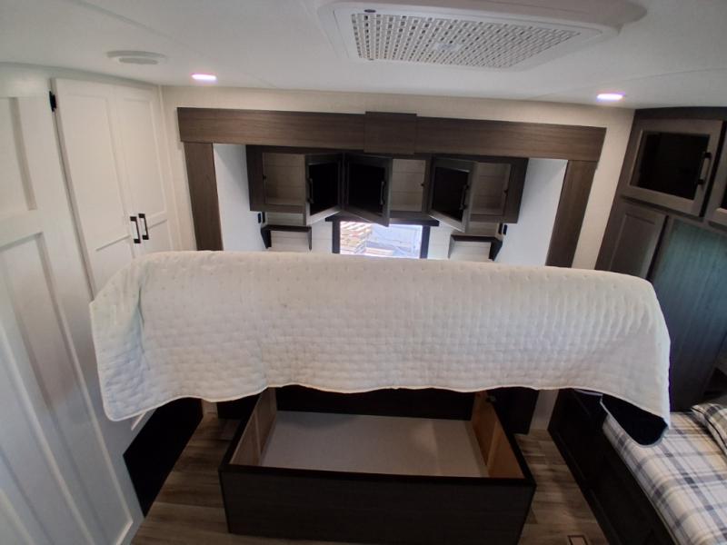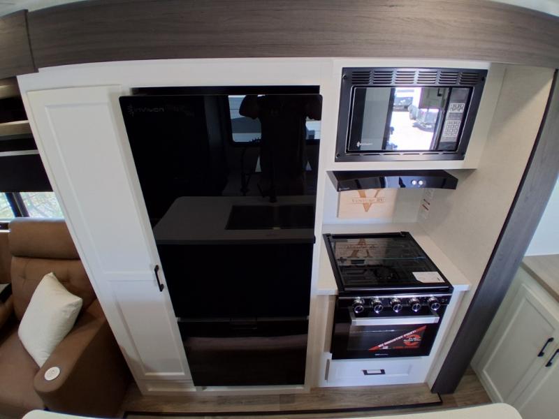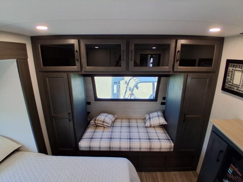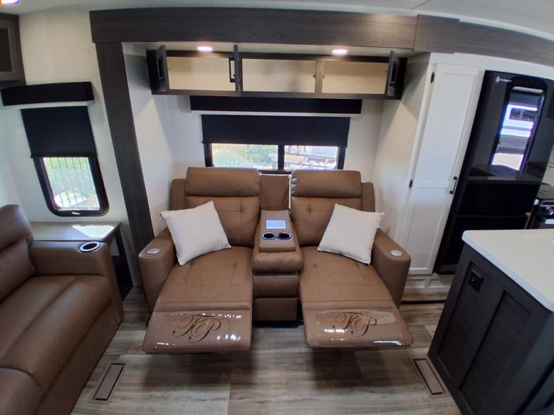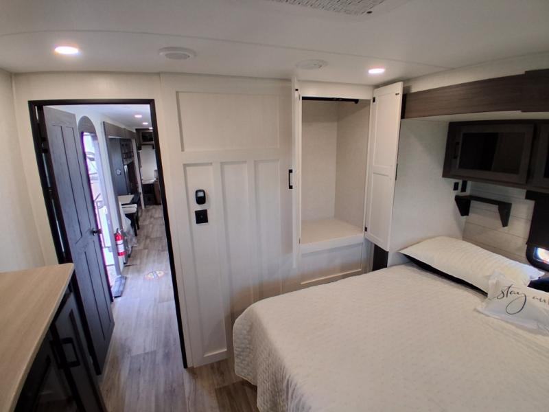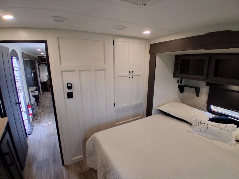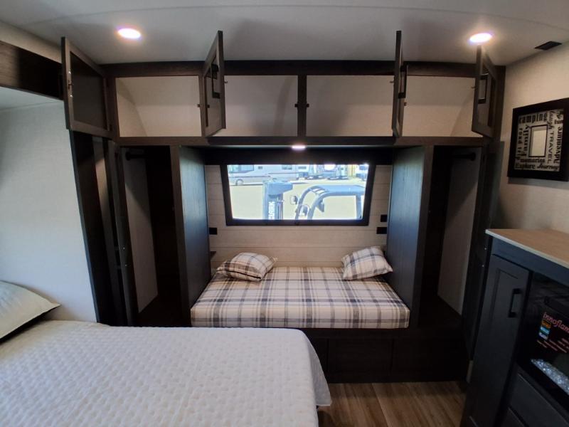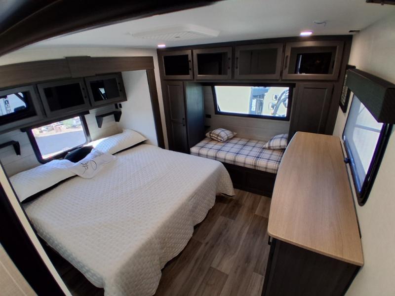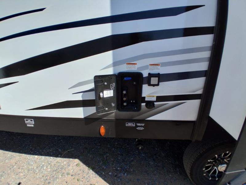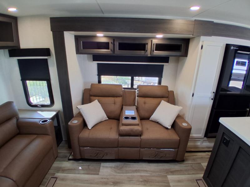 Pack your bags and hitch up this travel trailer for a great weekend camping trip! The front private bedroom has a 70" x 80" Sleep Tight king bed slide to lay your head at night, a dresser with a 30" frameless fireplace, a window seat with shelves on either side for your books, and a wardrobe with washer and dryer prep. Freshen up each morning in the full bathroom with the 30" x 36" shower then head to the kitchen to fry up some eggs on the three burner cooktop and pour a cold glass of orange juice stored in the 10 cu. ft. refrigerator. The kitchen island will make your meal prepping easier and the table and chairs offer a comfortable place to enjoy your meals or play card games. You could even cook your meals at the exterior campfire café and set up a table underneath one of the two power awnings!