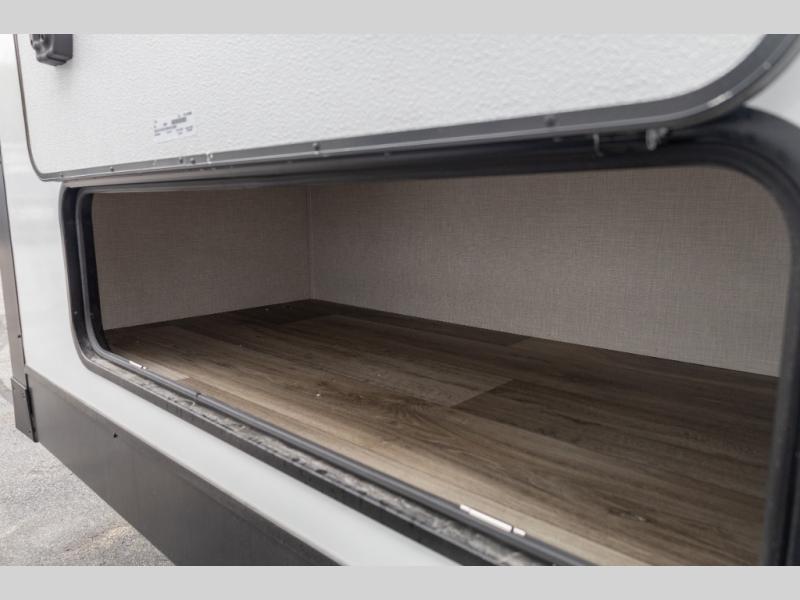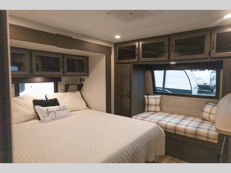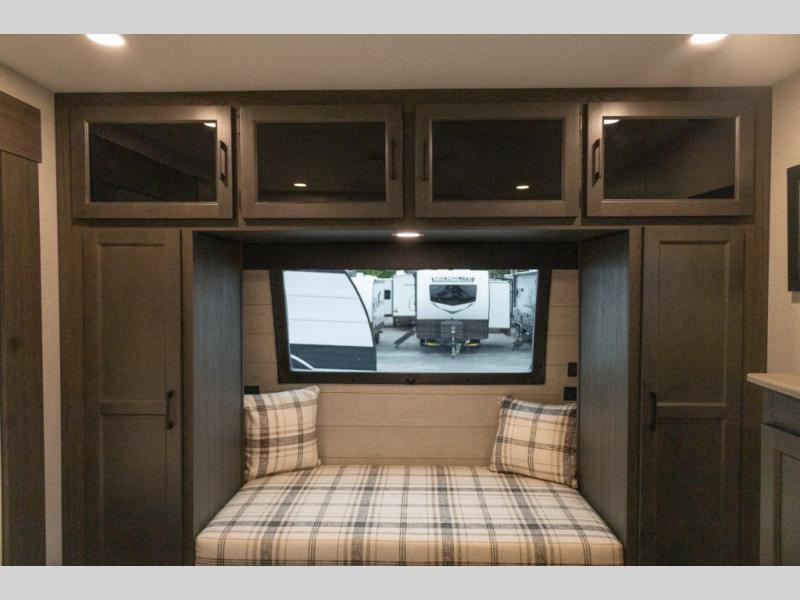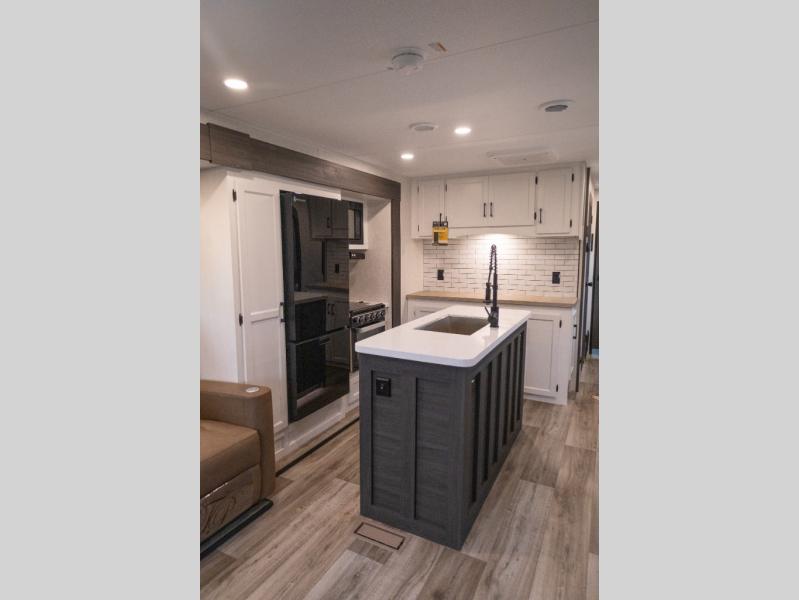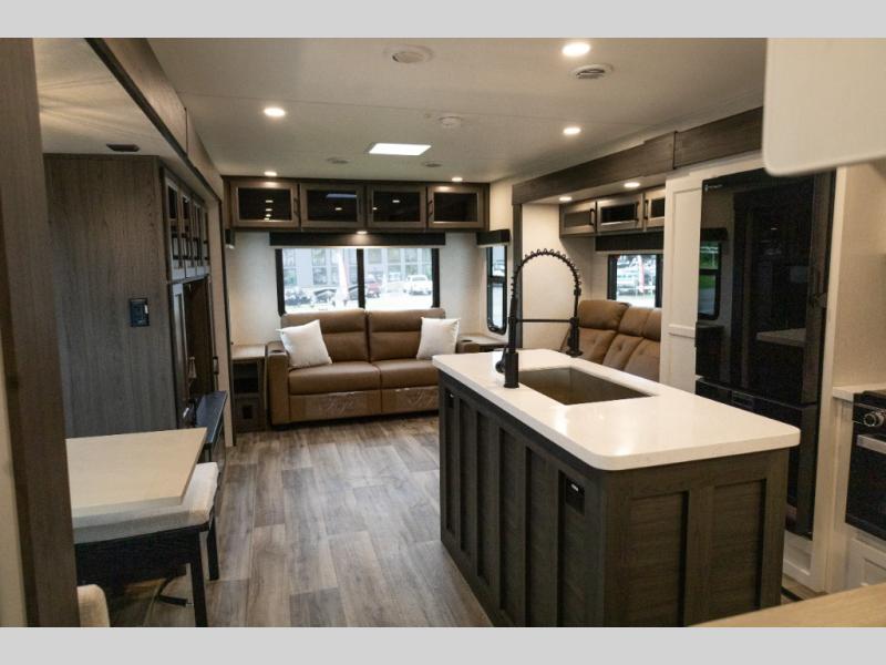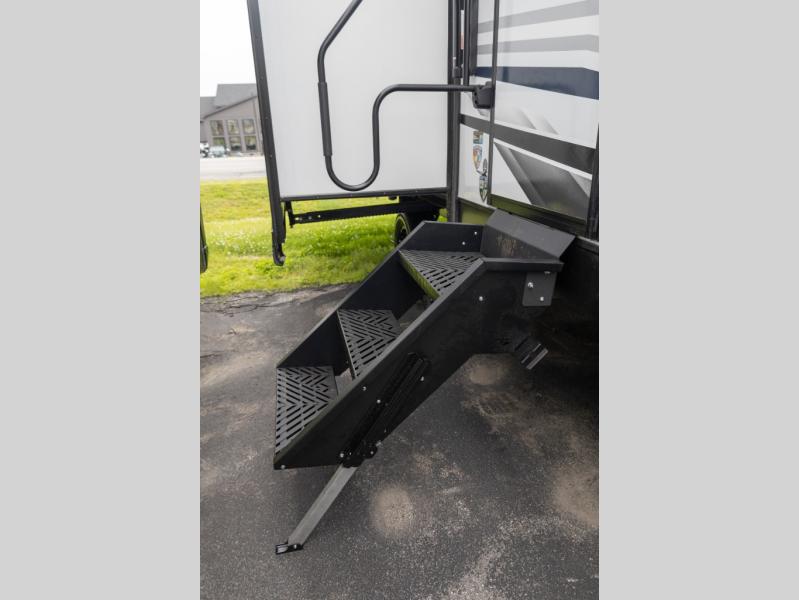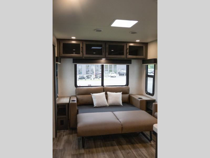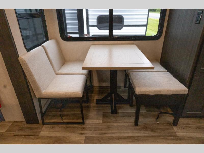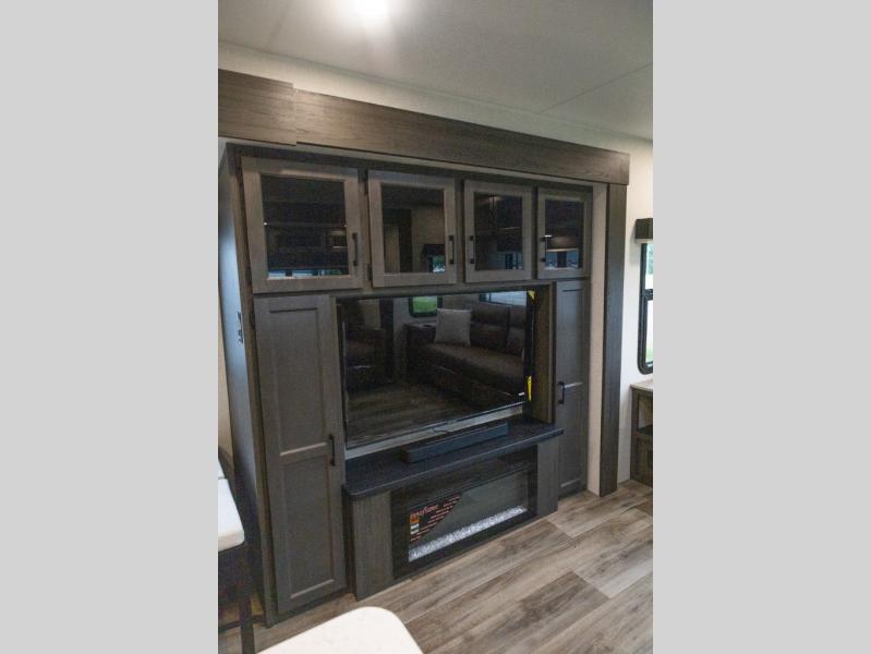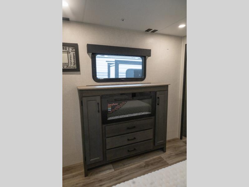 Pack your bags and hitch up this travel trailer for a great weekend camping trip! The front private bedroom has a 70" x 80" Sleep Tight king bed slide to lay your head at night, a dresser with a 30" frameless fireplace, a window seat with shelves on either side for your books, and a wardrobe with washer and dryer prep. Freshen up each morning in the full bathroom with the 30" x 36" shower then head to the kitchen to fry up some eggs on the three burner cooktop and pour a cold glass of orange juice stored in the 10 cu. ft. refrigerator. The kitchen island will make your meal prepping easier and the table and chairs offer a comfortable place to enjoy your meals or play card games. You could even cook your meals at the exterior campfire café and set up a table underneath one of the two power awnings!