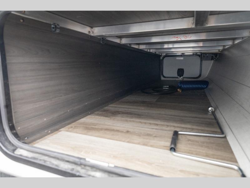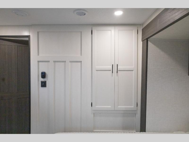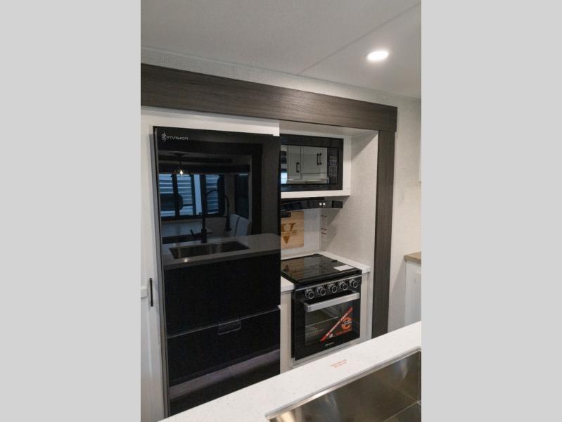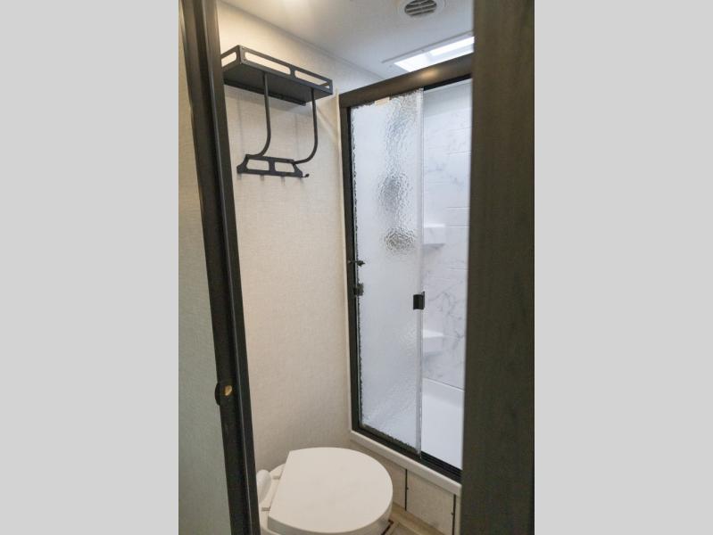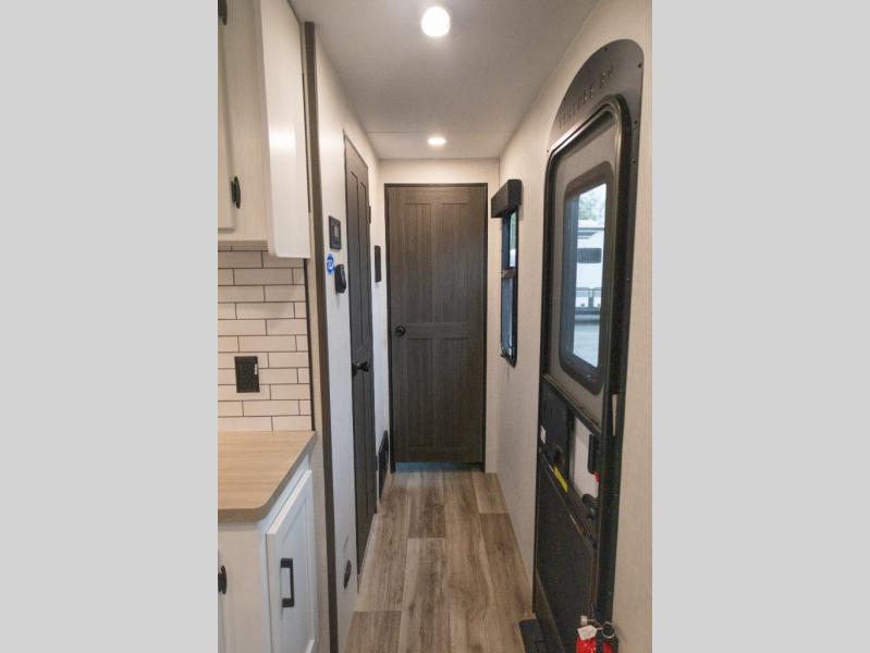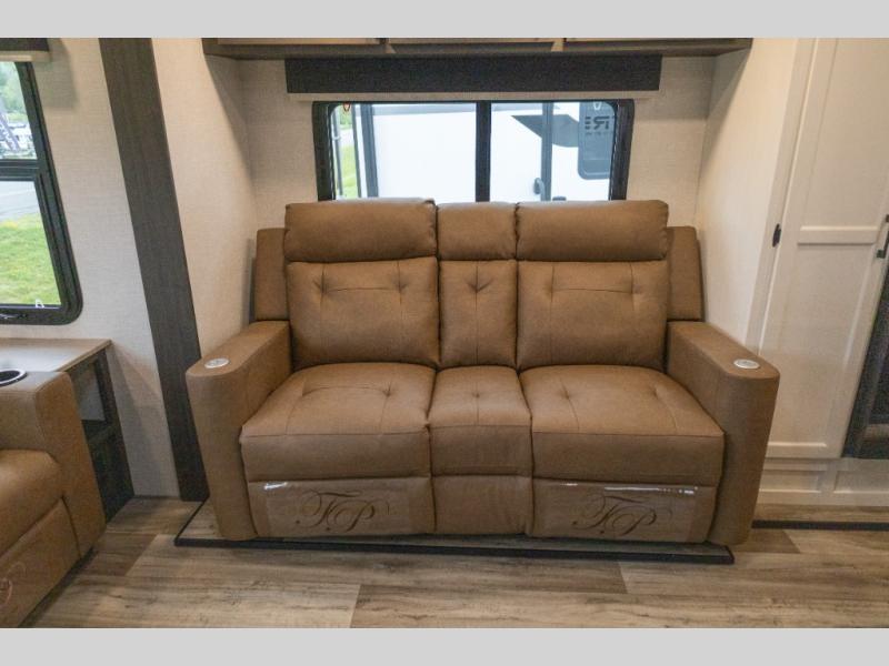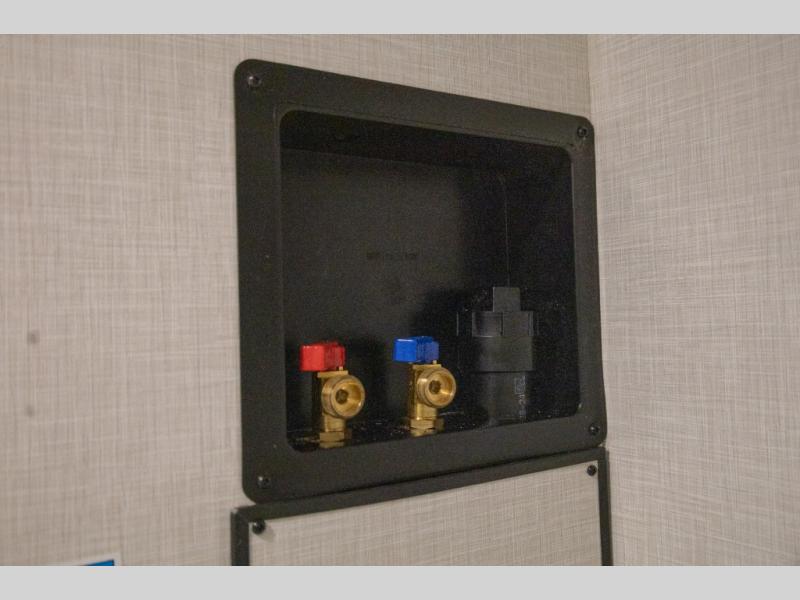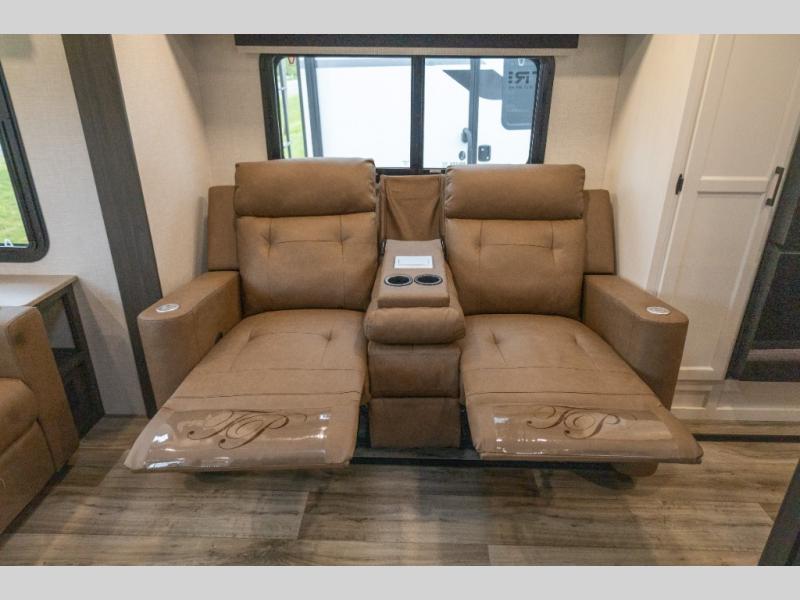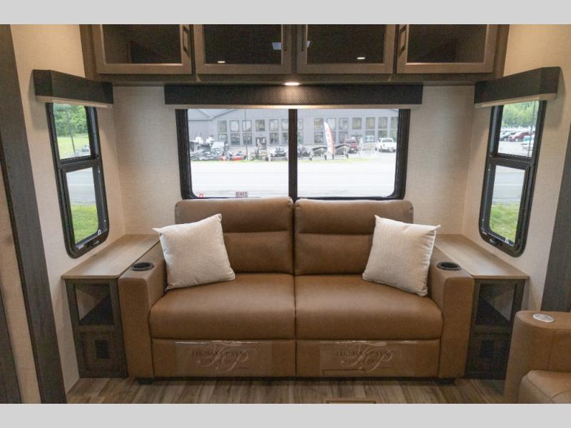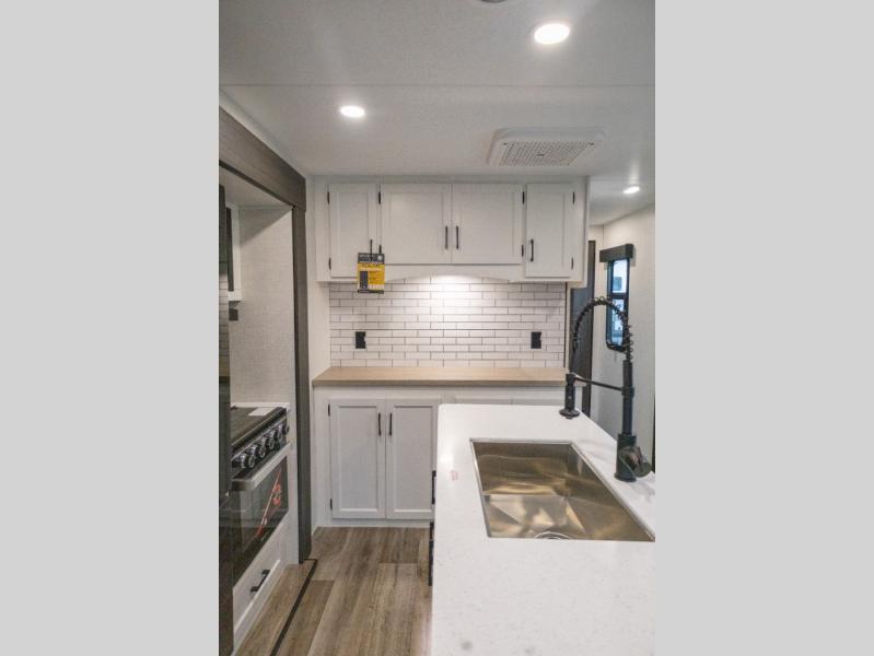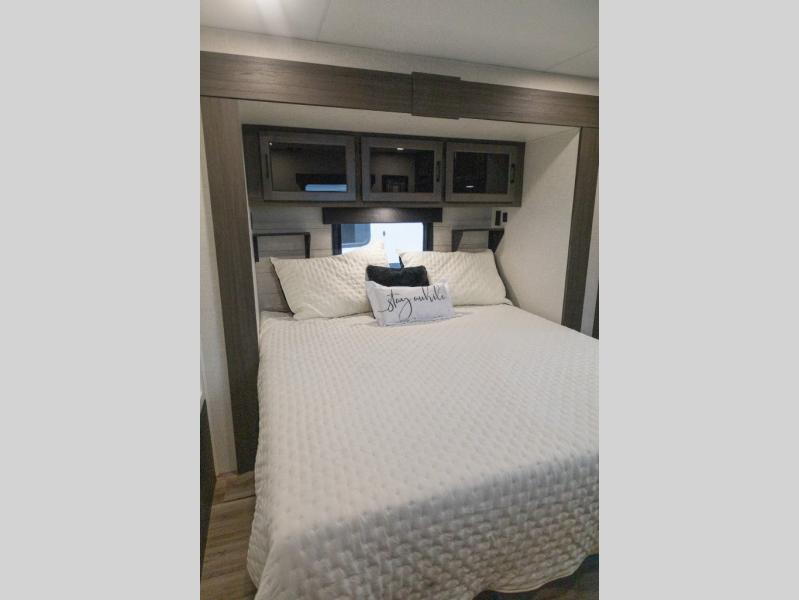 Pack your bags and hitch up this travel trailer for a great weekend camping trip! The front private bedroom has a 70" x 80" Sleep Tight king bed slide to lay your head at night, a dresser with a 30" frameless fireplace, a window seat with shelves on either side for your books, and a wardrobe with washer and dryer prep. Freshen up each morning in the full bathroom with the 30" x 36" shower then head to the kitchen to fry up some eggs on the three burner cooktop and pour a cold glass of orange juice stored in the 10 cu. ft. refrigerator. The kitchen island will make your meal prepping easier and the table and chairs offer a comfortable place to enjoy your meals or play card games. You could even cook your meals at the exterior campfire café and set up a table underneath one of the two power awnings!