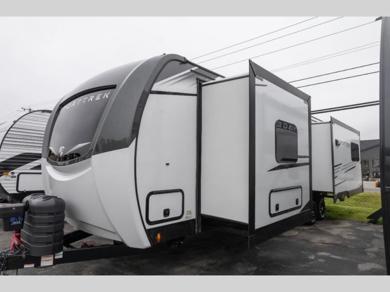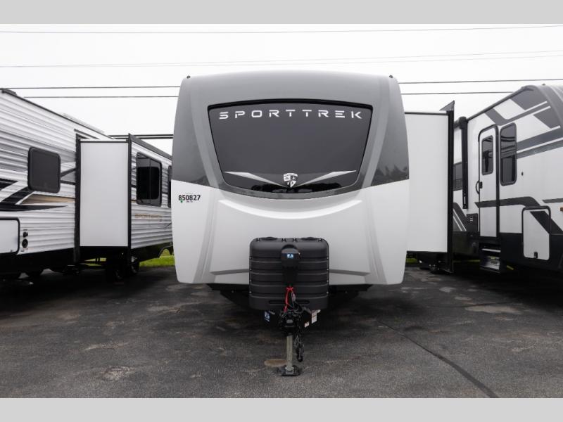 An elegant design and new features come with every one of these Venture RV SportTrek Touring Edition travel trailers! The NXG Huck bolt frame holds these units together and a walkable roof covers them. Heads will turn down the highway and at the campsite with an upgraded graphics package and a painted fiberglass front cap with integrated LED light. The exterior pass-through storage area has slam latch baggage doors with magnetic catches so you don't have to worry about them closing on you and a motion activated light to see your items clearly even at night. Luxury abounds throughout these units, especially with the mandatory Interior Luxury package which comes solid surface kitchen countertops, designer valances with fabric nightshades, two 30" frameless fireplaces, and Beauflor wood plank flooring that is easy to clean. Come find your favorite model today!