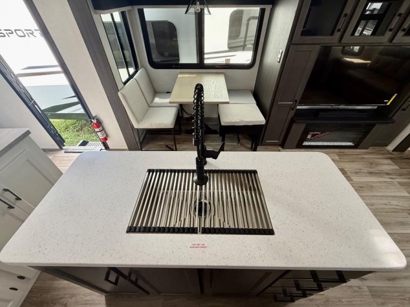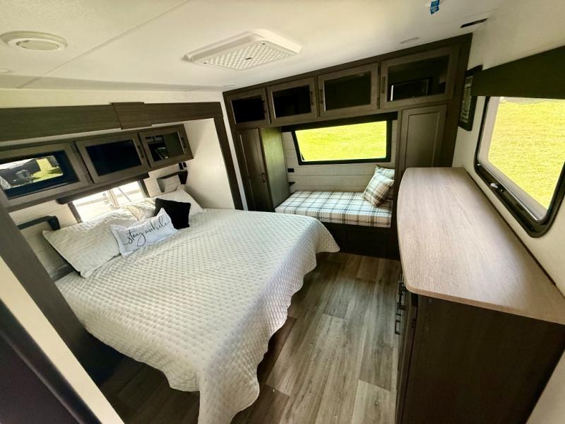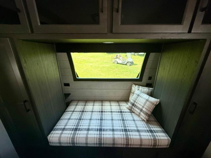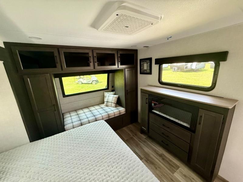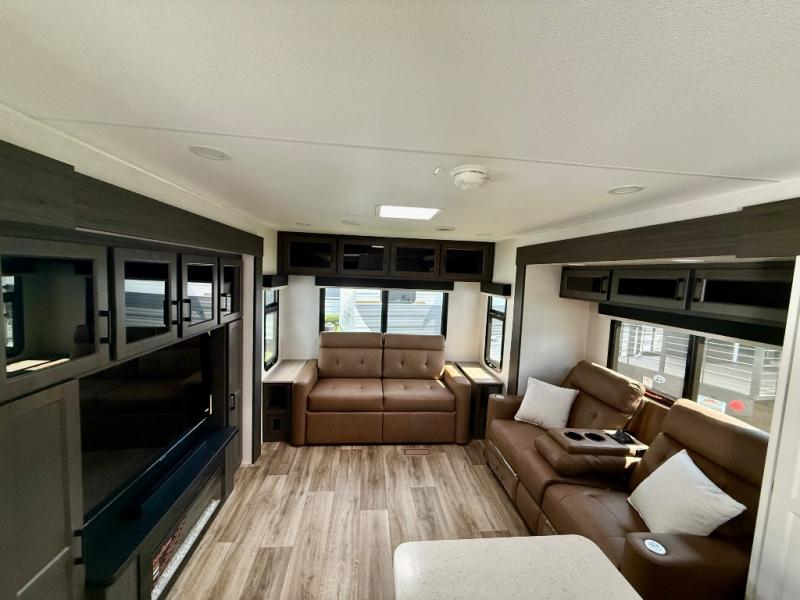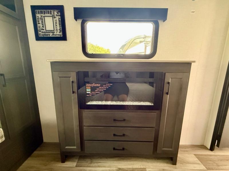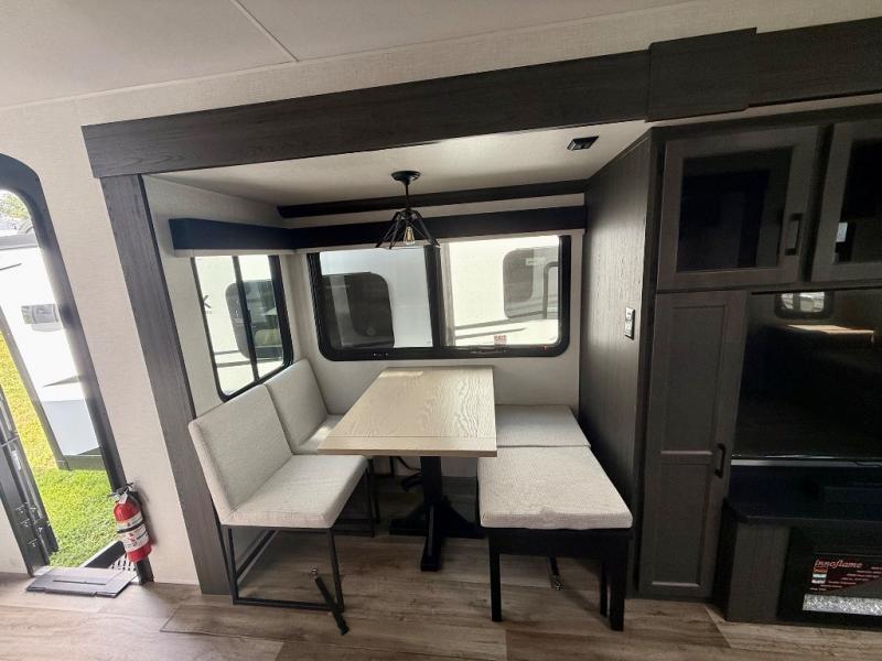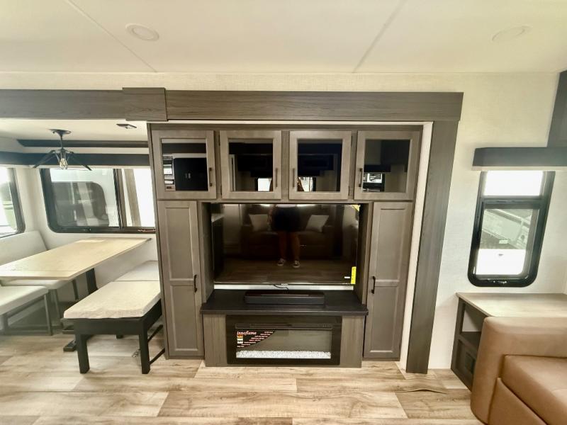 Pack your bags and hitch up this travel trailer for a great weekend camping trip! The front private bedroom has a 70" x 80" Sleep Tight king bed slide to lay your head at night, a dresser with a 30" frameless fireplace, a window seat with shelves on either side for your books, and a wardrobe with washer and dryer prep. Freshen up each morning in the full bathroom with the 30" x 36" shower then head to the kitchen to fry up some eggs on the three burner cooktop and pour a cold glass of orange juice stored in the 10 cu. ft. refrigerator. The kitchen island will make your meal prepping easier and the table and chairs offer a comfortable place to enjoy your meals or play card games. You could even cook your meals at the exterior campfire café and set up a table underneath one of the two power awnings!