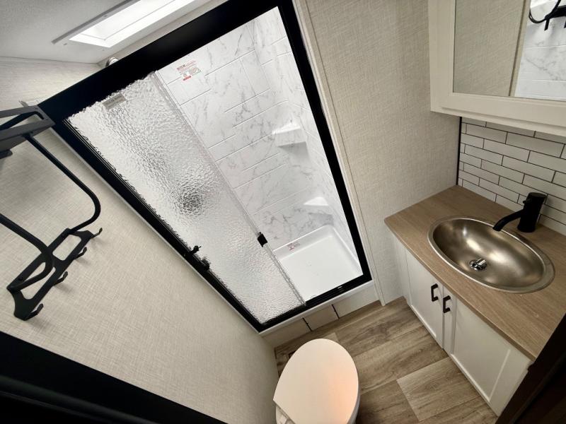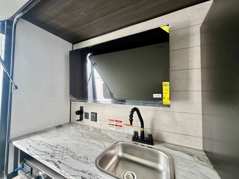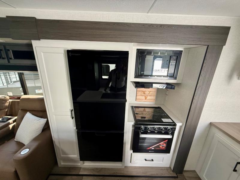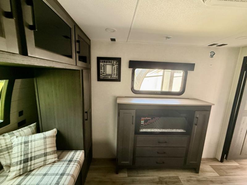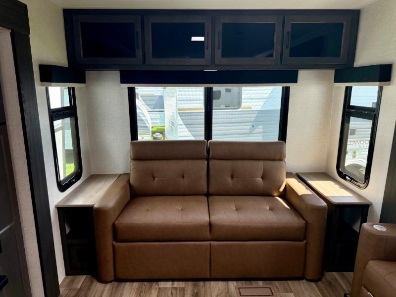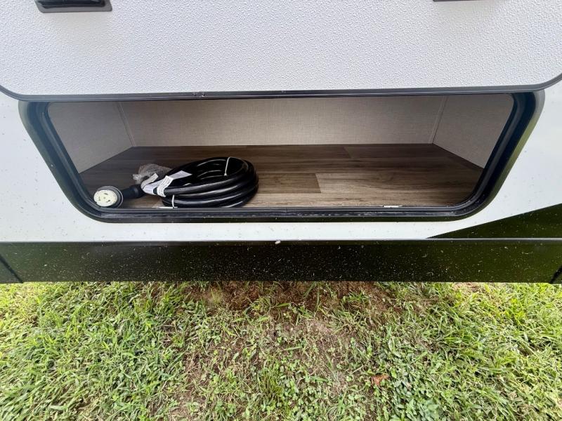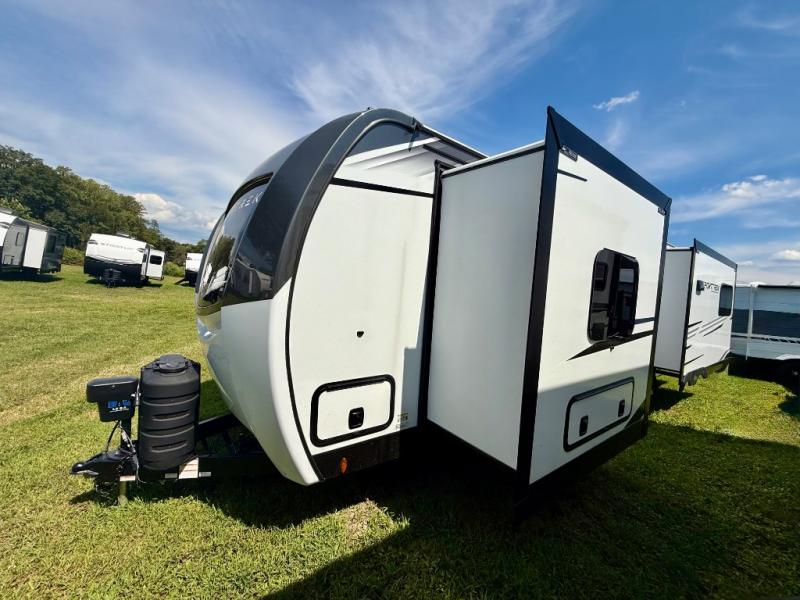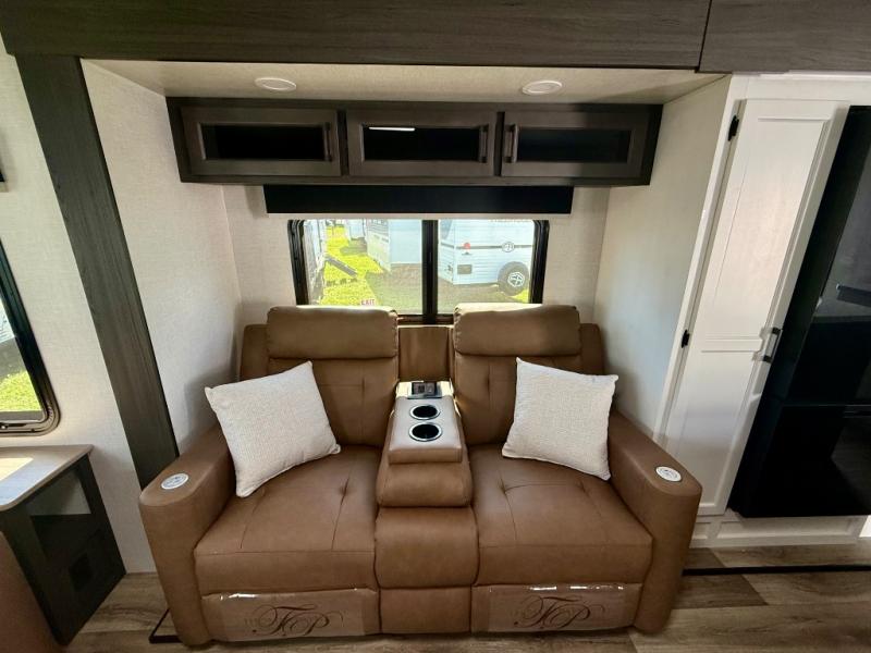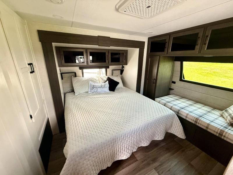 Pack your bags and hitch up this travel trailer for a great weekend camping trip! The front private bedroom has a 70" x 80" Sleep Tight king bed slide to lay your head at night, a dresser with a 30" frameless fireplace, a window seat with shelves on either side for your books, and a wardrobe with washer and dryer prep. Freshen up each morning in the full bathroom with the 30" x 36" shower then head to the kitchen to fry up some eggs on the three burner cooktop and pour a cold glass of orange juice stored in the 10 cu. ft. refrigerator. The kitchen island will make your meal prepping easier and the table and chairs offer a comfortable place to enjoy your meals or play card games. You could even cook your meals at the exterior campfire café and set up a table underneath one of the two power awnings!