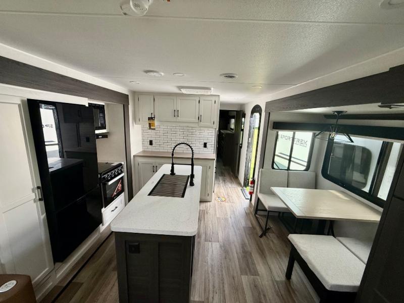 An elegant design and new features come with every one of these Venture RV SportTrek Touring Edition travel trailers! The NXG Huck bolt frame holds these units together and a walkable roof covers them. Heads will turn down the highway and at the campsite with an upgraded graphics package and a painted fiberglass front cap with integrated LED light. The exterior pass-through storage area has slam latch baggage doors with magnetic catches so you don't have to worry about them closing on you and a motion activated light to see your items clearly even at night. Luxury abounds throughout these units, especially with the mandatory Interior Luxury package which comes solid surface kitchen countertops, designer valances with fabric nightshades, two 30" frameless fireplaces, and Beauflor wood plank flooring that is easy to clean. Come find your favorite model today!