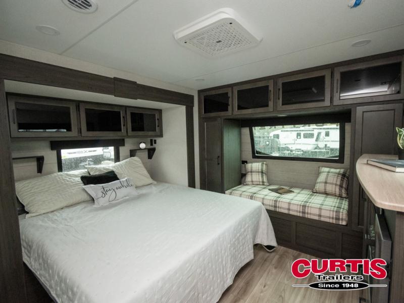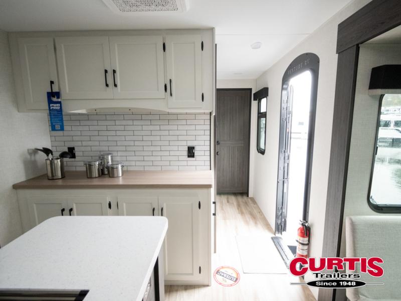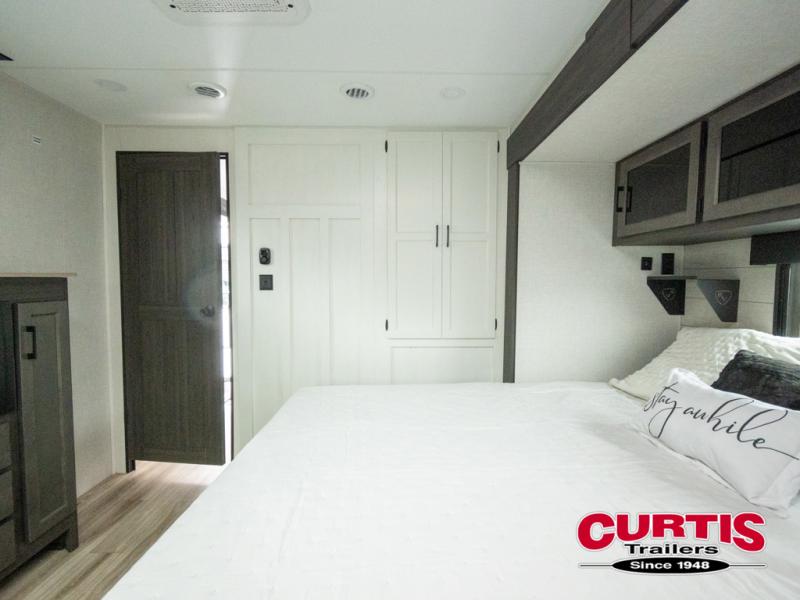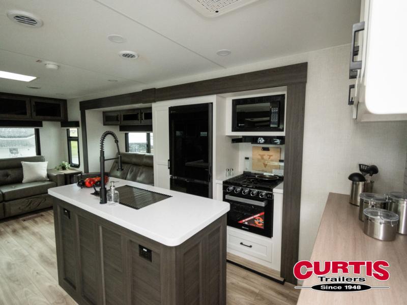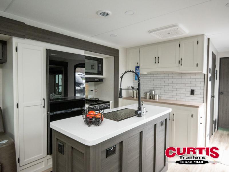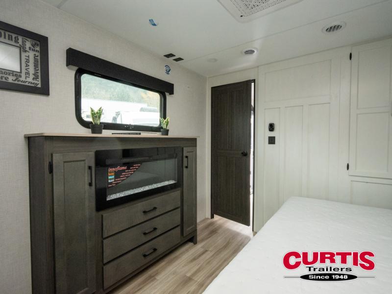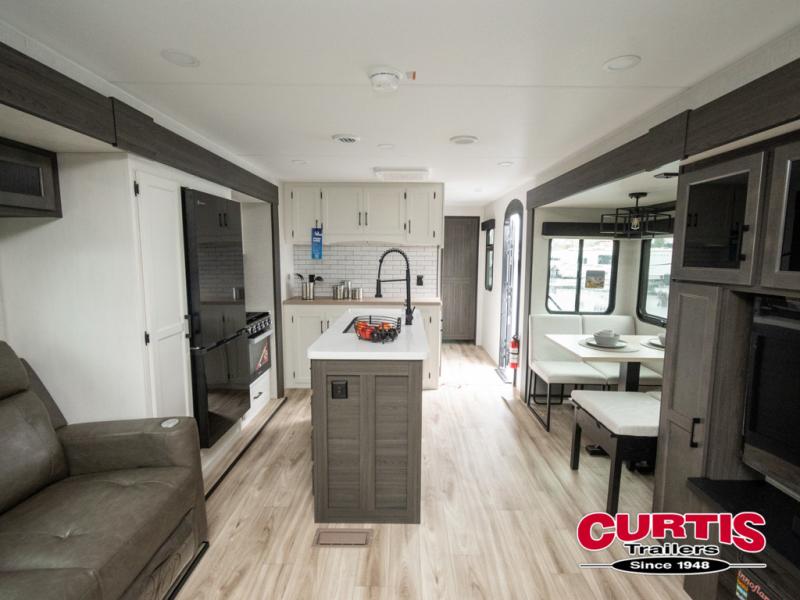 Pack your bags and hitch up this travel trailer for a great weekend camping trip! The front private bedroom has a 70" x 80" Sleep Tight king bed slide to lay your head at night, a dresser with a 30" frameless fireplace, a window seat with shelves on either side for your books, and a wardrobe with washer and dryer prep. Freshen up each morning in the full bathroom with the 30" x 36" shower then head to the kitchen to fry up some eggs on the three burner cooktop and pour a cold glass of orange juice stored in the 10 cu. ft. refrigerator. The kitchen island will make your meal prepping easier and the table and chairs offer a comfortable place to enjoy your meals or play card games. You could even cook your meals at the exterior campfire café and set up a table underneath one of the two power awnings!