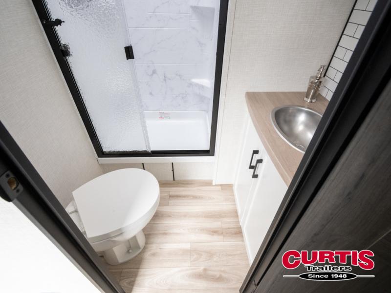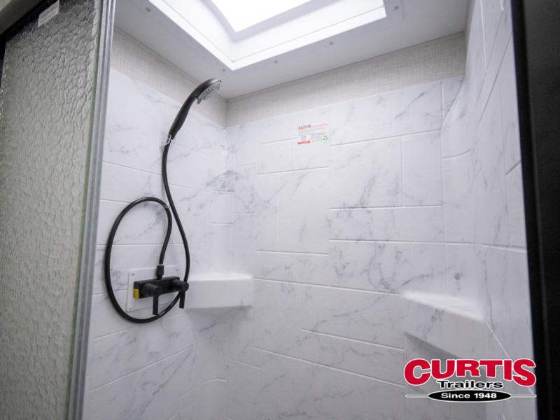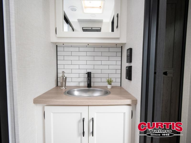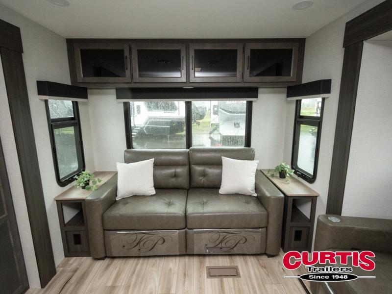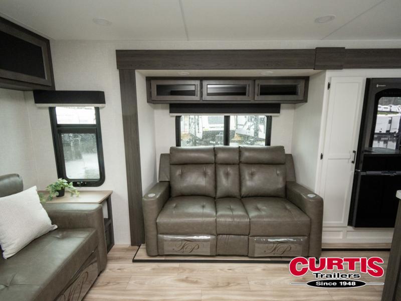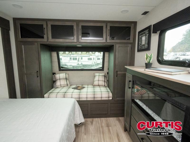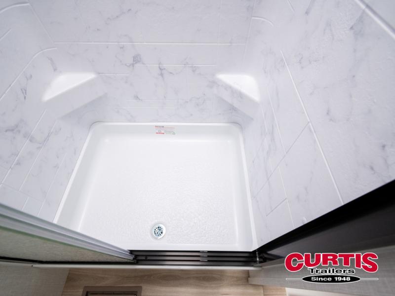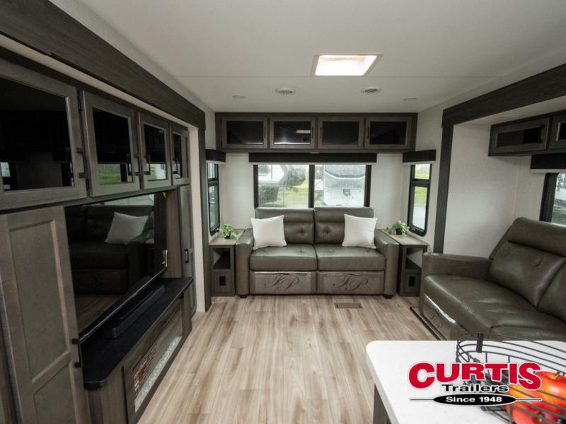 Pack your bags and hitch up this travel trailer for a great weekend camping trip! The front private bedroom has a 70" x 80" Sleep Tight king bed slide to lay your head at night, a dresser with a 30" frameless fireplace, a window seat with shelves on either side for your books, and a wardrobe with washer and dryer prep. Freshen up each morning in the full bathroom with the 30" x 36" shower then head to the kitchen to fry up some eggs on the three burner cooktop and pour a cold glass of orange juice stored in the 10 cu. ft. refrigerator. The kitchen island will make your meal prepping easier and the table and chairs offer a comfortable place to enjoy your meals or play card games. You could even cook your meals at the exterior campfire café and set up a table underneath one of the two power awnings!