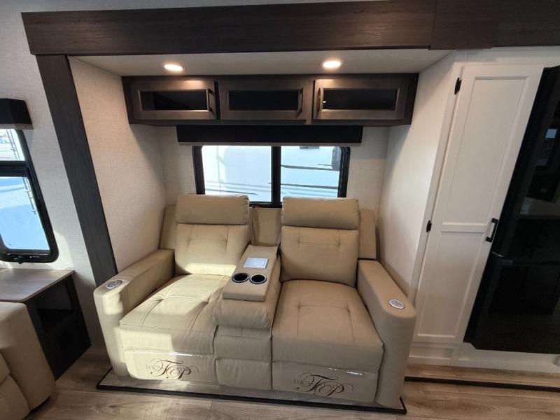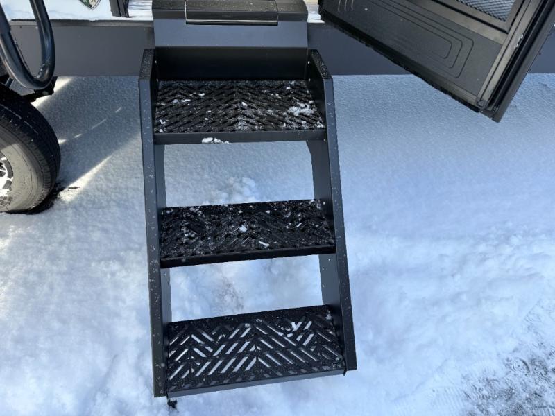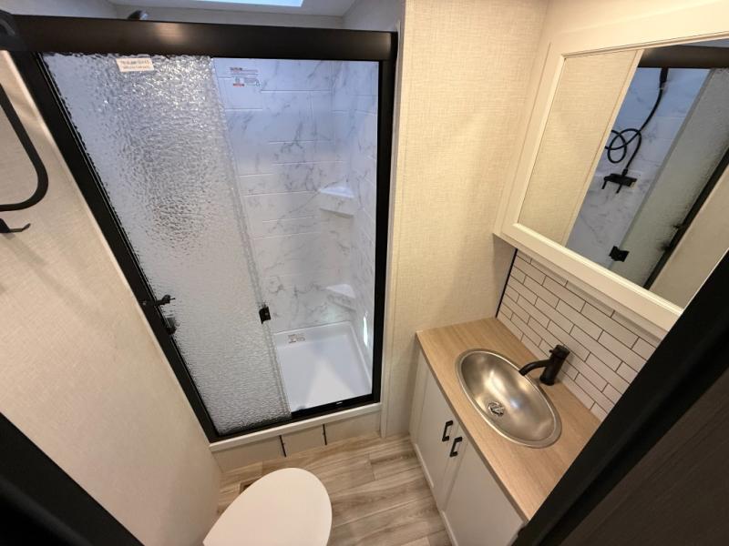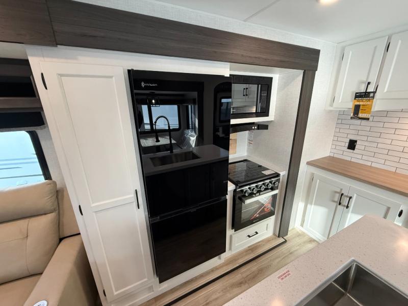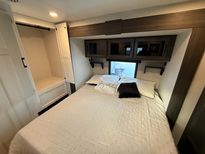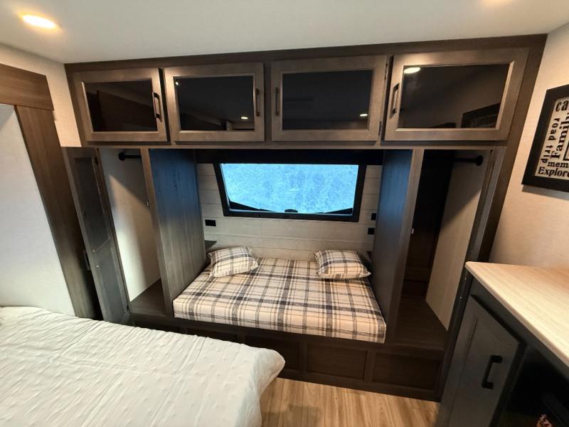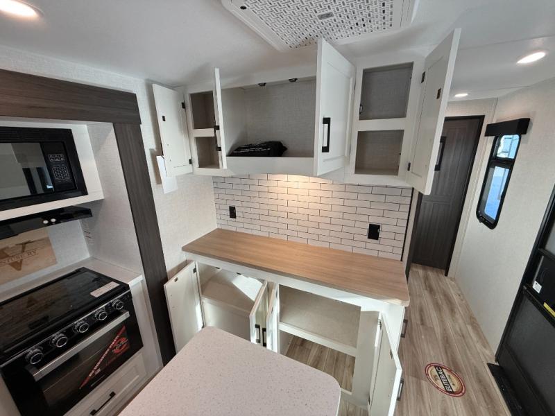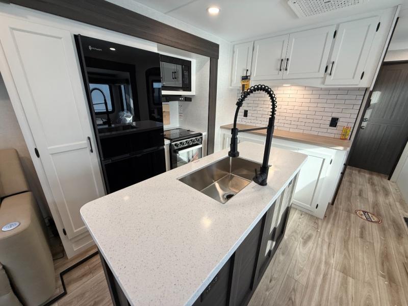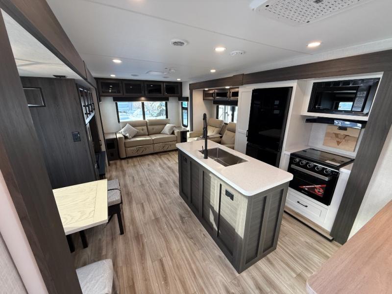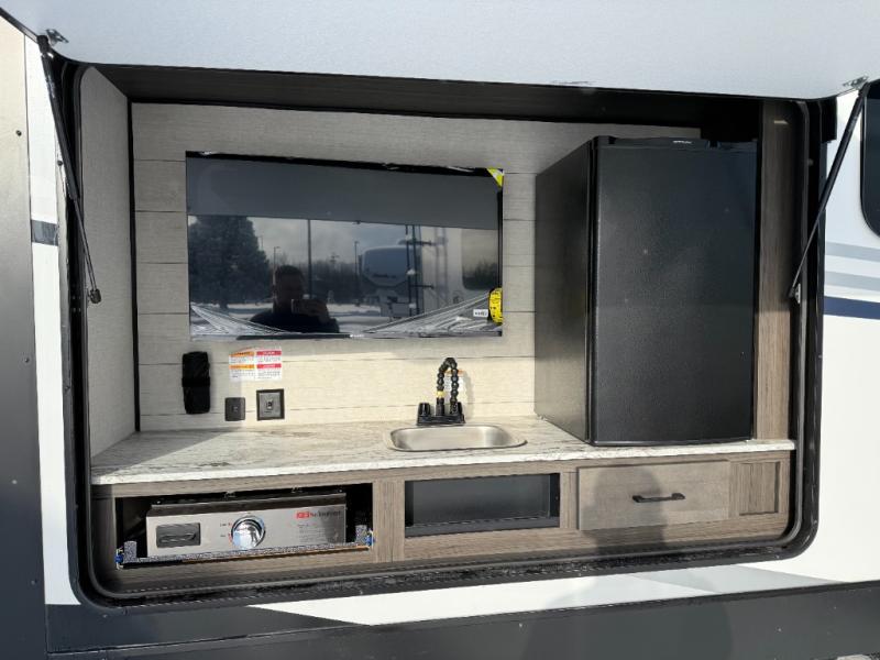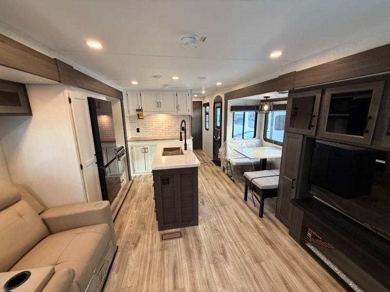 Pack your bags and hitch up this travel trailer for a great weekend camping trip! The front private bedroom has a 70" x 80" Sleep Tight king bed slide to lay your head at night, a dresser with a 30" frameless fireplace, a window seat with shelves on either side for your books, and a wardrobe with washer and dryer prep. Freshen up each morning in the full bathroom with the 30" x 36" shower then head to the kitchen to fry up some eggs on the three burner cooktop and pour a cold glass of orange juice stored in the 10 cu. ft. refrigerator. The kitchen island will make your meal prepping easier and the table and chairs offer a comfortable place to enjoy your meals or play card games. You could even cook your meals at the exterior campfire café and set up a table underneath one of the two power awnings!