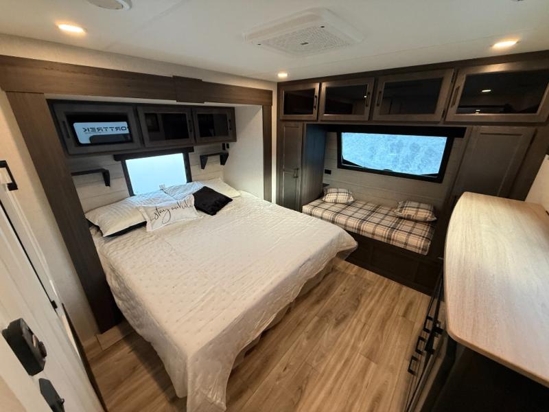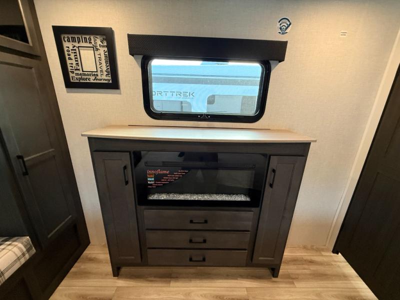An elegant design and new features come with every one of these Venture RV SportTrek Touring Edition travel trailers! The NXG Huck bolt frame holds these units together and a walkable roof covers them. Heads will turn down the highway and at the campsite with an upgraded graphics package and a painted fiberglass front cap with integrated LED light. The exterior pass-through storage area has slam latch baggage doors with magnetic catches so you don't have to worry about them closing on you and a motion activated light to see your items clearly even at night. Luxury abounds throughout these units, especially with the mandatory Interior Luxury package which comes solid surface kitchen countertops, designer valances with fabric nightshades, two 30" frameless fireplaces, and Beauflor wood plank flooring that is easy to clean. Come find your favorite model today!