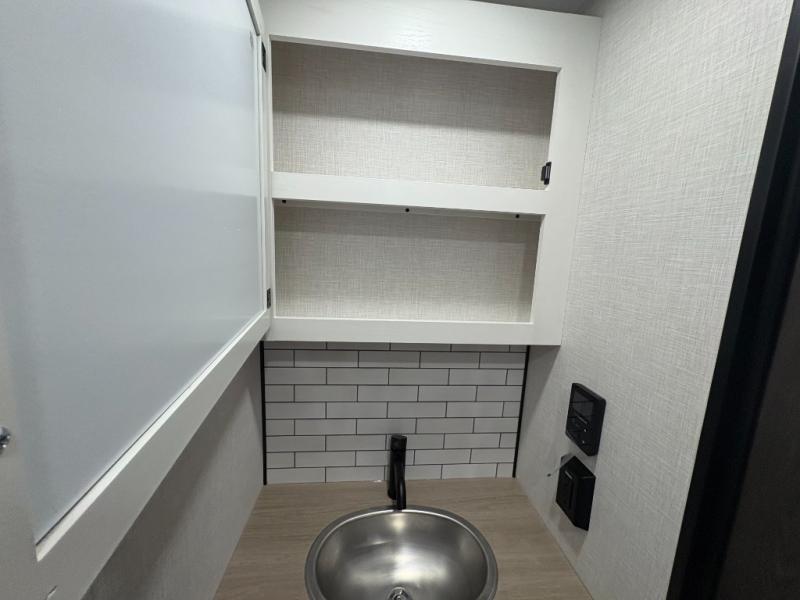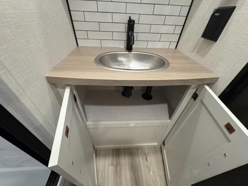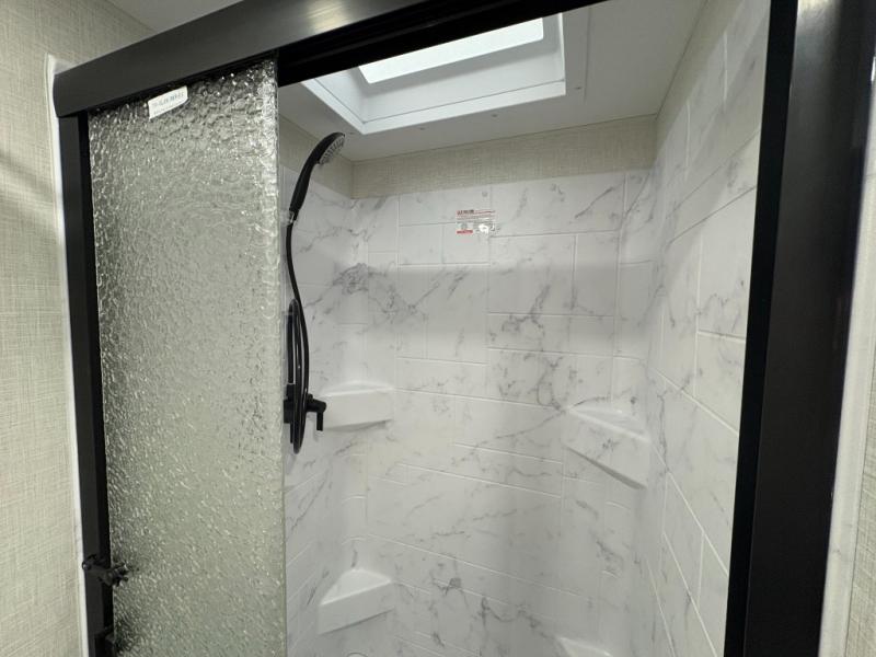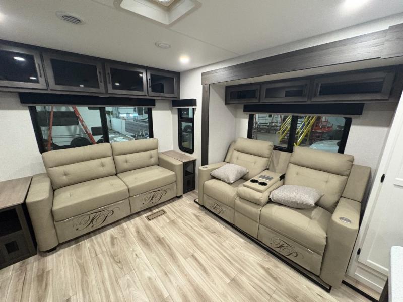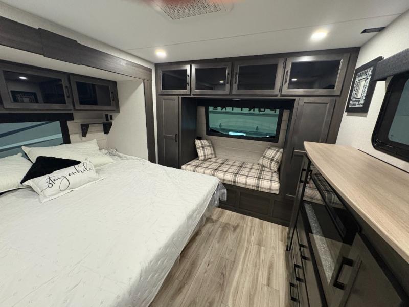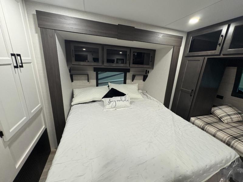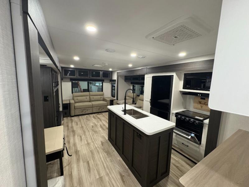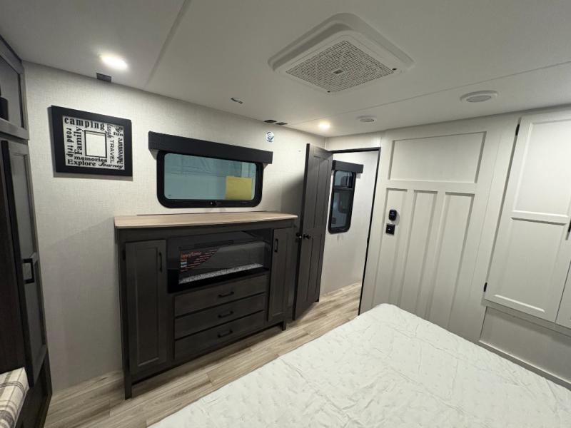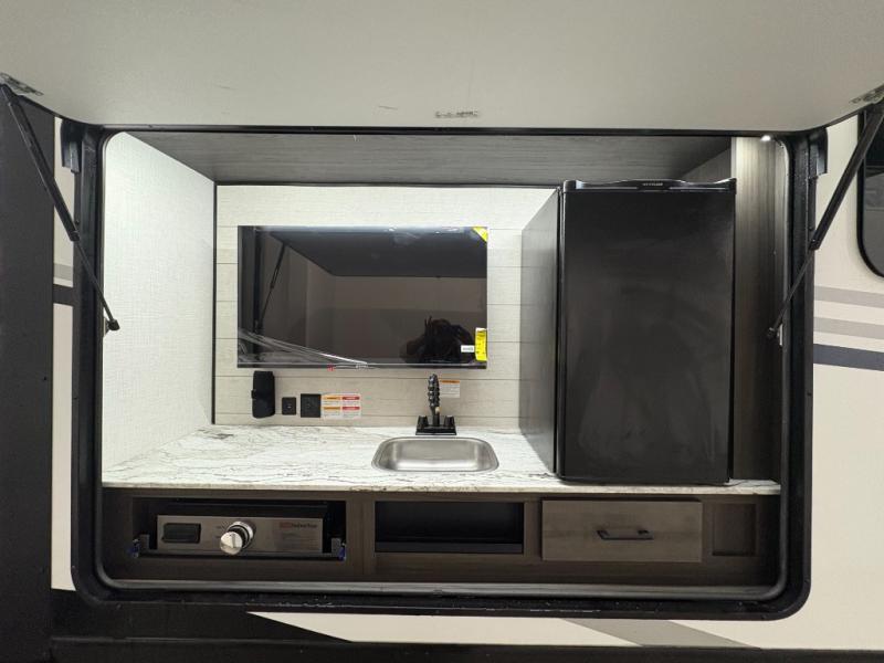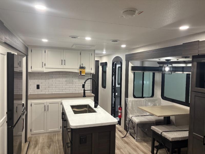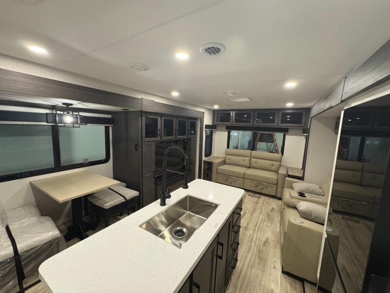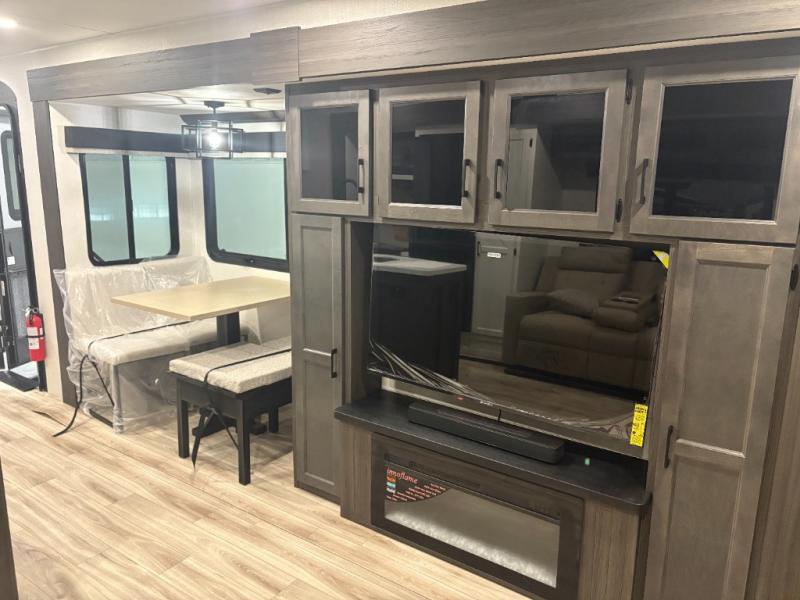 Pack your bags and hitch up this travel trailer for a great weekend camping trip! The front private bedroom has a 70" x 80" Sleep Tight king bed slide to lay your head at night, a dresser with a 30" frameless fireplace, a window seat with shelves on either side for your books, and a wardrobe with washer and dryer prep. Freshen up each morning in the full bathroom with the 30" x 36" shower then head to the kitchen to fry up some eggs on the three burner cooktop and pour a cold glass of orange juice stored in the 10 cu. ft. refrigerator. The kitchen island will make your meal prepping easier and the table and chairs offer a comfortable place to enjoy your meals or play card games. You could even cook your meals at the exterior campfire café and set up a table underneath one of the two power awnings!