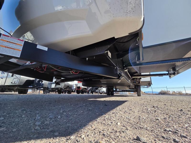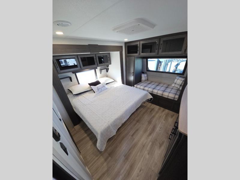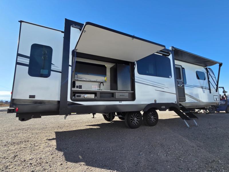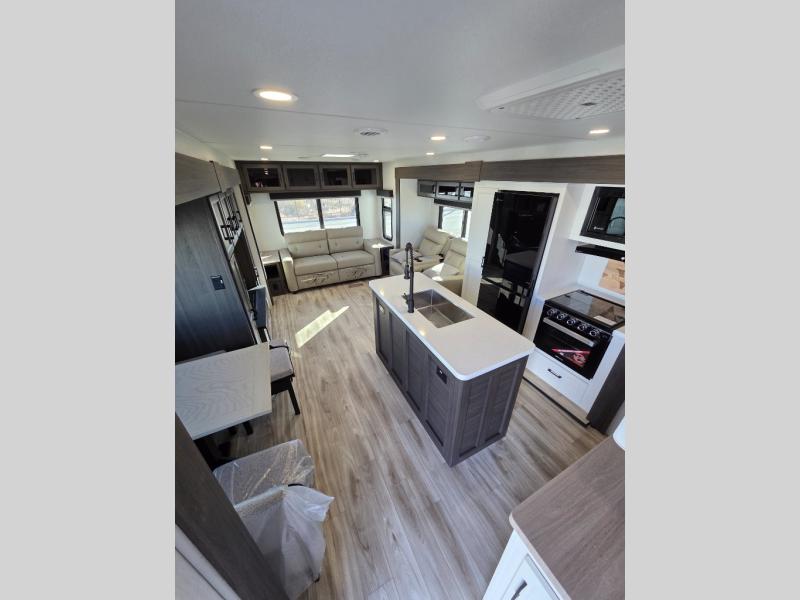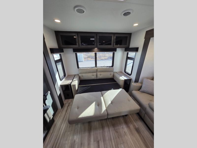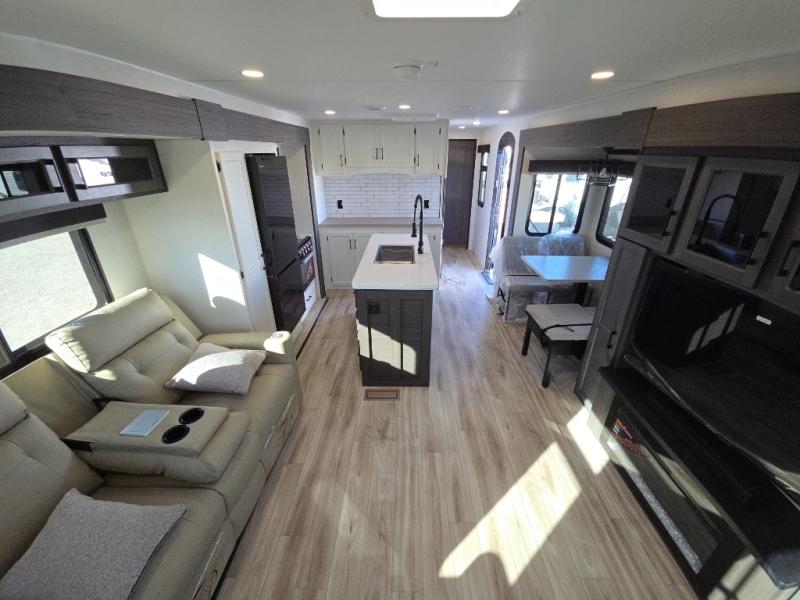 Pack your bags and hitch up this travel trailer for a great weekend camping trip! The front private bedroom has a 70" x 80" Sleep Tight king bed slide to lay your head at night, a dresser with a 30" frameless fireplace, a window seat with shelves on either side for your books, and a wardrobe with washer and dryer prep. Freshen up each morning in the full bathroom with the 30" x 36" shower then head to the kitchen to fry up some eggs on the three burner cooktop and pour a cold glass of orange juice stored in the 10 cu. ft. refrigerator. The kitchen island will make your meal prepping easier and the table and chairs offer a comfortable place to enjoy your meals or play card games. You could even cook your meals at the exterior campfire café and set up a table underneath one of the two power awnings!