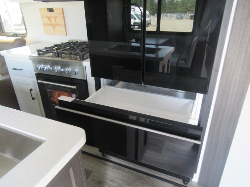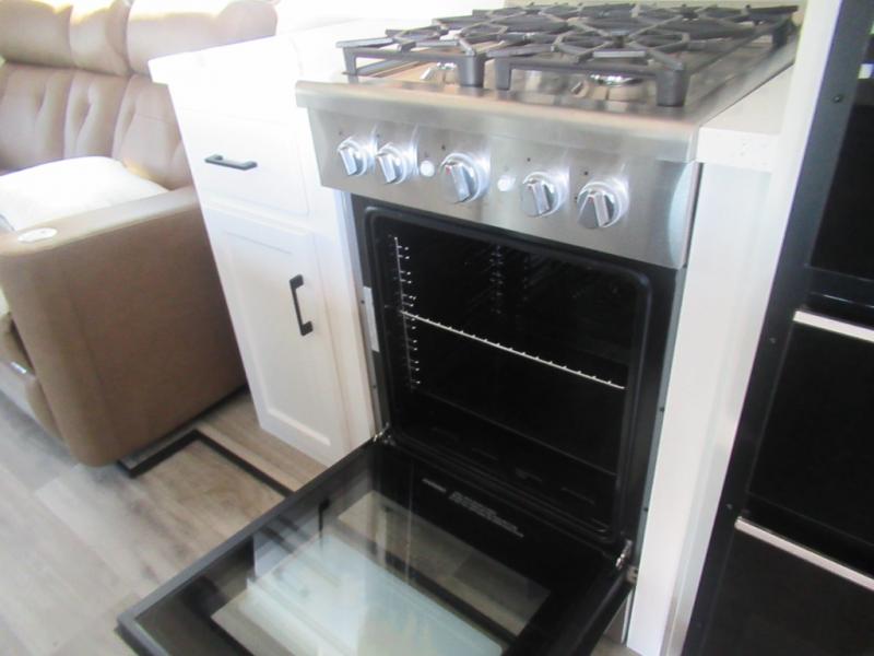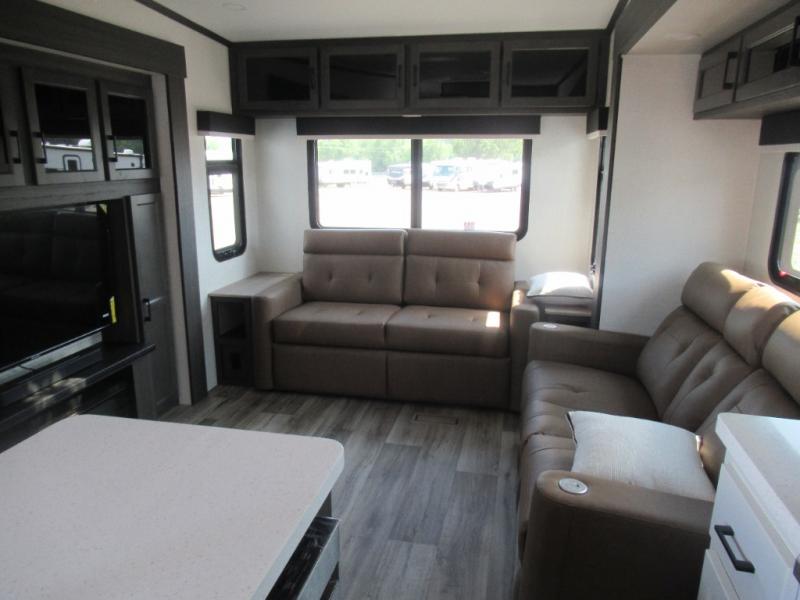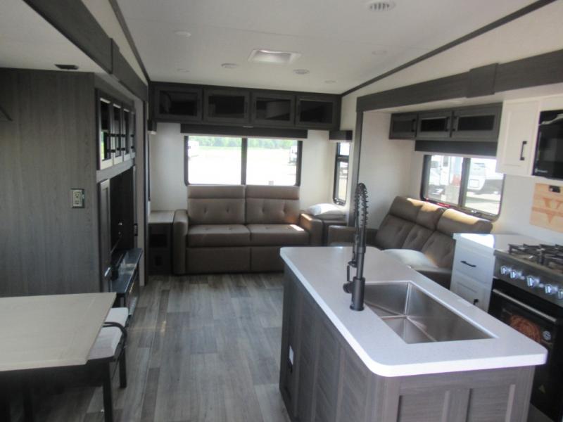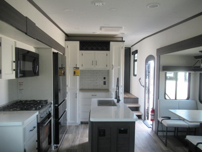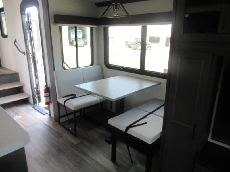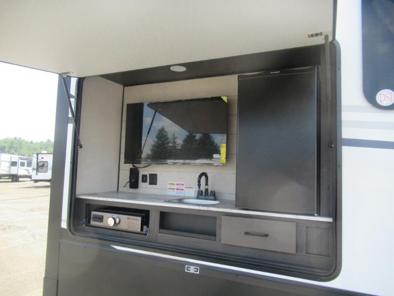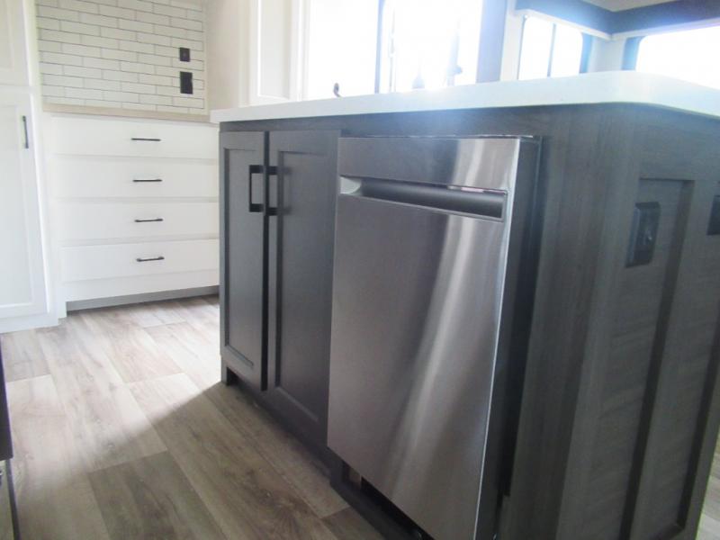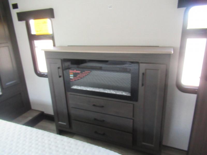 You won't even feel like you're camping in this fifth wheel! The front private bedroom has a Serta king mattress to lay your head on at night, a window seat to comfortably read a book while enjoying the 5,000 BTU fireplace, a shelf storage closet, and a prepped area for a washer and dryer. Freshen up each morning with the 48" fiberglass shower in the full bathroom then head down the floating steps with shoe storage to whip up a delicious breakfast. The fully equipped kitchen even comes with a 18" GE stainless steel dishwasher at the kitchen island for easy clean up. Enjoy your meals at the table with two chairs and two Versa benches. You could even cook at the outside campfire cafe with the griddle. Inside the rear living area, you will find a 70" tri-fold sofa with end tables and theater seating with USB charging across from the entertainment center with a 5,000 BTU fireplace!