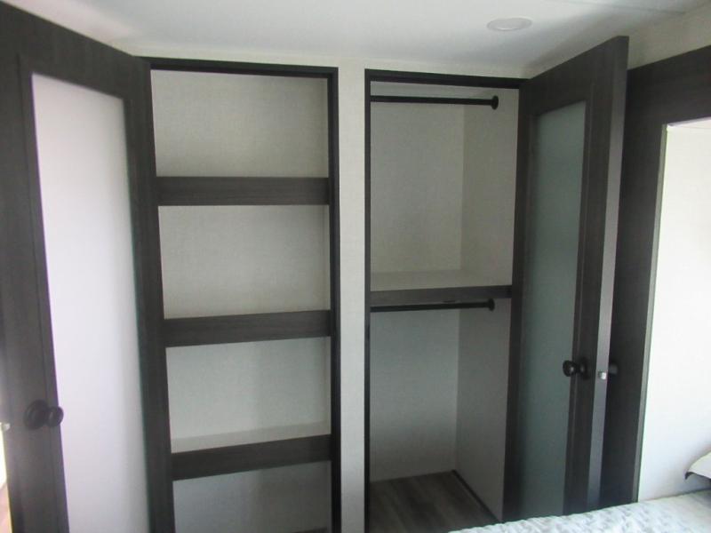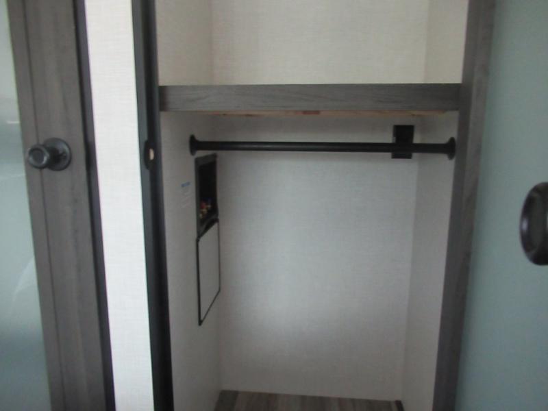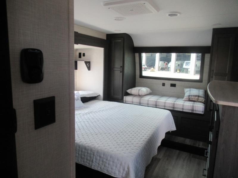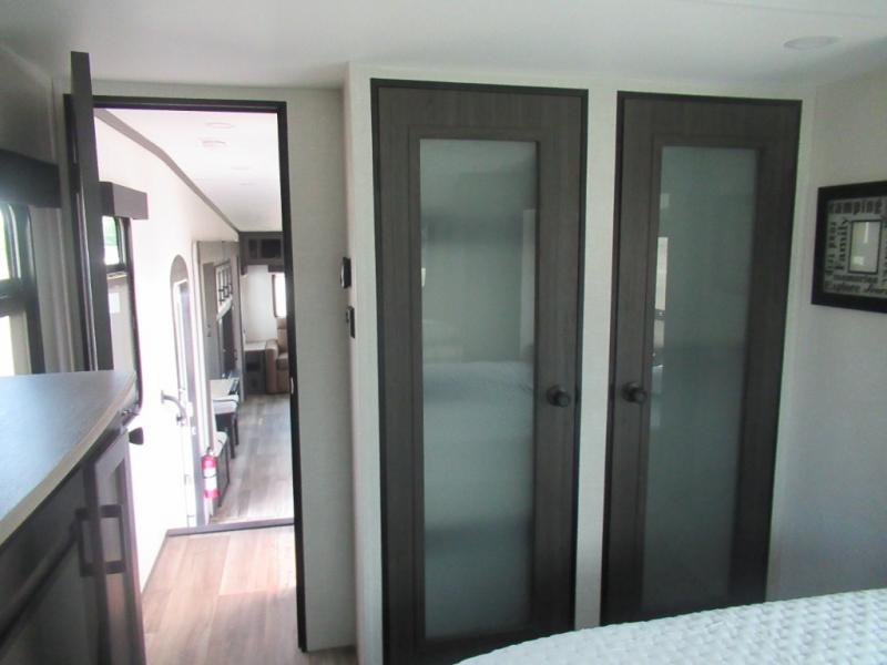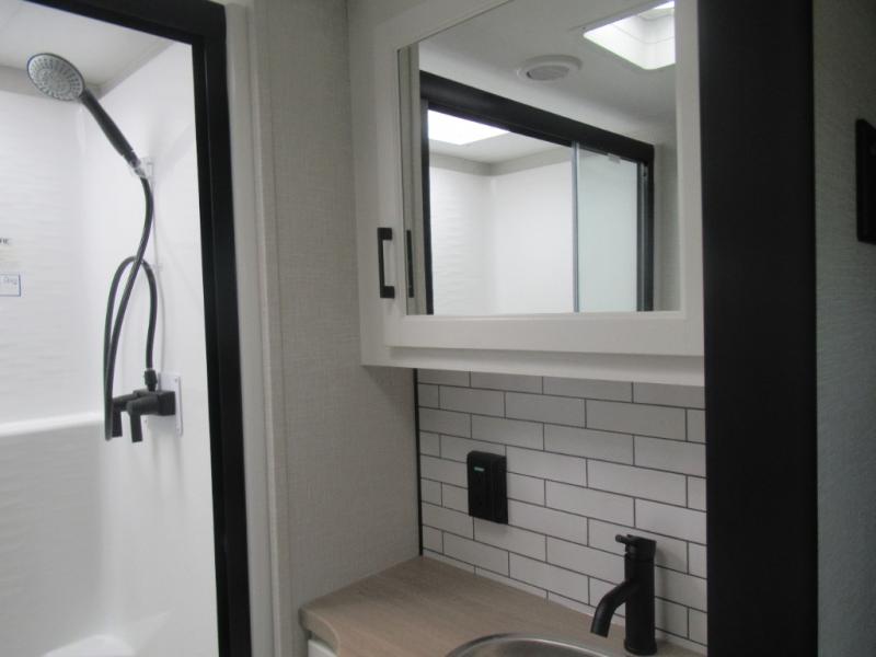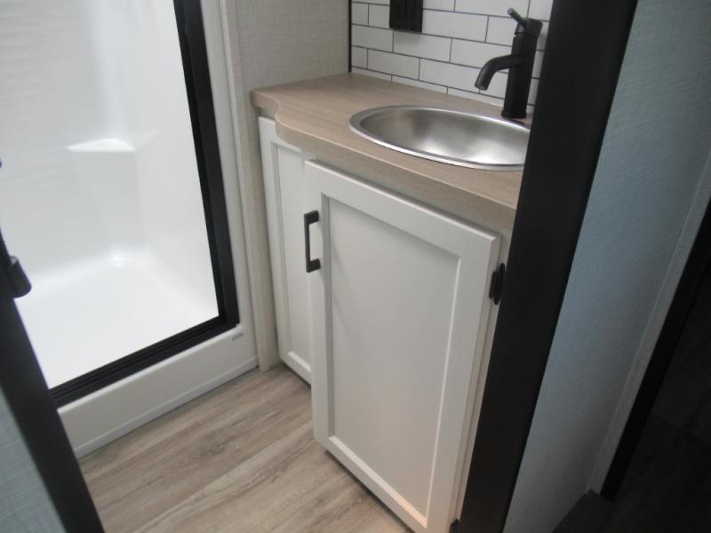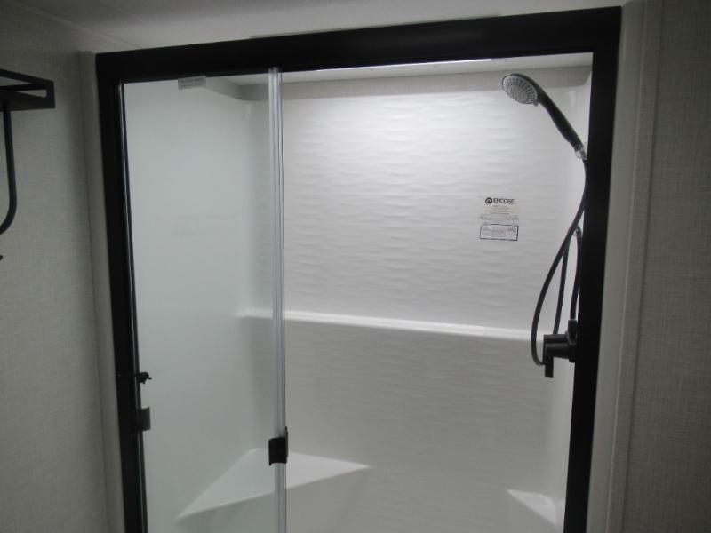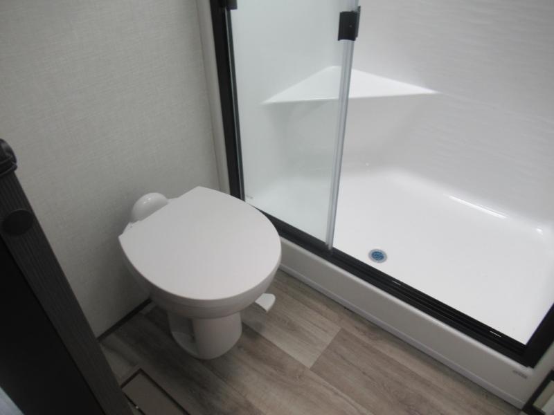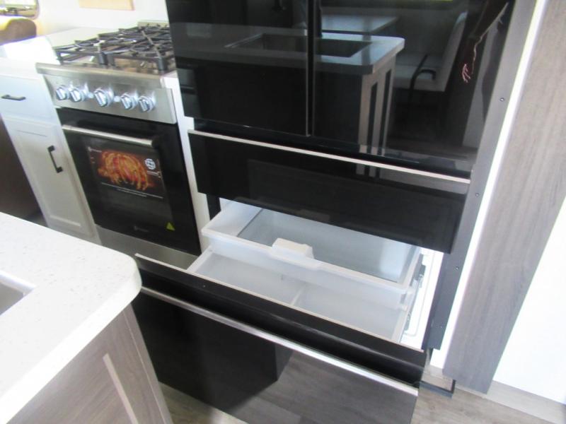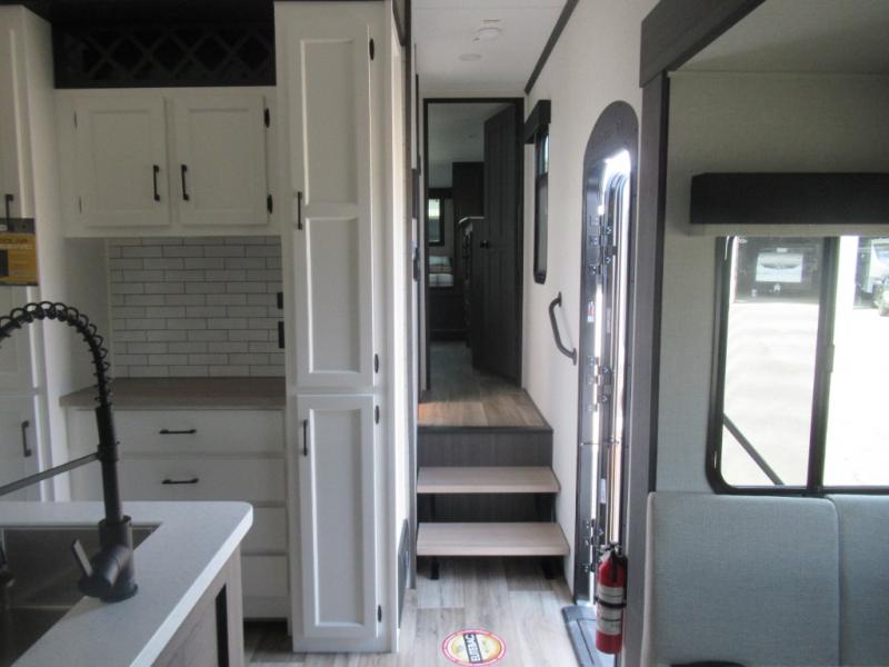 You won't even feel like you're camping in this fifth wheel! The front private bedroom has a Serta king mattress to lay your head on at night, a window seat to comfortably read a book while enjoying the 5,000 BTU fireplace, a shelf storage closet, and a prepped area for a washer and dryer. Freshen up each morning with the 48" fiberglass shower in the full bathroom then head down the floating steps with shoe storage to whip up a delicious breakfast. The fully equipped kitchen even comes with a 18" GE stainless steel dishwasher at the kitchen island for easy clean up. Enjoy your meals at the table with two chairs and two Versa benches. You could even cook at the outside campfire cafe with the griddle. Inside the rear living area, you will find a 70" tri-fold sofa with end tables and theater seating with USB charging across from the entertainment center with a 5,000 BTU fireplace!