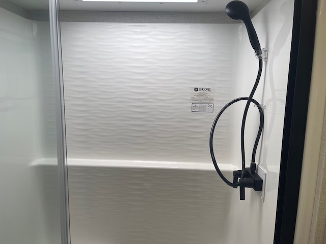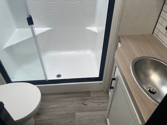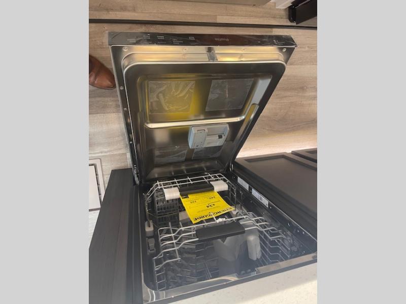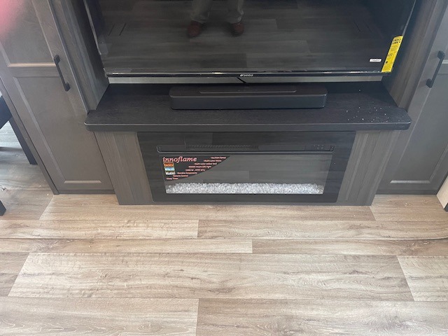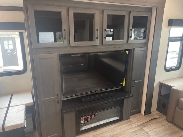 You won't even feel like you're camping in this fifth wheel! The front private bedroom has a Serta king mattress to lay your head on at night, a window seat to comfortably read a book while enjoying the 5,000 BTU fireplace, a shelf storage closet, and a prepped area for a washer and dryer. Freshen up each morning with the 48" fiberglass shower in the full bathroom then head down the floating steps with shoe storage to whip up a delicious breakfast. The fully equipped kitchen even comes with a 18" GE stainless steel dishwasher at the kitchen island for easy clean up. Enjoy your meals at the table with two chairs and two Versa benches. You could even cook at the outside campfire cafe with the griddle. Inside the rear living area, you will find a 70" tri-fold sofa with end tables and theater seating with USB charging across from the entertainment center with a 5,000 BTU fireplace!