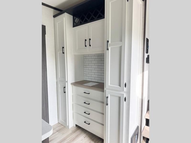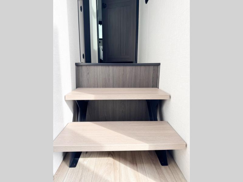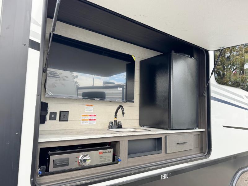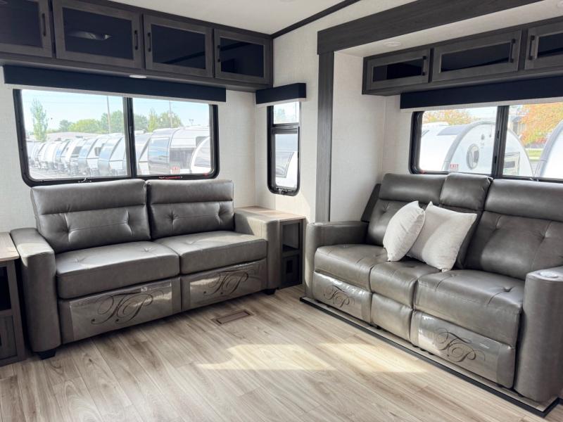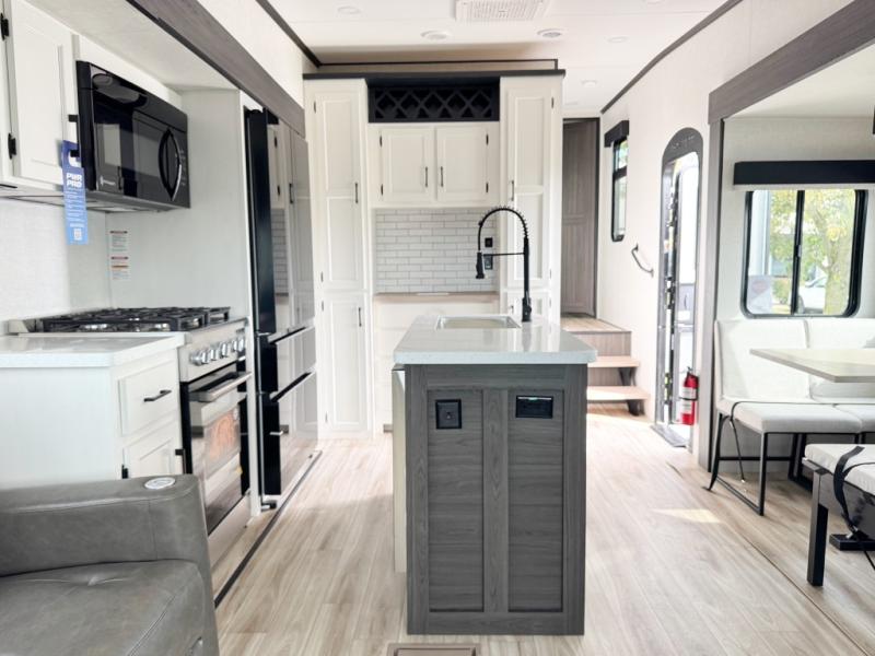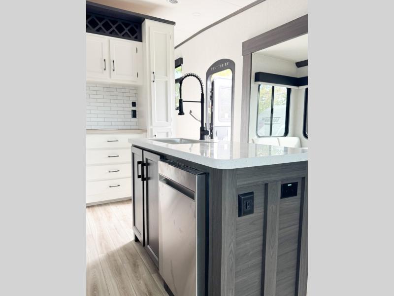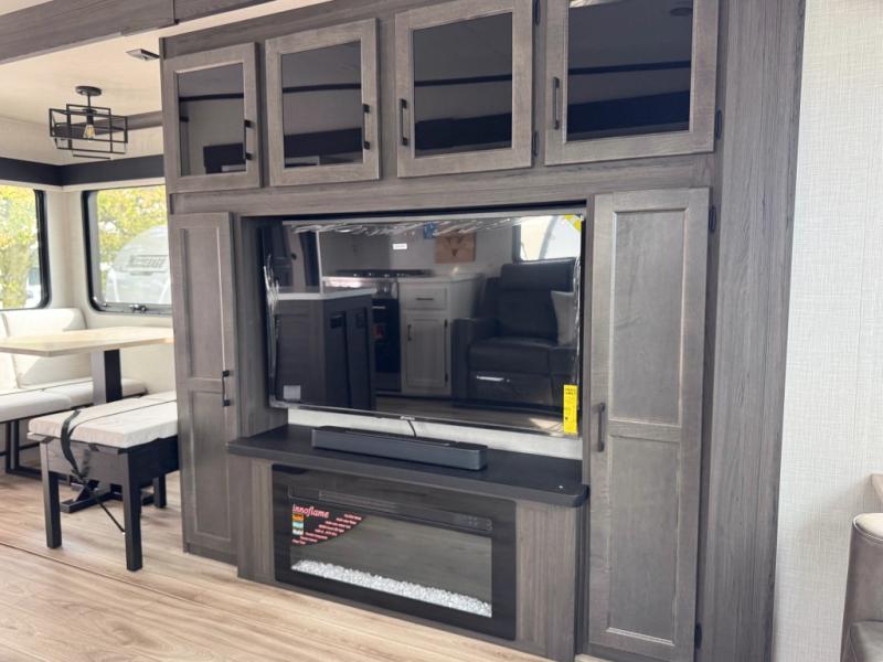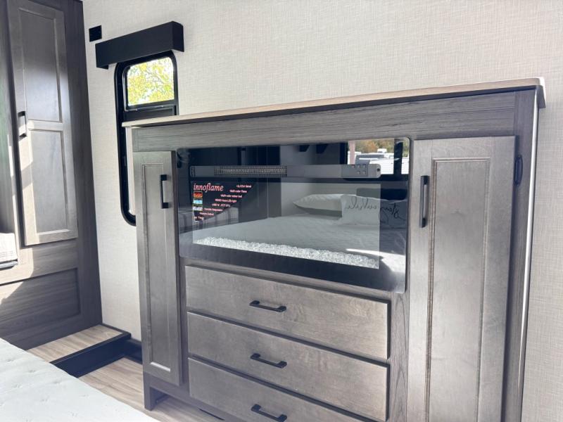 You won't even feel like you're camping in this fifth wheel! The front private bedroom has a Serta king mattress to lay your head on at night, a window seat to comfortably read a book while enjoying the 5,000 BTU fireplace, a shelf storage closet, and a prepped area for a washer and dryer. Freshen up each morning with the 48" fiberglass shower in the full bathroom then head down the floating steps with shoe storage to whip up a delicious breakfast. The fully equipped kitchen even comes with a 18" GE stainless steel dishwasher at the kitchen island for easy clean up. Enjoy your meals at the table with two chairs and two Versa benches. You could even cook at the outside campfire cafe with the griddle. Inside the rear living area, you will find a 70" tri-fold sofa with end tables and theater seating with USB charging across from the entertainment center with a 5,000 BTU fireplace!