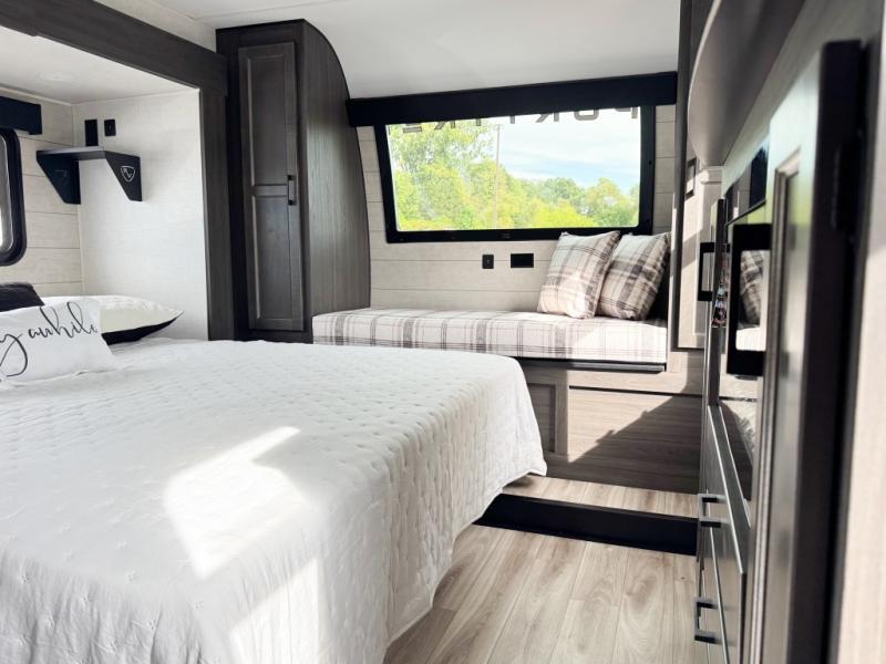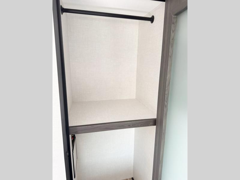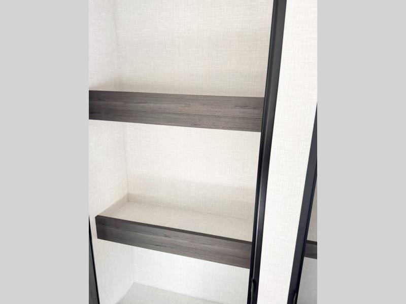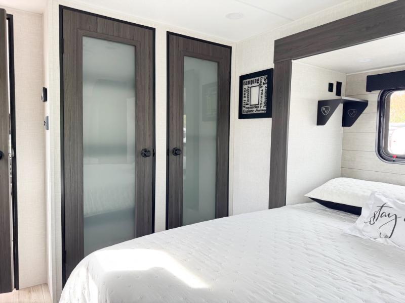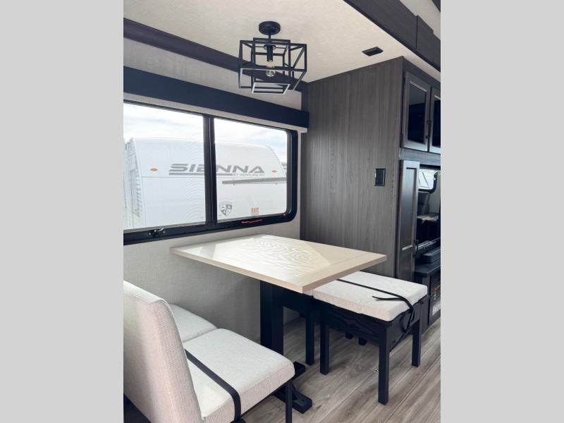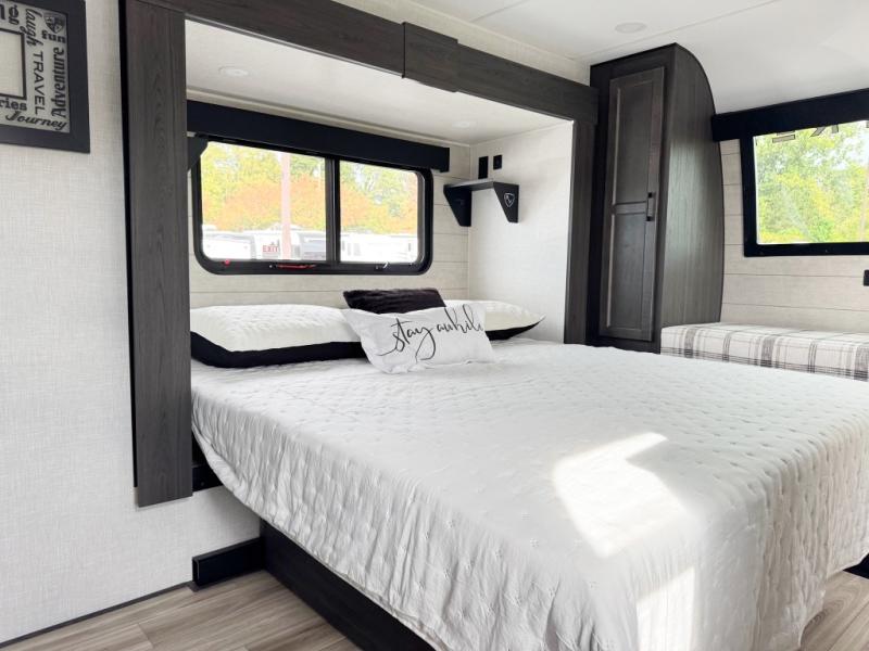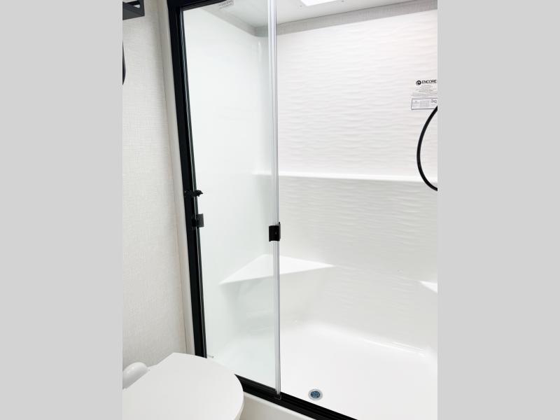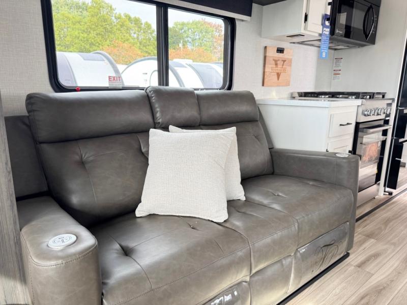 You won't even feel like you're camping in this fifth wheel! The front private bedroom has a Serta king mattress to lay your head on at night, a window seat to comfortably read a book while enjoying the 5,000 BTU fireplace, a shelf storage closet, and a prepped area for a washer and dryer. Freshen up each morning with the 48" fiberglass shower in the full bathroom then head down the floating steps with shoe storage to whip up a delicious breakfast. The fully equipped kitchen even comes with a 18" GE stainless steel dishwasher at the kitchen island for easy clean up. Enjoy your meals at the table with two chairs and two Versa benches. You could even cook at the outside campfire cafe with the griddle. Inside the rear living area, you will find a 70" tri-fold sofa with end tables and theater seating with USB charging across from the entertainment center with a 5,000 BTU fireplace!