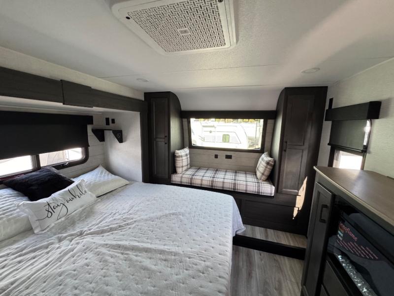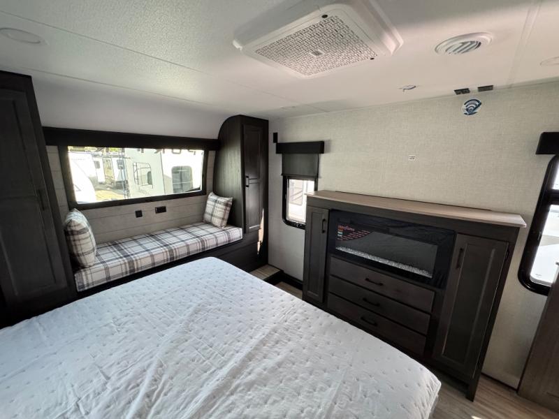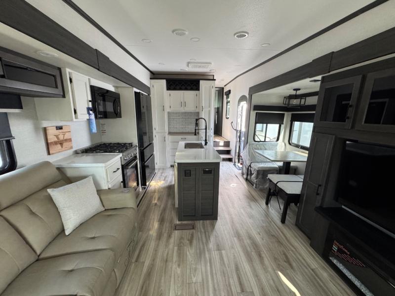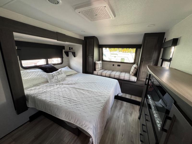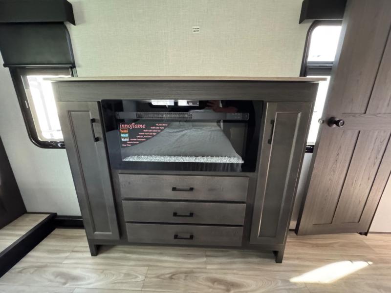 You won't even feel like you're camping in this fifth wheel! The front private bedroom has a Serta king mattress to lay your head on at night, a window seat to comfortably read a book while enjoying the 5,000 BTU fireplace, a shelf storage closet, and a prepped area for a washer and dryer. Freshen up each morning with the 48" fiberglass shower in the full bathroom then head down the floating steps with shoe storage to whip up a delicious breakfast. The fully equipped kitchen even comes with a 18" GE stainless steel dishwasher at the kitchen island for easy clean up. Enjoy your meals at the table with two chairs and two Versa benches. You could even cook at the outside campfire cafe with the griddle. Inside the rear living area, you will find a 70" tri-fold sofa with end tables and theater seating with USB charging across from the entertainment center with a 5,000 BTU fireplace!