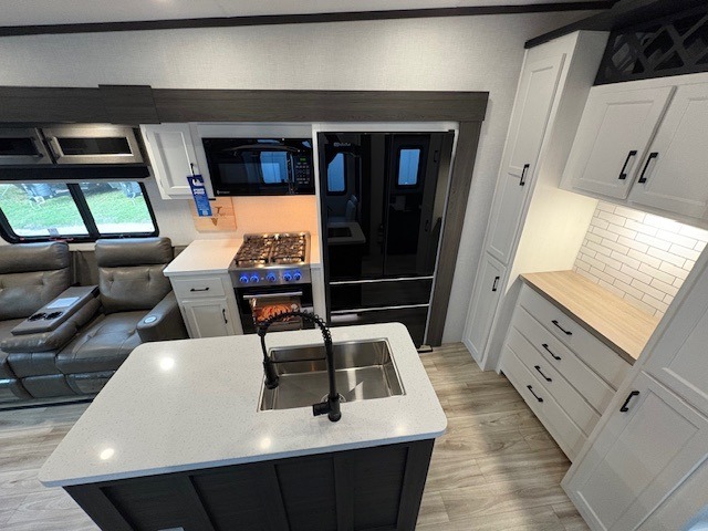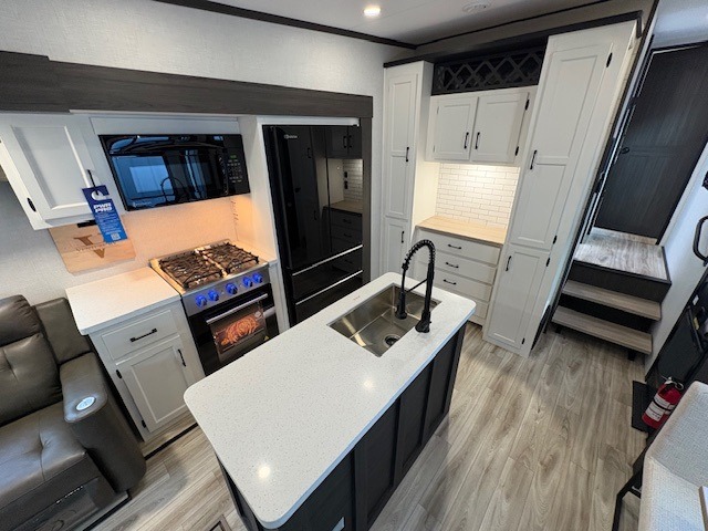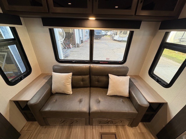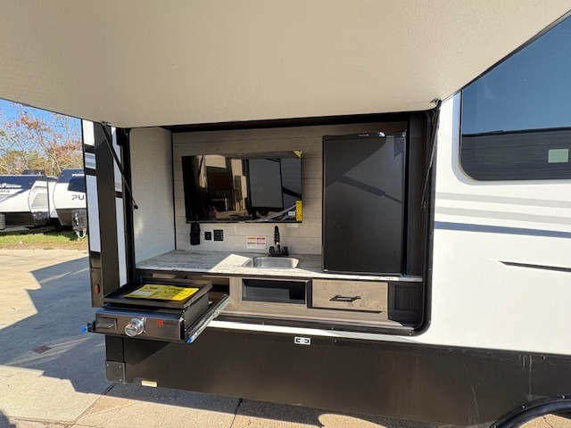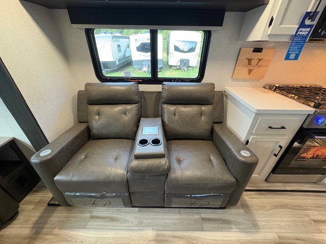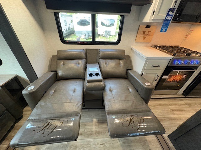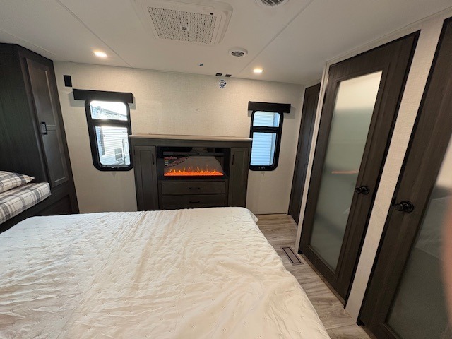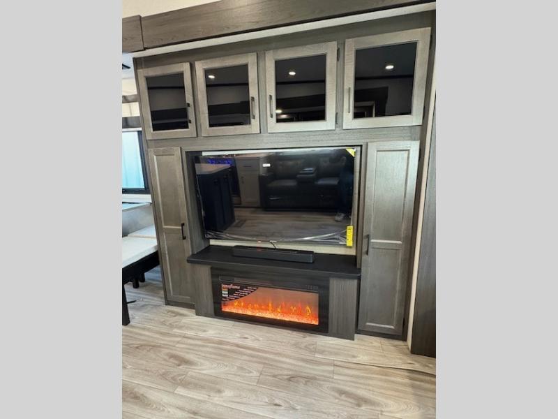 You won't even feel like you're camping in this fifth wheel! The front private bedroom has a Serta king mattress to lay your head on at night, a window seat to comfortably read a book while enjoying the 5,000 BTU fireplace, a shelf storage closet, and a prepped area for a washer and dryer. Freshen up each morning with the 48" fiberglass shower in the full bathroom then head down the floating steps with shoe storage to whip up a delicious breakfast. The fully equipped kitchen even comes with a 18" GE stainless steel dishwasher at the kitchen island for easy clean up. Enjoy your meals at the table with two chairs and two Versa benches. You could even cook at the outside campfire cafe with the griddle. Inside the rear living area, you will find a 70" tri-fold sofa with end tables and theater seating with USB charging across from the entertainment center with a 5,000 BTU fireplace!