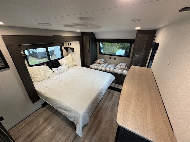 An elegant design and new features come with every one of these Venture RV SportTrek Touring Edition fifth wheels! The NXG Huck bolt frame holds these units together and Tufflex PVC roofing covers them. Heads will turn down the highway and at the campsite with the frameless tinted windows and high gloss fiberglass front cap with automotive paint. The exterior pass-through storage area has slam latch baggage doors with magnetic catches so you don't have to worry about them closing on you and LED lighting on the electric awning so you can see clearly even at night. Luxury abounds throughout these units, especially with the two fireplaces, solid surface kitchen countertops, blackout roller shades, and maximum storage designs. Come find your favorite model today!