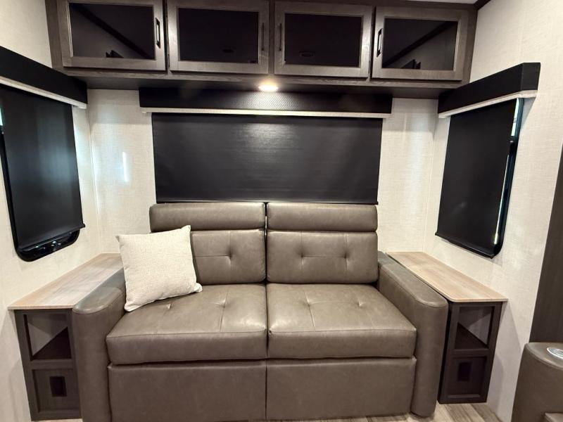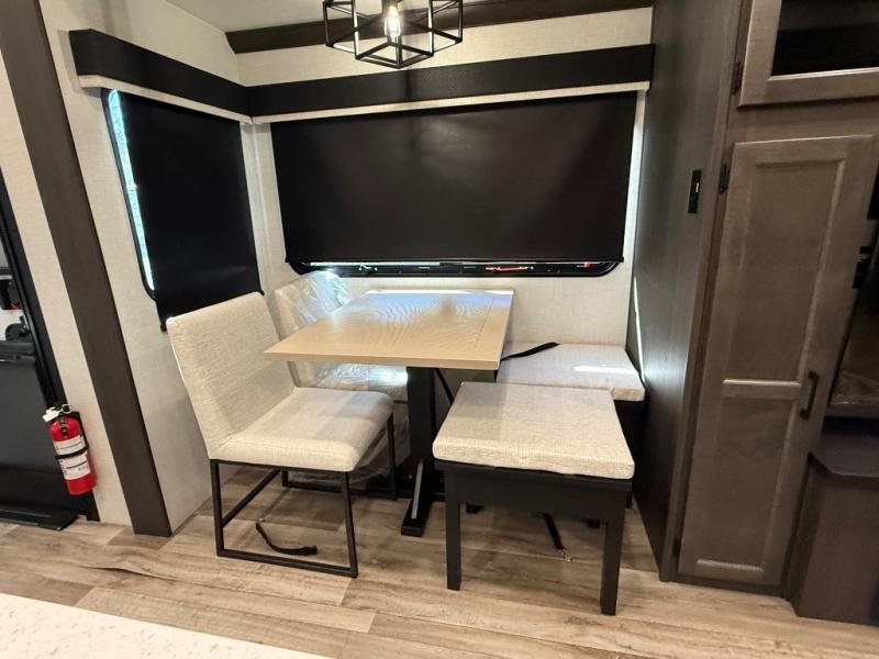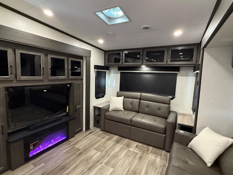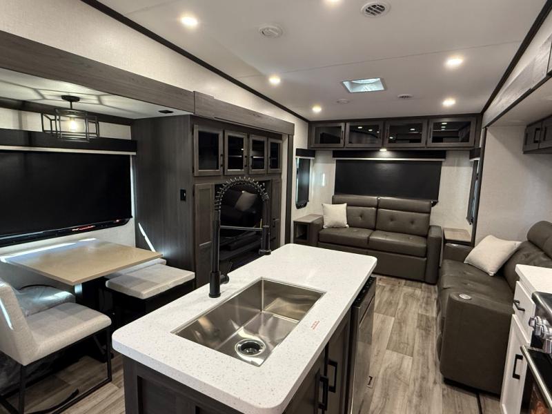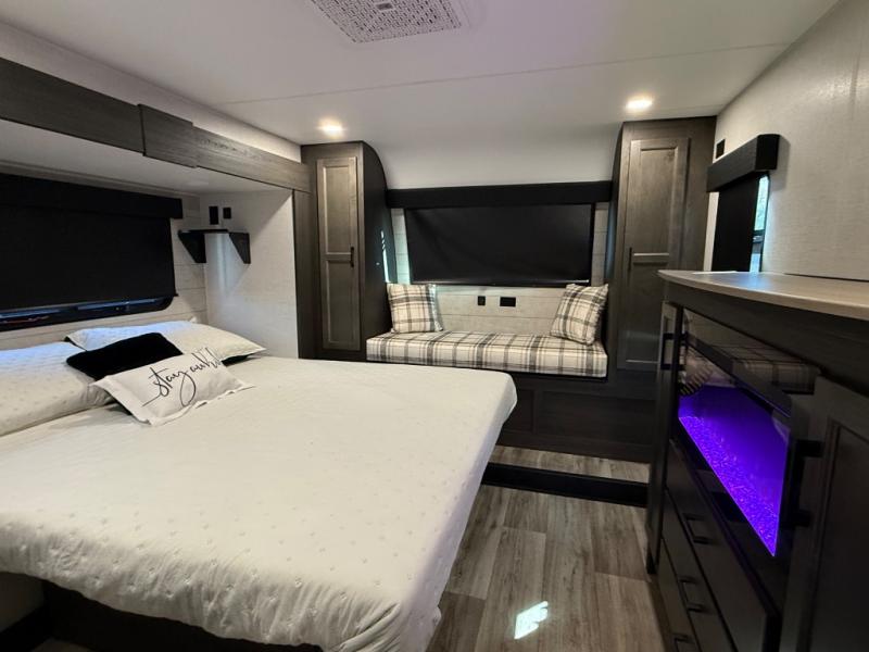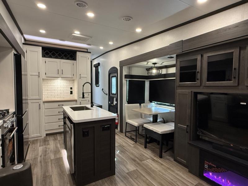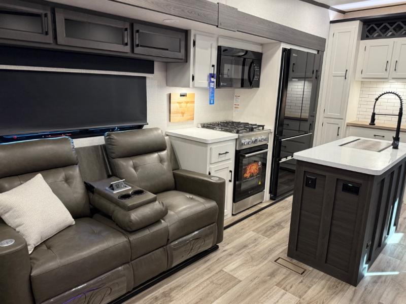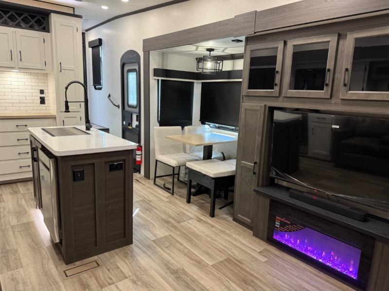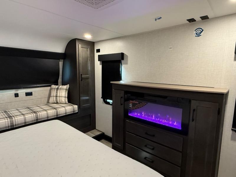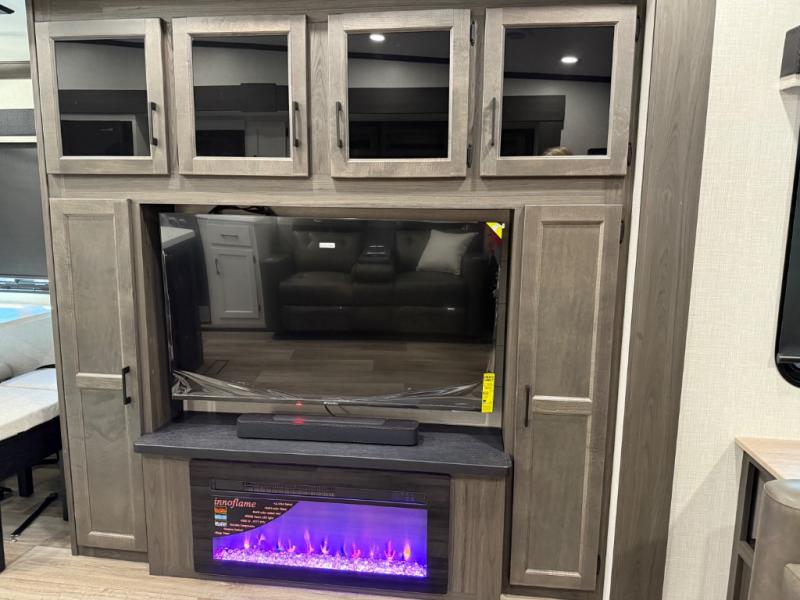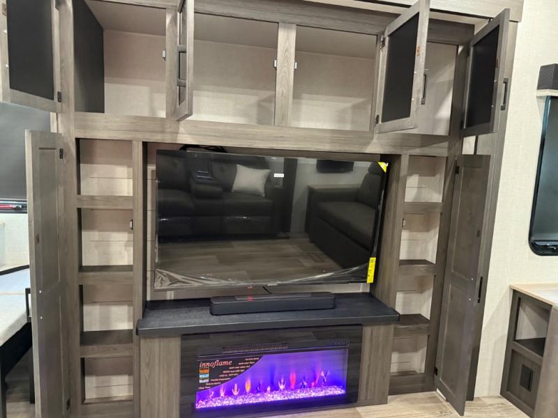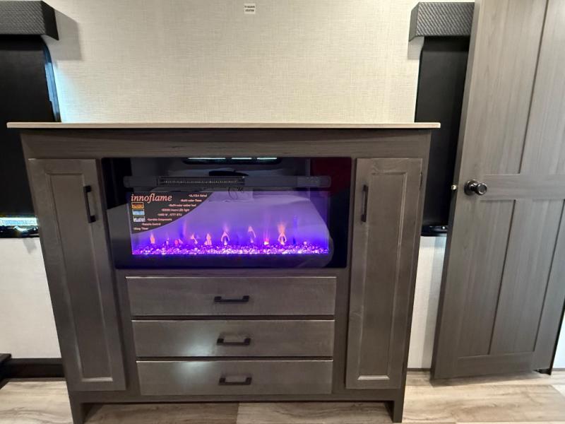 You won't even feel like you're camping in this fifth wheel! The front private king bedroom has a Serta king mattress to lay your head on at night, a window seat to comfortably read a book while enjoying the 5,000 BTU fireplace, a shelf storage closet, and a prepped area for a washer and dryer. Freshen up each morning with the 48" fiberglass shower in the full bathroom then head down the floating steps with shoe storage to whip up a delicious breakfast. The fully equipped kitchen even comes with a 18" GE stainless steel dishwasher at the kitchen island for easy clean up. Enjoy your meals at the table with two chairs and two Versa benches. You could even cook at the outside campfire cafe with the griddle. Inside the rear living area, you will find a 70" tri-fold sofa with end tables and theater seating with USB charging across from the entertainment center with a 5,000 BTU fireplace!