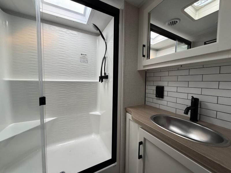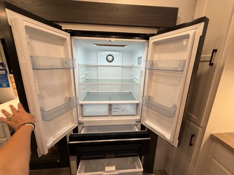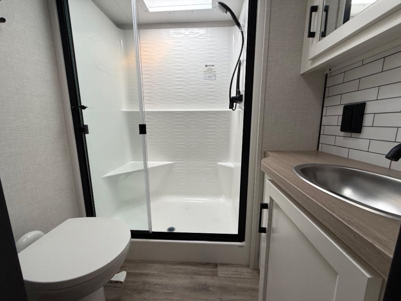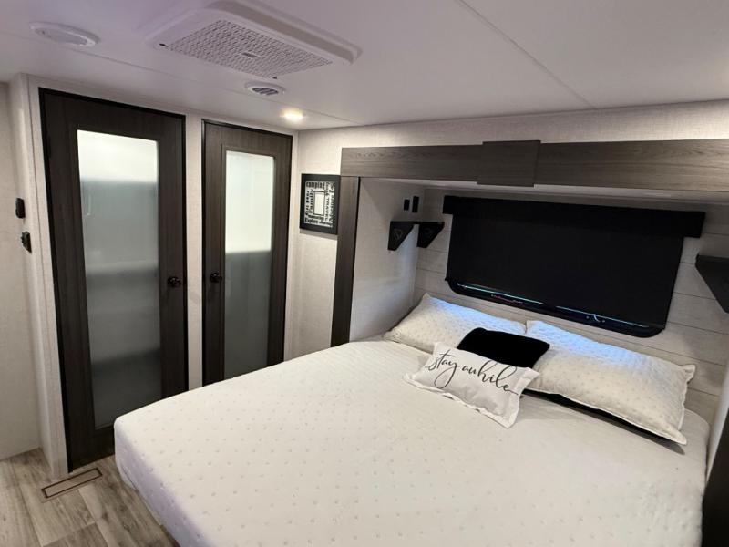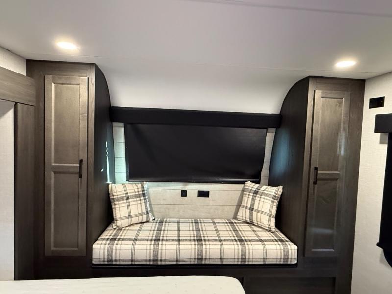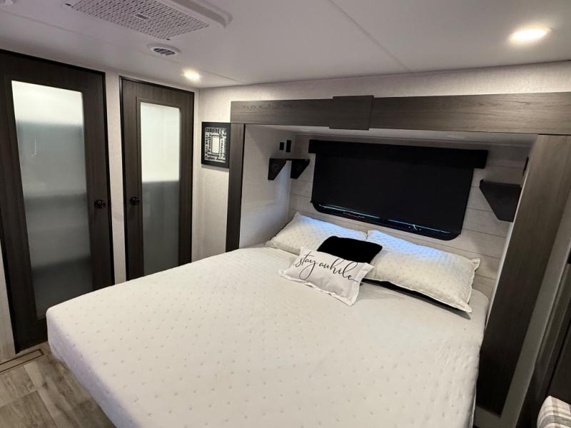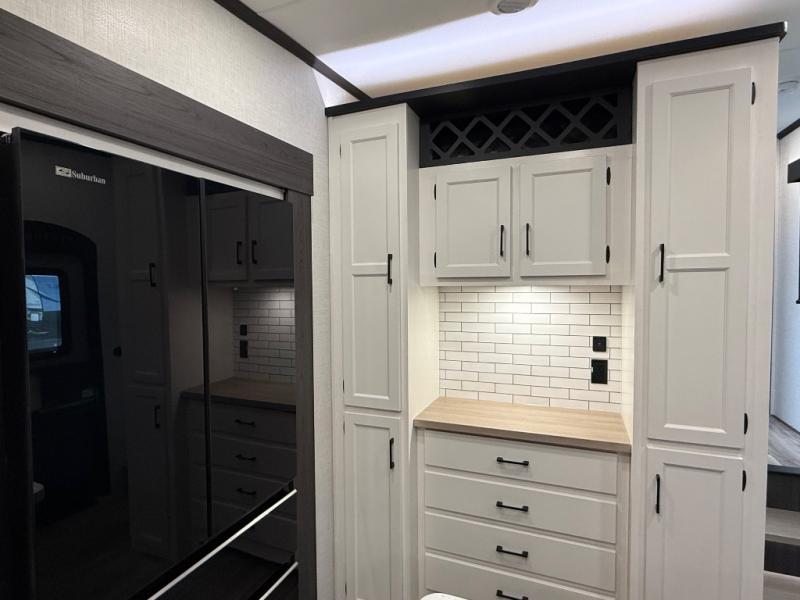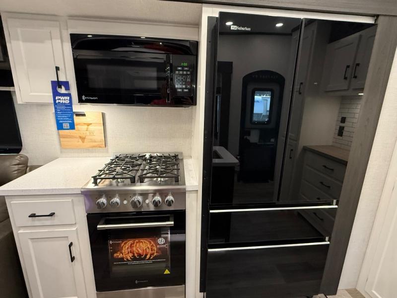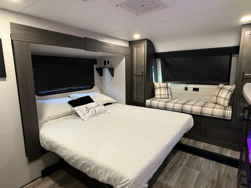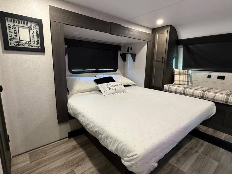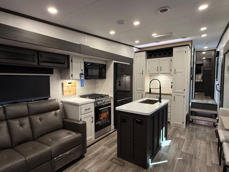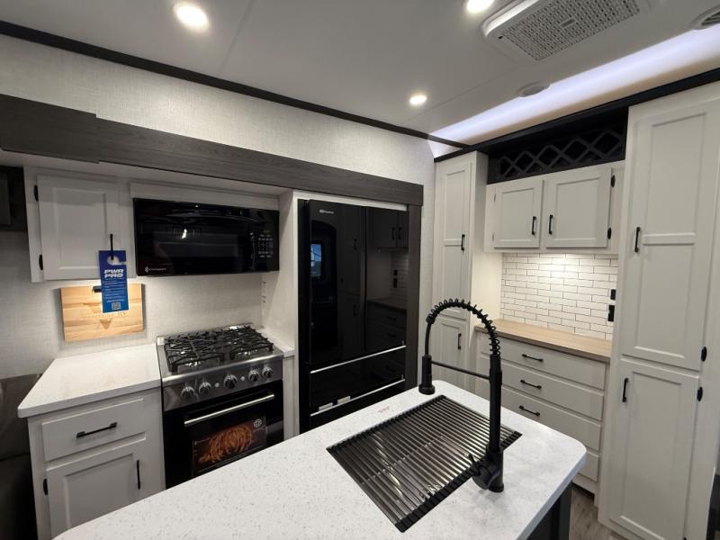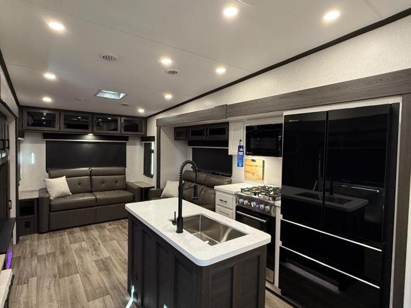 You won't even feel like you're camping in this fifth wheel! The front private king bedroom has a Serta king mattress to lay your head on at night, a window seat to comfortably read a book while enjoying the 5,000 BTU fireplace, a shelf storage closet, and a prepped area for a washer and dryer. Freshen up each morning with the 48" fiberglass shower in the full bathroom then head down the floating steps with shoe storage to whip up a delicious breakfast. The fully equipped kitchen even comes with a 18" GE stainless steel dishwasher at the kitchen island for easy clean up. Enjoy your meals at the table with two chairs and two Versa benches. You could even cook at the outside campfire cafe with the griddle. Inside the rear living area, you will find a 70" tri-fold sofa with end tables and theater seating with USB charging across from the entertainment center with a 5,000 BTU fireplace!