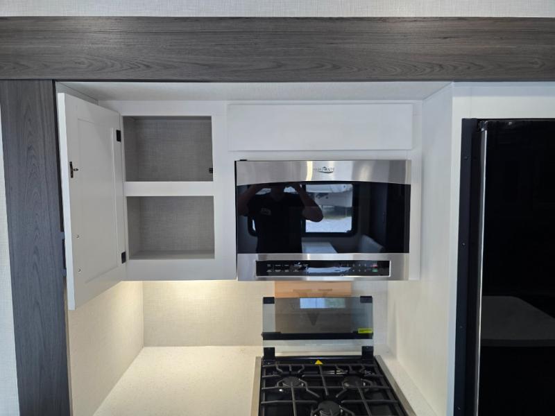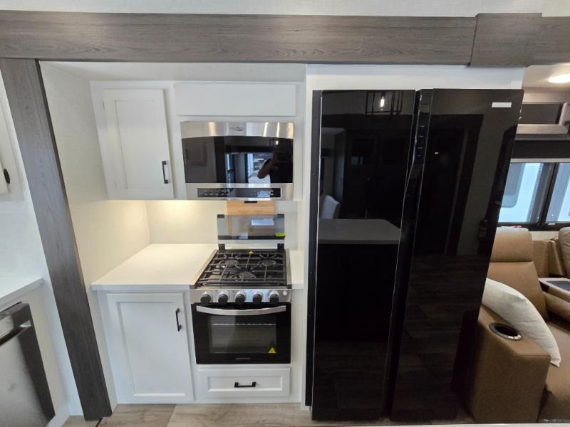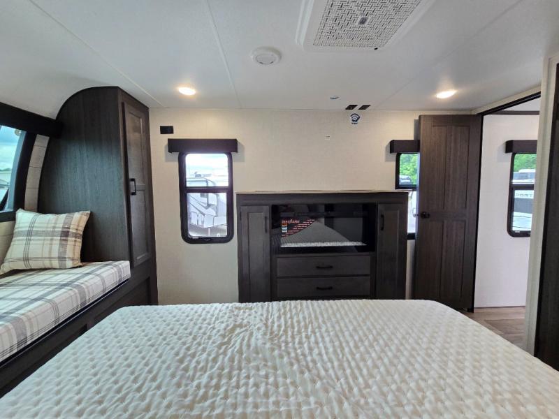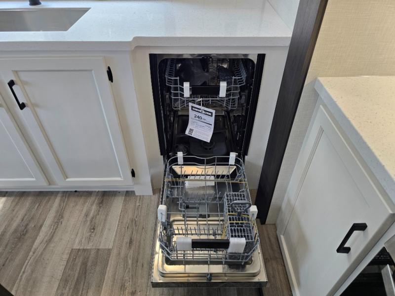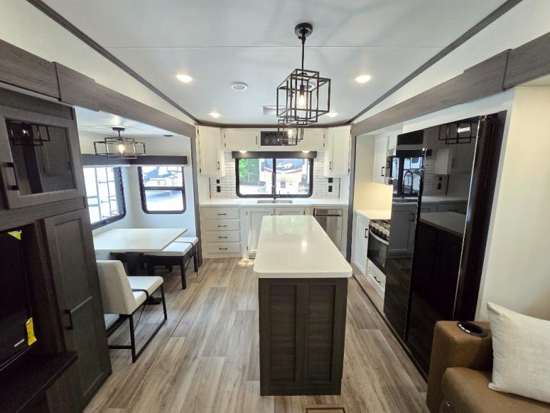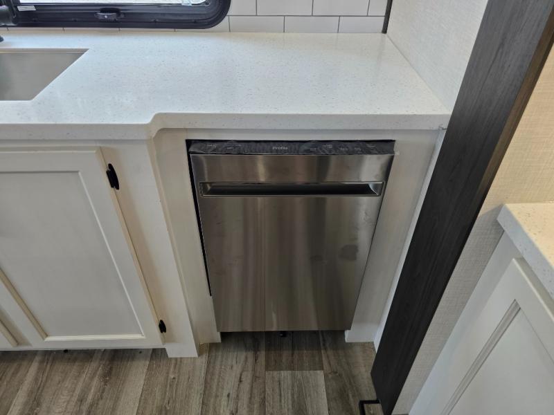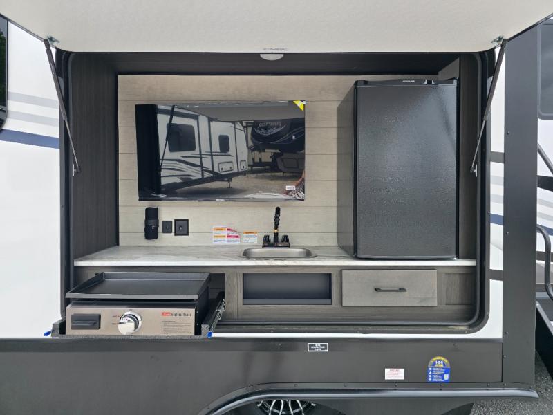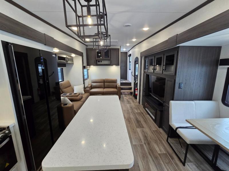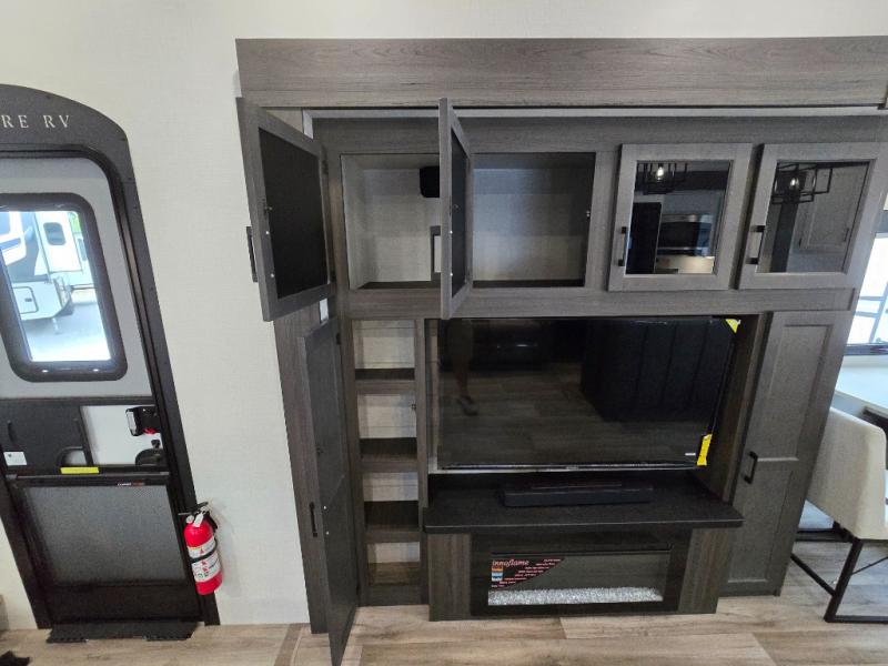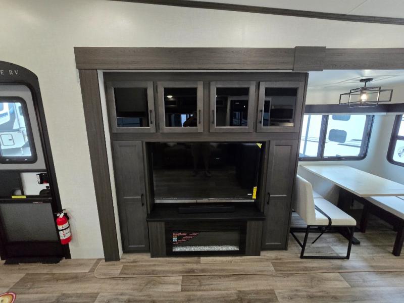 The chef will love cooking in the rear kitchen of this fifth wheel! The front private bedroom has a Serta king mattress to lay your head on at night, a window seat to comfortably read a book while enjoying the 5,000 BTU fireplace, a shelf storage closet, and a prepped area for a washer and dryer. Freshen up each morning with the 48" fiberglass shower with a seat in the full bathroom then head down the floating steps with shoe storage to whip up a delicious breakfast. The fully equipped kitchen even comes with a 18" GE stainless steel dishwasher at the rear sink with countertops on either side for easy clean up. Enjoy your meals at the table with two chairs and two Versa benches. You could even cook at the outside campfire cafe with the griddle. Inside the middle living area, you will find a tri-fold sofa with overhead cabinets and theater seating with USB charging across from the entertainment center with a 5,000 BTU fireplace!
