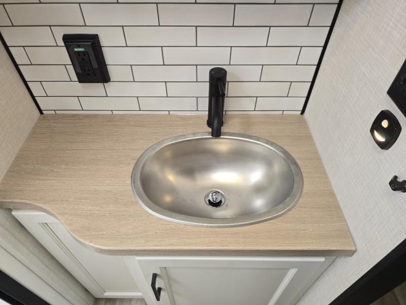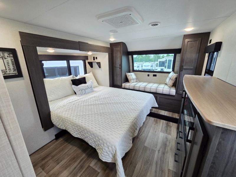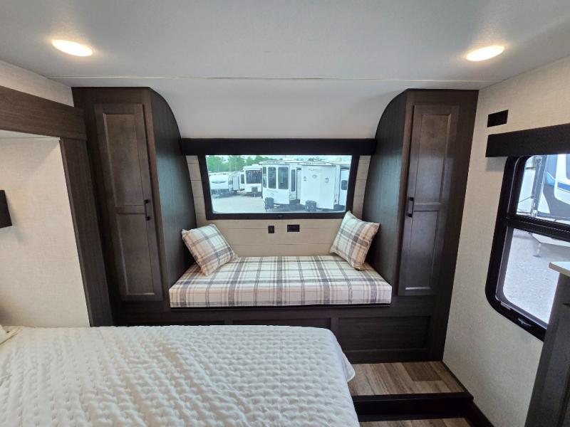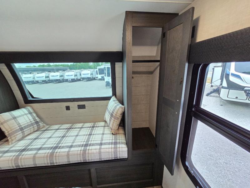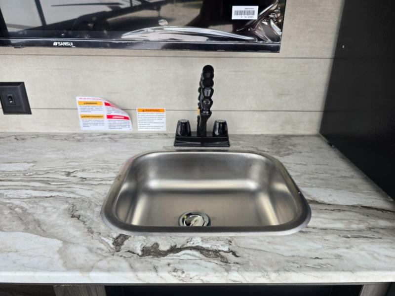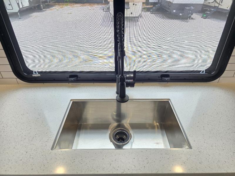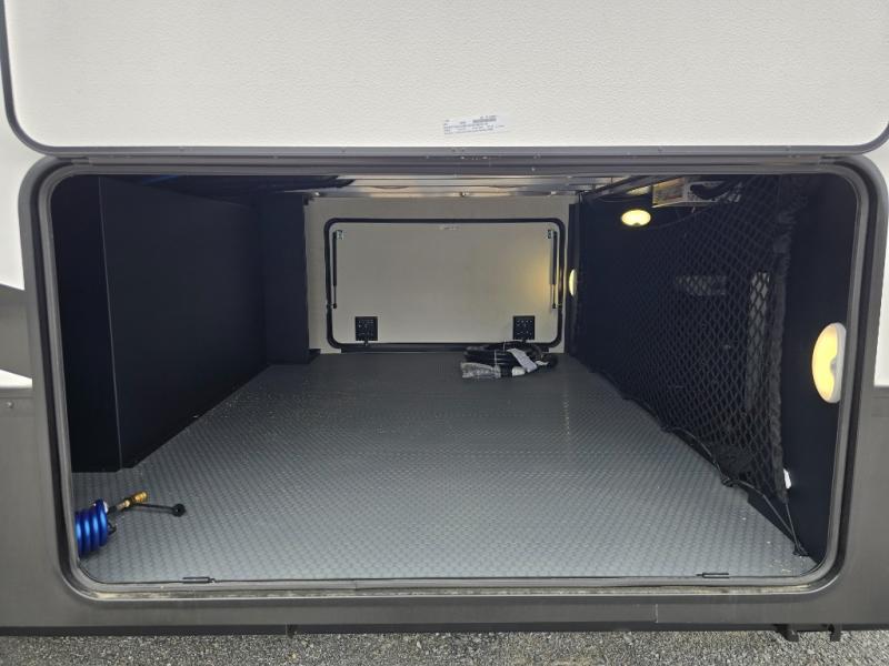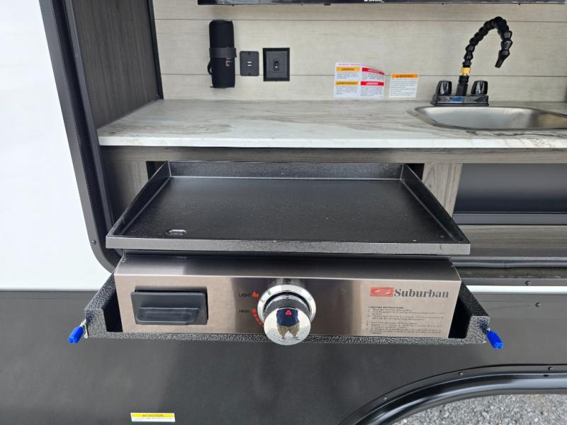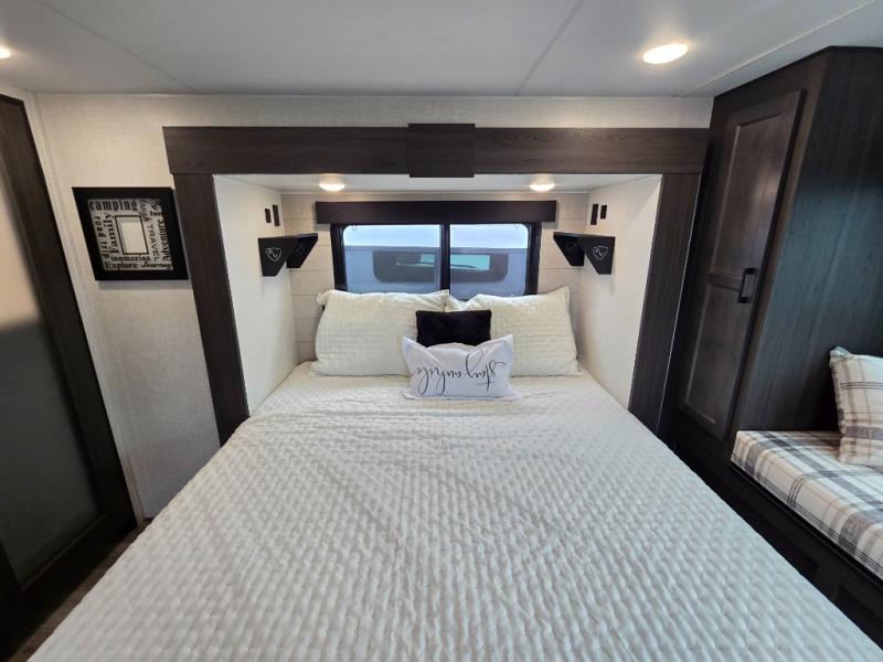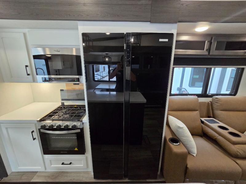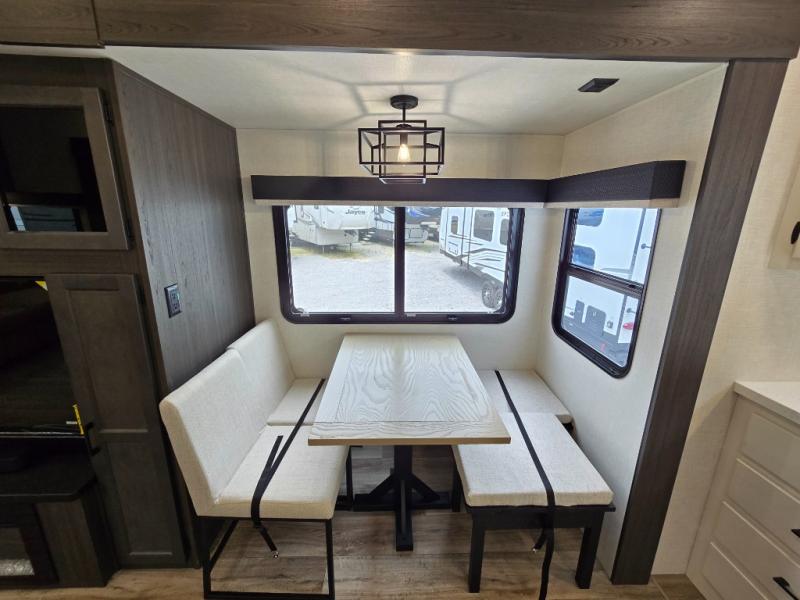 The chef will love cooking in the rear kitchen of this fifth wheel! The front private bedroom has a Serta king mattress to lay your head on at night, a window seat to comfortably read a book while enjoying the 5,000 BTU fireplace, a shelf storage closet, and a prepped area for a washer and dryer. Freshen up each morning with the 48" fiberglass shower with a seat in the full bathroom then head down the floating steps with shoe storage to whip up a delicious breakfast. The fully equipped kitchen even comes with a 18" GE stainless steel dishwasher at the rear sink with countertops on either side for easy clean up. Enjoy your meals at the table with two chairs and two Versa benches. You could even cook at the outside campfire cafe with the griddle. Inside the middle living area, you will find a tri-fold sofa with overhead cabinets and theater seating with USB charging across from the entertainment center with a 5,000 BTU fireplace!