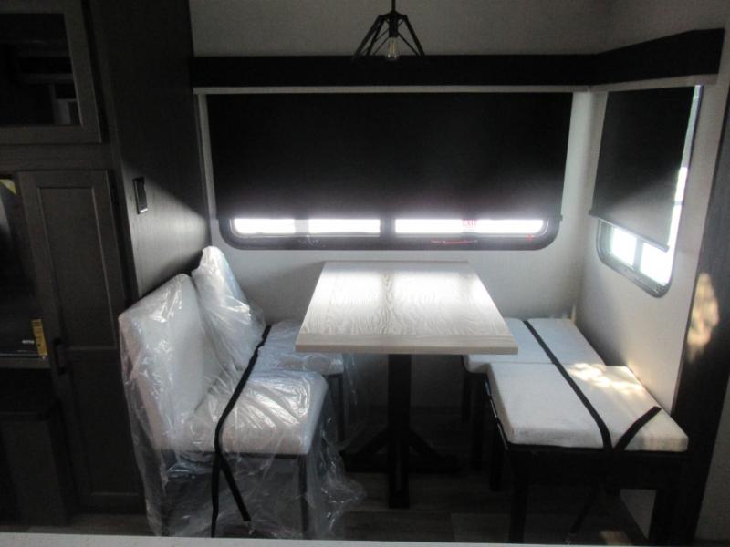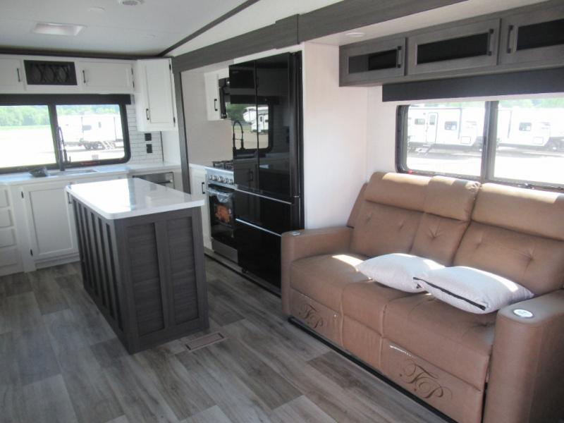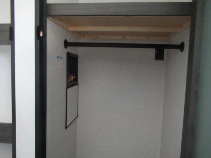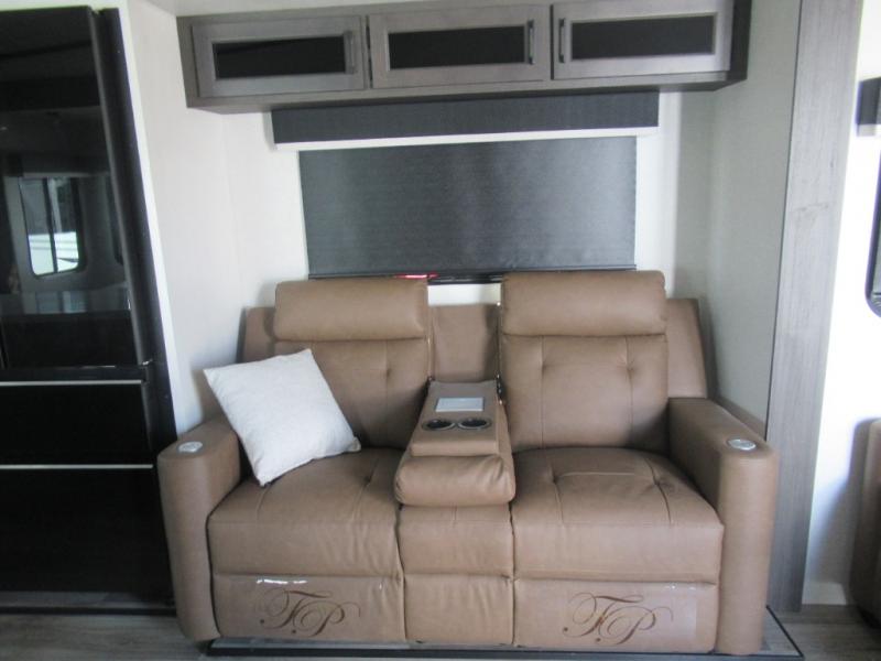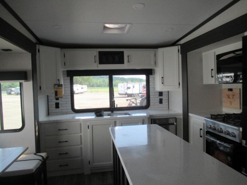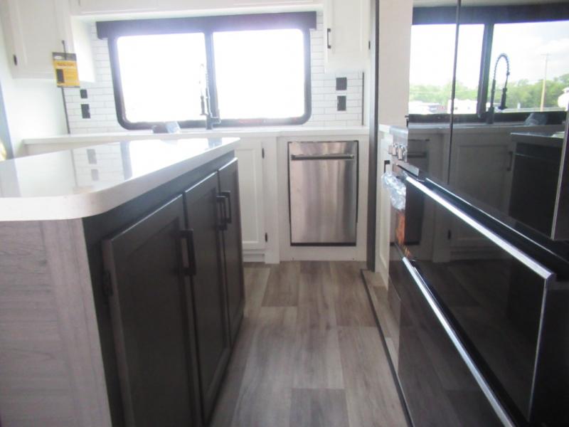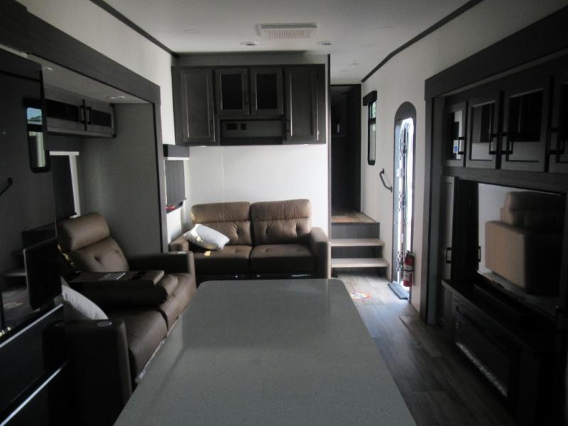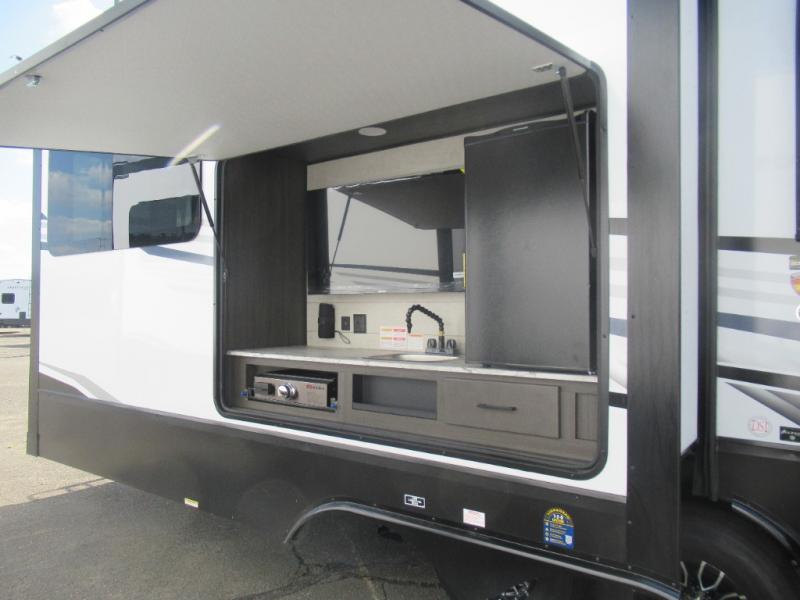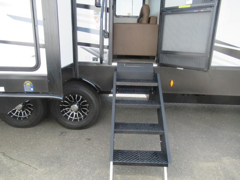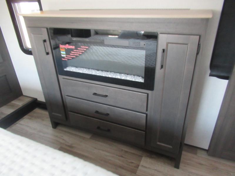 The chef will love cooking in the rear kitchen of this fifth wheel! The front private bedroom has a Serta king mattress to lay your head on at night, a window seat to comfortably read a book while enjoying the 5,000 BTU fireplace, a shelf storage closet, and a prepped area for a washer and dryer. Freshen up each morning with the 48" fiberglass shower with a seat in the full bathroom then head down the floating steps with shoe storage to whip up a delicious breakfast. The fully equipped kitchen even comes with a 18" GE stainless steel dishwasher at the rear sink with countertops on either side for easy clean up. Enjoy your meals at the table with two chairs and two Versa benches. You could even cook at the outside campfire cafe with the griddle. Inside the middle living area, you will find a tri-fold sofa with overhead cabinets and theater seating with USB charging across from the entertainment center with a 5,000 BTU fireplace!