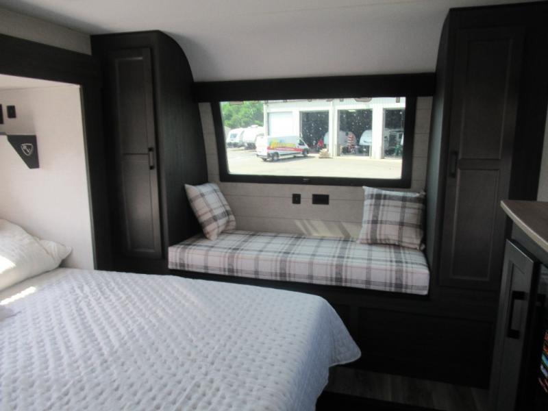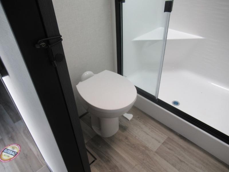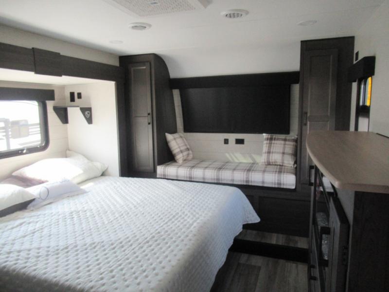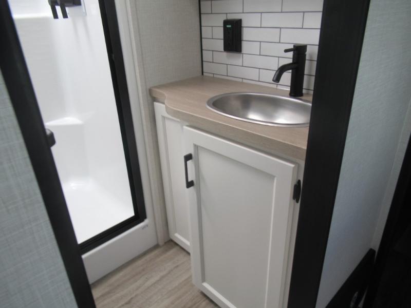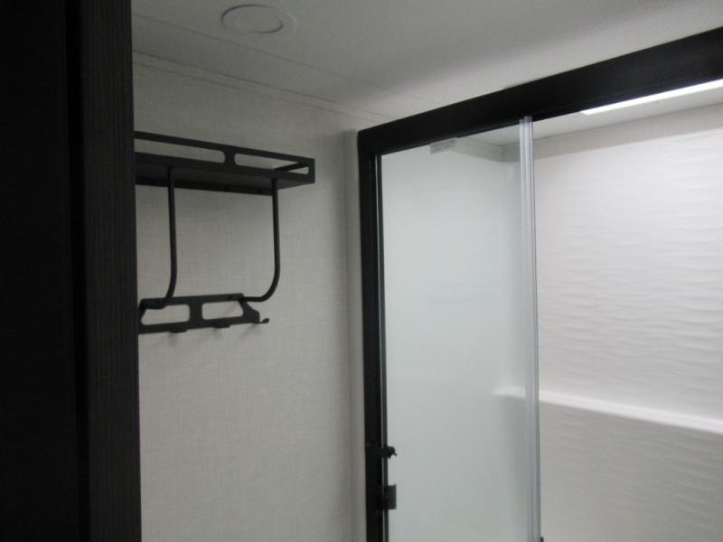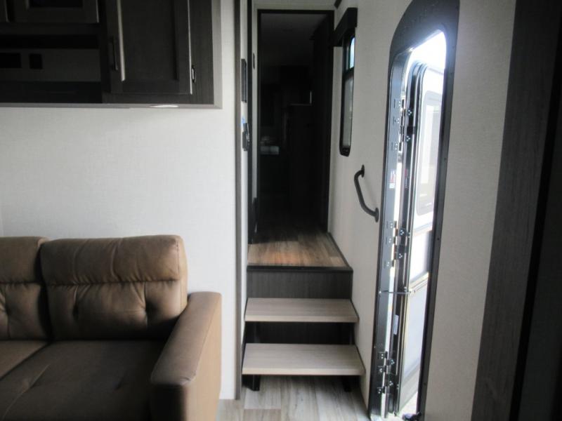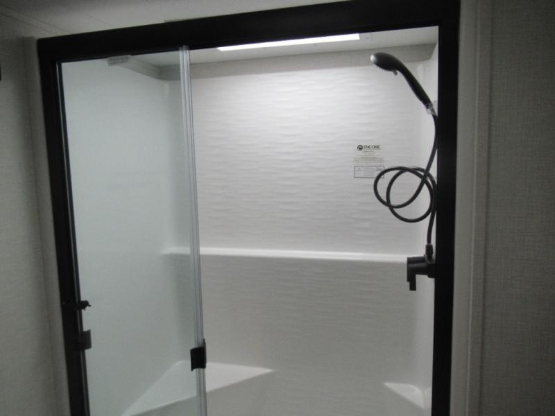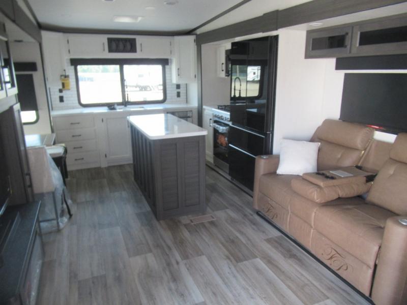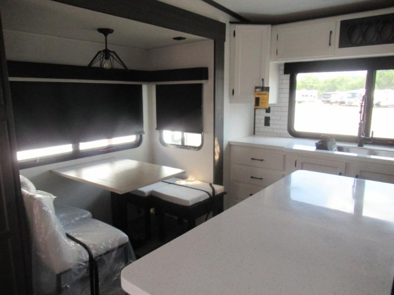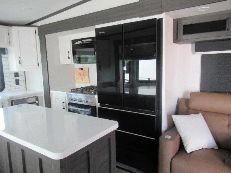 The chef will love cooking in the rear kitchen of this fifth wheel! The front private bedroom has a Serta king mattress to lay your head on at night, a window seat to comfortably read a book while enjoying the 5,000 BTU fireplace, a shelf storage closet, and a prepped area for a washer and dryer. Freshen up each morning with the 48" fiberglass shower with a seat in the full bathroom then head down the floating steps with shoe storage to whip up a delicious breakfast. The fully equipped kitchen even comes with a 18" GE stainless steel dishwasher at the rear sink with countertops on either side for easy clean up. Enjoy your meals at the table with two chairs and two Versa benches. You could even cook at the outside campfire cafe with the griddle. Inside the middle living area, you will find a tri-fold sofa with overhead cabinets and theater seating with USB charging across from the entertainment center with a 5,000 BTU fireplace!